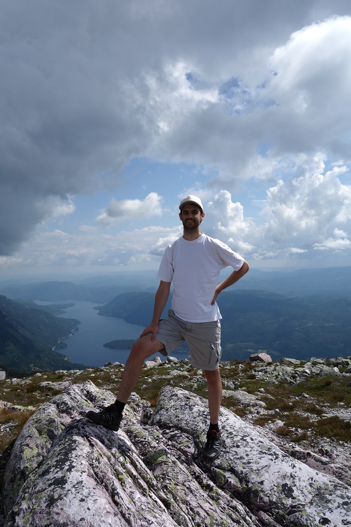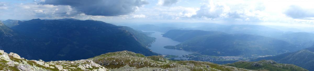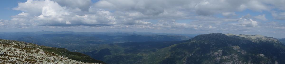 Planla en siste fjelltur med kjæresten før vi skal til Rhodos. Sjekket værmeldingen dagen før og det var meldt regn, lyn og torden. Sjekket på nytt når jeg våknet og da så det ihvertfall litt lysere ut, med muligheter for ettermiddagsbyger. Fikk lurt kjæresten opp av senga og inn i bak rattet på bilen, så bar det på E134 til Seljord. Derfra tok vi opp Gulnesvegen før vi tok av til høyre mot Haugan hvor det er en liten parkeringsplass rett før en kjerrevei som visstnok skulle ta oss opp av dalen. Stien er godt merket og lett å følge helt til toppen av Skorvetoppen - eller ser det ut til, Gøysen på lokalt. Når vi kjørte opp kunne vi se over til den dalsiden vi skulle opp og det ser plent umulig ut å komme seg opp der. Dalsiden er rimelig bratt, med flere stup, men det var mulig å skimte en grønn stripe i det ene stupet. Det viste seg at det var der de hadde anlagt traktorvei(!). Vi gikk bratt oppover denne kjerreveien som vi delvis fulgte oppover, med noen unntak hvor en godt merket sti tok noen snarveier. Ned til høyre mens vi gikk oppover gikk det ofte resten rett ned, men stort sett så var det skog som gjorde at høydeskrekken min ikke slo til. Det var bare et par steder på kjerreveien hvor det kilte litt, men det var ganske kort og helt trygt. Etter å ha unnagjort kjerreveien og kommet oss opp til Karlstaul, så fortsetter stien gjennom tynn granskog på fin sti videre oppover, men ikke like bratt som tidligere. Etterhvert blir skogen mer glissen og det blir litt myraktig terreng, men når det ikke har regnet på et par uker, så er det bare fint med myr. Mykt og godt underlag. Vel ute av skogen så tok vi oss en liten matpause før vi la ut på de siste 300 høydemetrene. Med 600 unnagjort på halvannen time, så gikk det litt saktere nå, men utsikten ble bedre for hvert skritt. Stien var godt merket, bra lagt i terrenget og uten mye slit var vi snart på toppen. På veien opp fikk vi etterhvert utsikt mot Mælefjell som virkelig ser ut som en steinørken og når vi endelig kom oss opp på toppen (etter bare 2,5 timer), så var utsikten utrolig flott. Kontrasten fra Seljord og country-festivalen der og til utsikten over Lifjell, Mælefjell, Gaustadtoppen og festival-campingen som vi fortsatt kunne se 1,2km under oss (i høydemeter) var utrolig! Det er lenge siden jeg har hatt en så god følelse av å gå på tur som her. Jeg fikk så følelsen av å ha gått rett opp på en kjempe av en topp. Kanskje spesielt morsomt når man har sett flanken dens fra Flatdal (som E134 kjører i bunnen av). Toppen så helt umulig ut, men der satt vi, på toppen i shorts og t-skjorte og koste oss i solen med en matbit. Mens vi var på toppen så vi en svær mørkegrå sky komme sigende over Lifjell. Mon tro om det skulle begynne å regne? Vel, det gjorde det, over Seljord. Det smalt godt oppe i fjellet mens det tordnet i vei, i god stereo, men hele tiden 2-3 kilometer unna. Faktisk slapp vi helt unna regnet, selv om nederste del av stien hadde fått litt vann mens vi var på toppen. Flaks. Bildene under er tatt av Martine Grymyr, med unntak av bildet av henne, som jeg har tatt. Kameraet, Sony RX100 kan anbefales på det varmeste. Lite nok til at det kommer til å bli med på alle fjellturene framover, og på mange områder svært nærme et svært speilreflekskamera.