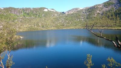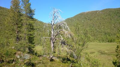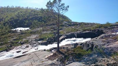16. Etter en lang vinter var tiden inne for et gjensyn med isfrie fjellvann. Kalenderen viste 5. juli og gradestokken som står i skyggen av huset vartet opp med hele 28 grader. Egentlig hadde jeg ingen planer om å dra til fjells denne dagen. Kleggen var ilter og egentlig var det alt for varmt å gå for en som er vant til at det er noe kjøligere vær på våre breddegrader. Nok sagt! Eventyrlysten overvant fornuften og med den utprintede sommerpakklista i hånden begynte jeg å raske sammen utstyr som jeg hadde arkivert vakkert i hyllene på boden gjennom vinteren. Under en time senere satt jeg i bilen på vei mot startstedet. Vel framme parkerte jeg bilen og begynte å gå innover. Første delen av denne turen som jeg har gått mange ganger før har ganske flatt terreng. Litt svak stigning enkelte steder før man kommer til en foss. Her stoppet jeg for å drikke og fylle vannflaska som jeg allerede hadde tømt. Det brusende vannet virket kjølende i varmen og jeg satte meg ned her en stund før jeg fortsatte å gå. Ti minutter senere var jeg oppe der fossen startet. Jeg satte meg likegodt en liten stund her også for å beundre utsikten. Her ble jeg imidlertid ikke sittende lenge, for nå var det ikke langt igjen til det første vannet som jeg hadde tenkt å fiske i og hvor jeg også hadde tenkt å slå opp teltet for natta. Røyevann.. Sist jeg var her for noen år siden fikk jeg to stykker som begge var over kiloen, men det var da... En og en halv time etter at jeg forlot bilen kom jeg fram til vannet, en halv time mer enn jeg brukte forrige gang kunne jeg erindre. Jeg skyldte på varmen og den uvanlige gangen som skyldes innpåsliten klegg. Vel, jeg var iallefall framme og teltet kom opp veldig raskt. Teltplassen jeg valgte lå ved en liten bekk med smeltevann som kom ned fra fjellet. Her tenkte jeg det kunne være lurt å prøve for det var nok noen uker siden isen gikk på dette vannet, og røya er som kjent vanskelig å ha med å gjøre når vannet blir for varmt. Jeg fisket hele kvelden uten hell. Det var veldig dødt i vannet med unntak av et par fine vak som holdt motet oppe. Til slutt måtte jeg imidlertid innse at det var nyttesløst denne kvelden så jeg samlet istedet sammen noe ved og tente opp et bål. Et par pølser ble grillet før jeg krabbet inn i teltet for å sove. Jeg våknet etter 5 timer og sjekket klokka. Den var seks og jeg tenkte at nå kunne det være lurt å prøve etter røya igjen. Jeg har jo litt erfaring med at den kan bite tidlig om morgenen så jeg rigget stanga og slengte avgårde en blank spinner. Med det samme jeg begynte å sveive inn så jeg en plog som kom etter og et par sekunder senere innhentet den spinneren. Et plask, spinneren i været, fisken borte og så ble det stille. Dette var eneste kontakten jeg hadde med fisk i dette vannet. Etter å ha fisket i et par timer trasket jeg videre mot neste vann. Utsikt mot det første vannet hvor jeg overnattet. Resten av dagen ble en heftig kamp mot varmen og kleggen som tydeligvis hadde fått forsterkninger. Jeg fisket i tre vann til som jeg har hørt motstridende meldinger om hva angår fiskebestand. Noen sier de er tomme, men andre påstår at der er stor fisk i disse vannene. Jeg så ikke livstegn i noen av dem, men jeg fikk tatt noen bilder før jeg måtte rømme ned fra fjellet. Syns det er merkelig om disse vannene er tomme, men det tenker jeg å finne ut av i løpet av sommeren. Spennende! På vei ned tok jeg disse bildene: Dette facinerte meg. Furua har nesten ikke jord å stå i, og så er det denne steinbroa i bakgrunnen. Nærbilde av furua Nærbilde av steinbroa Og til slutt dette bildet av en gammel kjempe som antakelig er flere hundre år gammel. I Ånderdalen nasjonalpark som ligger ganske nært er det eksemplarer av kystfuru som er over 500 år gamle. I skrivende stund er kleggen så og si borte og jeg kommer nok til å gå denne turen på nytt i august en gang, men i mellomtiden har jeg planer om flere andre fisketurer hvis tiden strekker til. Ønsker alle en fortsatt god sommer!