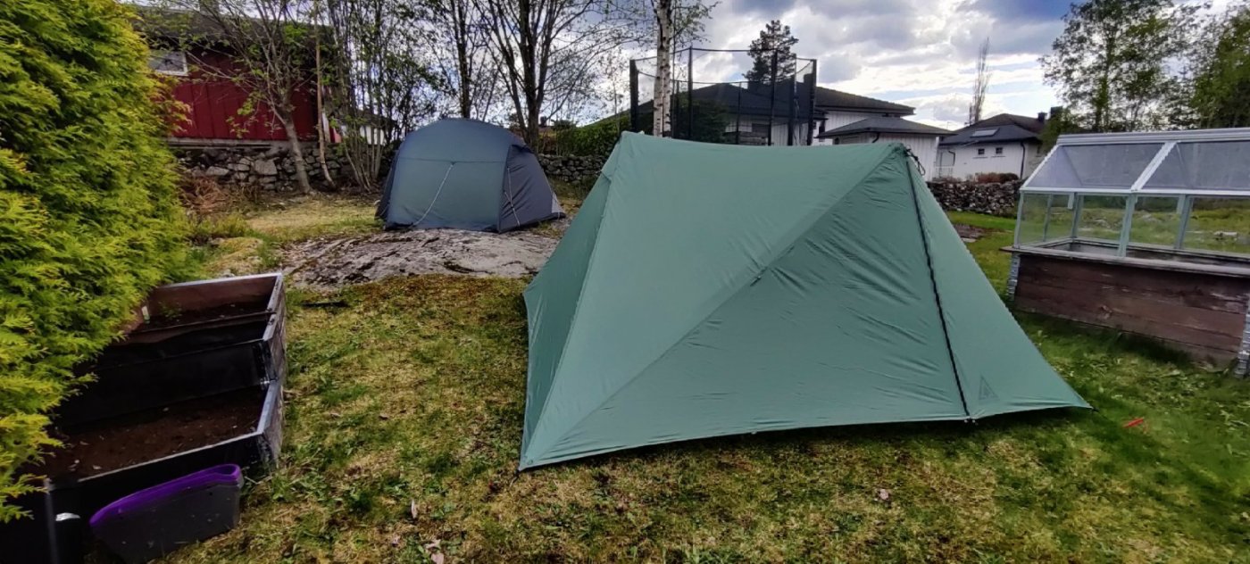 Rengjøring og UV reimpregnering av gammelt Helsport SL Reinsfjell 2p i bakgrunnen. Blitt lekk med sesongene og Storm Surge har ikke blitt helt pent (min feil). Så designeres nå til festival bruk og utlån til 15åringen, sant hvis vi skal et sted med tvil om underlaget. I front testoppsett av nyanskaffelsen Durston solid 2p, som står på veldig skrått underlag akkurat nå. Fargen var en uventet positiv overraskelse, men først og fremst imponert over hvor kort tid vi brukte på å sette det opp, takhøyden og ikke minst vekten. Her kan jeg(1,90) sitte rett i ryggen, og like lett ha det på ryggen med sine 1,1 kg(alt inkludert unntatt stavene jeg går med). Og enda bedre, vesentlig billigere..