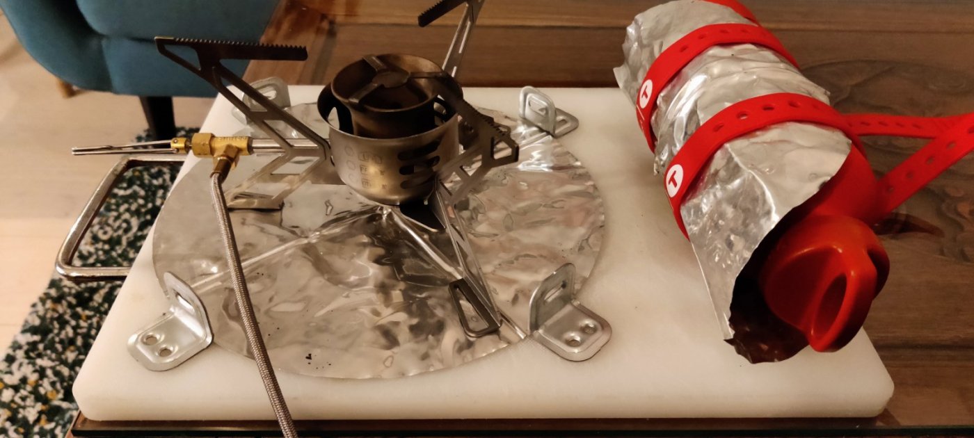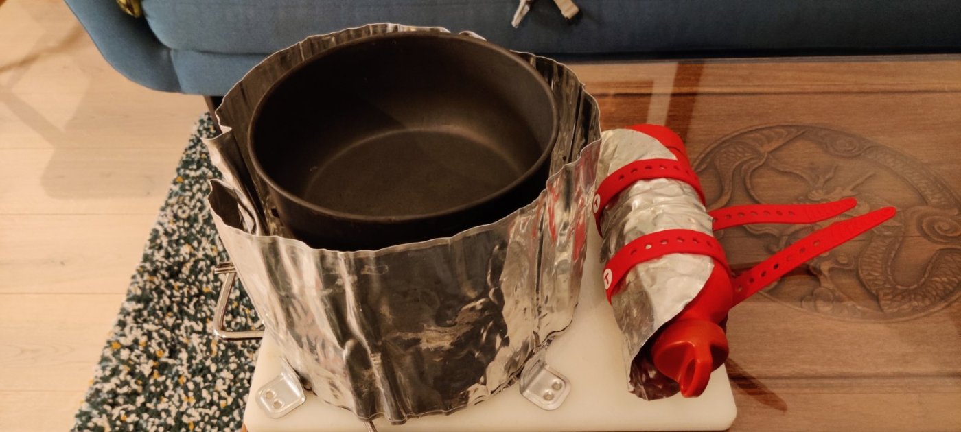 Takk for alle innspill og tips! Har laget en mock up, men usikker på avstand mellom brenner og fuel flaske. Dette får plass i en 40*30*18 boks som sitter fint i pulken. Ville bli brukt med reflektor skjerm, og en til på selve flasken. Håndtaket på brettet fjernes seff, må bare høre hva folk tenker før dama får ny til jul 😛