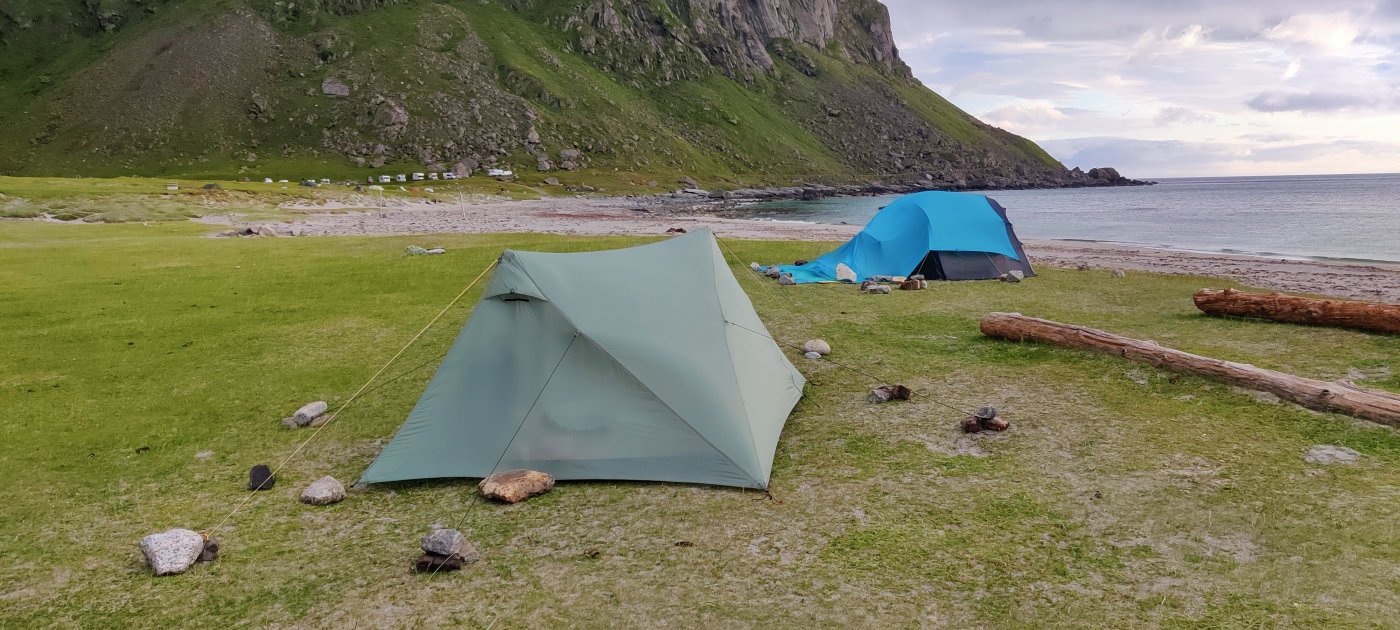 Slår et slag for Durston hvis du vil ha noe lett med god innvendig plass. Her fra tur på utsiden i Lofoten før sterke vindkast kom. Helsport teltet i bakgrunnen knakk tverrstangen litt senere. X-Mid 2 stod støtt. Vekt under kiloen, stabilt hvis pitchet korrekt, konge plass inni og satt opp med ytterduk først er fordelene. Bakdelene er at pitchen må være riktig og kan være utfordrende på veldig hardt eller løst underlag, og at man må bruke enten gåstaver eller dedikerte stenger kjøpt separat. Finnes nå i en selvstående variant som jeg ville kjøpt om jeg ikke alt hadde dette.