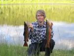 1. Noen ganger blir ikke ekspedisjoner så vellykket som de så ut til å bli i planleggingsfasen. Årets ukestur ble i denne kategorien, takket være feber, hetebølge, betydelige mengder stikkende og bitende insekter og delvis fisketomme vann. Det kan være veldig frustrerende når en tur ikke går som den skal, men som regel lærer man litt underveis og kan ta noen grep i forkant ved neste anledning. 28 grader varmt i villmarka. Her har vi en kaffepause eter noen timers vandring. Forflytning i skog når det er så varmt byr på utfordringer. Man er et vandrende koldtbord for alle skogens insekter, og å ta pauser underveis er ikke så lystbetont som kroppen vil ha det til. Det ble ikke bedre av at undertegnede var satt ut av influensa og tilhørende feber. Sol, måne og blikkstille vann i svensk sameland. Turen med kompis Rune ble som vanlig planlagt i god tid gjennom en lang vinter, og nest siste uka i juli utforsket vi et område like innenfor svenskegrensen. Utgangspunktet var Vouggåtjålme. Mange fiskevann i alle retninger. og noen gode elver også hadde vi hørt. Pilen marker et godt utgangspunkt for fine villmarksopplevelser hos broderfolket. Tilfeldighetene ville det slik at det var en fantastisk varm og fin periode for alle som liker sommer og sol. For fjellvandrere med fiskestang var det tvert i mot et utfordrende vær. Vi fristet likevel lykken i håp om et væromslag underveis. Bøy i stanga første kvelden. Les resten av turrapporten på Ørretjakt og fine turer i Salten