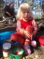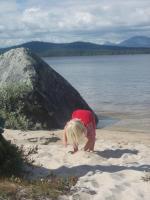 Jeg og mine 2 barn på 12 og 3 år var i fjord der for å padle, men pga være kom vi oss ikke rundt. Så vi ville prøve oss i år igjen. I år ble også min pappa med oss. Turen startet ved Hovden, helt nord. Kanoene ble lesset og turen kunne endelig starte. Vi padlet den lille biten ned sømåa og kom ut på Isteren. Der blåste det mye, store bølger. Vi var litt i tvil på hva vi skulle gjøre. Prøvde oss litt, men fant ut at det var like greit å gå i land. fant en bitteliten sandstrand å gå i land ved. Der satt vi og spiste litt mat og ventet på bedre vær. Men det lot vente på seg.(det var sol) Før vi reiste hadde pappa laget til to stokker som var lange nok til å binde fast kanoene side om side. Ingen av oss har prøvd dette før, men vi fant ut at vi kunne prøve det nå. Det funket som bare det. Kanoene ble kjempe stødige. Så da kunne turen fortsette mot bjørnefjorden. en bitteliten bit med motvind og vi endret kurs og det gjorde også vinden, så vi hadde vind i ryggen hele veien. Fant leirplass på nordsiden av odde, da fikk vi litt ly fra vind fra sør. Dagen etter bød heller ikke på mindre vind (men strålende sol), men vinden stoppet ikke oss nå. Turen gikk først inn til Trolltjønna, før vi padlet sør over. pga mye motvind gikk det ikke for fremmover. Så når vi kom litt nedenfor risbekksætra gikk vi land for å spise litt lunsj, tomatsuppe med egg og makaroni-mmmmmm. Vinden stilnet litt, så neste etappe gikk litt lettere. Men hele tiden litt motvind. Kursen var nå Balvika. vi byttet på å padle, (bare 2 kunne padle om gangen) så alle fikk sin tur med pause. Nå var klokken blit litt over 17 og vi mente å finne en leirplass, men dem 2 fine stedene vi så var det folk på. Så vi bestemte oss for å padle ned til nysandvika. (jeg og ungene lå der i fjord og viste at der var det kjempe fint) Det ble en lang dag med padling, men det var bare siste halvtimen ungene var utolmodige. Lillemor sov en liten time på siste etappe, men når ho våknet igjen måtte vi frem med bestikkelser. Bestefar fant frem spekepølse og litt kjeks. Da var vi klare for siste biten. Vi alle var glade for å komme i land. Det hadde vært en lang dag med mye motvind, men en veldig fin dag. Dagen etter hadde jeg bursdag og vi valgte å ta en viledag. Slappet av lenge med frokost og kaffe, ungene gikk for å finne litt blåbær. I mens dem var borte ordnet jeg i stand en liten overraskelse vi skulle ha til kvelden. Vi pakket sammen for å padle en liten bit til en leirplass vi viste var fin, så da padlet vi ned til barnholmen. Etter litt lunsj og en kvil i skyggen, gikk vi en tur opp på elvebergan. Fanasisk usikt. Turen tok litt tid med en 3 åring og en bestefar med dårlig rygg. Men vi kom oss opp og ned alle steinene. Til bursdag-middag fikk jeg cowboygryte og til dessert var det tid for overraskelsen, nemlig gelè med vaniljesaus. En fanastisk dag og en fantasisk bursdag. Så kom det som ble siste dag (mente å ha en natt til) Det var nesten vindstille og solen skinte. Vi valgte å a veien tvers over og fortsatte norover. Dette var en fantastisk dag på vannet. Det vi hadde av vind var medvind. vi gikk i land litt nord for svalodden på en kjempe fin sandstrand for å spise lunsj. Men jeg lagde lunsj lekte ungene i vannet. lillemor var den tøffeste og tok av seg alle klærne og badet. Når vi begynte å padle igjen blåste det opp litt, men det var medvind så da var det ingen grunn til å klage. Før vi viste ordet av det var vi ved utgangen til sømåa. Vi var enige om at vi hadde hatt noen kjempe fine dager og valgte å avslutte turen. Jeg snakke med min søster 2 dager før og dem skulle til idre for helgen, så da reise vi rett dit og tok 3 netter til der. Da fikk min sønn på 12 prøvd den hjemme lagde kanoen han fikk av dem til bursdagen. Her kommer noen bilder: Blåbær med sukker il dessert etter frokost var god Her er farkosten våres utsikt nordver fra elveberget greit å være 3 år på kanotur ungene på tur i storebrors kano