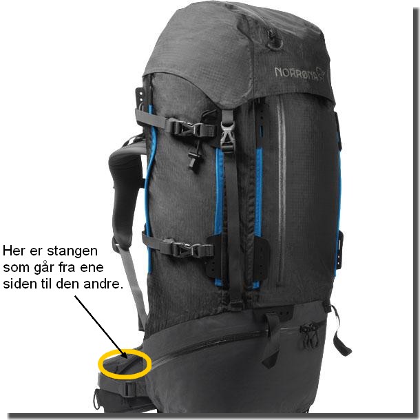 På denne sekken har hoftebeltet ei bøyelig stang som går på tvers horisontalt bak og frem til hoftene for optimal støtte, og det er veldig behagelig å ha sekken på. Se vedlagt bilde.