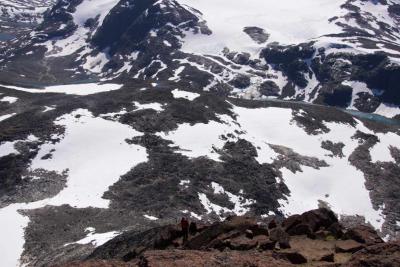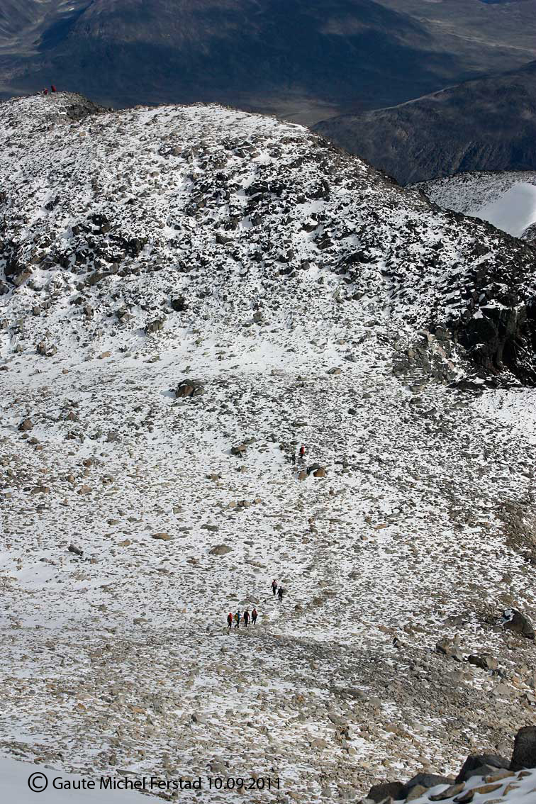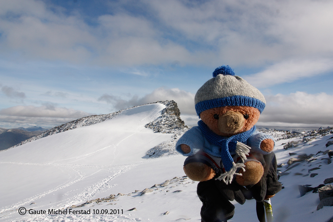 Hei Det var en så herlig tur at jeg måtte nesten skrive litt om den. Og måtte jo vise noen bilder også. Midtre og Store Hellstugutind og Semeltinden vil nok være svært interessante til neste år. Jeg må innrømme at jeg har litt høydeskrekk. Derfor synes jeg det er greit med litt brattere terreng, men som fremdeles ikke kvalifiserer til klatring. Og jeg regner med at utsikten derifra er helt fantastisk. Og selvsagt, Teddy må jo være med. Jeg skulle ønske jeg kunne tatt en ekstra tur nedover og fått med meg Glittertind, men det må nok bero til neste år det også. Ikke mange jeg kjenner som er fjellinteresserte, så jeg er litt avhengig av å mase litt. Men jeg endte jo opp med å gå på Galdhøpiggen alene, så det lar seg vel gjøre å gå til Glittertind alene også. Ja, hva kannadieren mener er ikke greit å forstå. Trodde ikke dette forumet var særlig utsatt for spam. I morgen reiser jeg til USA en 10 dager og da hadde jeg ikke kommet til og bruke forumet og heller ikke vært oppmerksom på det. Men moderator Torgeir som er ansvarlig for turrapporter har blitt varslet. Sendte han nettopp en mail, så får vi se hva som skjer. Gaute