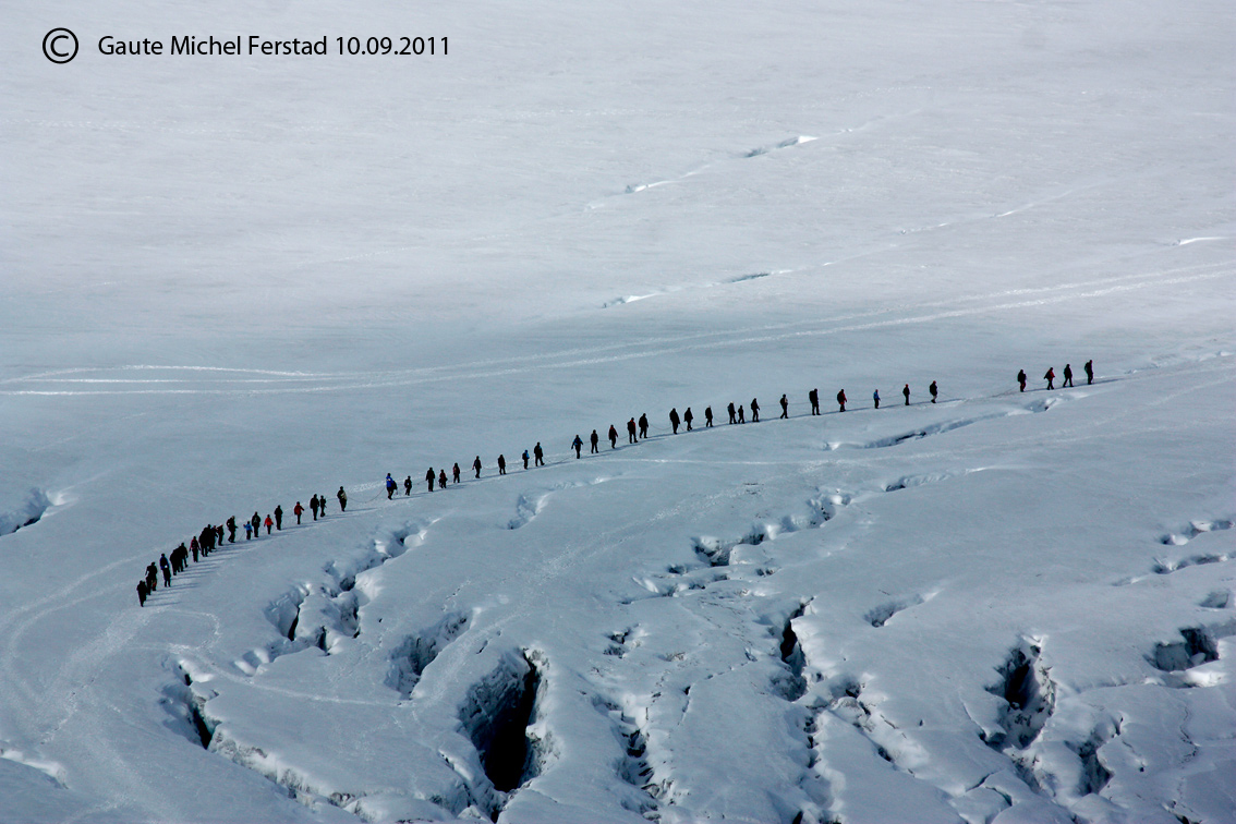 Jeg sier bare YIPPIIII! (Jeg tror bildene har kommet i motsatt rekkefølge). 27 august forsøkte jeg å nå toppen sammen med en kamerat. Regn var det hele veien. Stormkast mot Svellnose. Makker'n sa takk for seg før Svellnose og klokken gikk raskt. Ingen foran eller bak meg. Jeg nådde Svellnose 2272 og sa meg fornøyd med det. Stolt for å ha tatt det jeg tror var den riktige avgjørelsen. Men herregud. For en skuffelse. Jeg kom slukøret tilbake til Trondheim. Ikke (excuse my language) faen om jeg skulle bare gi meg. Og denne gangen skulle jeg gå alene. Jeg var litt redd for at dette ble litt i siste liten på året, men jeg bestilte rom på Spiterstulen med håp om at det ikke ville være for mye snø om 2 uker. Min kone kan ikke gå i fjellet. Men både hun og hunden var med på turen som moralsk støtte. Og vi kjørte nedover den 9 september. Noe regn men ikke mye. Vi fordelte litt kamerutstyr. Det er hun som er fotografen i familien. Og så hadde jeg med meg videokamera. Men tursekken var strippet for alt unødvendig utstyr som var med sist. Denne gangen var det en ullgenser og ekstra votter. Og en matpakke og mye vann. Kone og hund fulgte meg til elva. Så var det bare å labbe i vei. Man skulle tro det var psykisk lettere denne gangen. Fordi man visste hva man gikk til. Hvor bratt det var og hvor mye stein man måtte gå på. Og også hva man forventet bak hver en topp. Men den gang ei. Det var heller psykisk vanskeligere. For jeg visste at jeg hadde mange timer foran meg i akkurat det samme terrenget som sist. Men, man kan ikke la det ødelegge. Det var bare å se seg rundt og fokusere blikket på andre topper og andre detaljer. Jeg hadde et rolig tempo. Det var ikke planlagt. Det er min maksfart. Og med stavene karret jeg meg frem. Jeg kunne se folk langt ned i dalen, der hvor man kan stå og fremdeles se ned mot Spiterstulen. Pussig nok, så tok alle meg igjen. De nærmest sprang forbi. Det var ett ektepar som holdt følge. De hadde 3 unger med, og de kunne ikke være særlig gamle. Vi holdt ikke følge, men de spurtet forbi. Og så tok de pause. For det var alltid en av ungene som ble sliten eller ville ha mat. Så nådde jeg dem igjen. Og noen minutter senere var de forbi igjen. Jeg mistet dem av syne mot Keilhaus topp. Og så var det et ektepar i femitårene. De jobbet seg saktig oppover. De var bak meg for det meste , og vi vekslet noen ord. Men jeg så de slet litt. Og det slo meg da at jeg gikk jo i akkurat samme tempo. Selve turen var fantastisk. Det regnet på fredag og det regnet på søndag. Men på lørdag, da jeg gikk var det nydelig. Varmt var det ikke. Men et fantastisk vær. Og denne gangen kunne jeg litt flere navn på topper rundt meg, så jeg følte meg liksom litt kjent. Jeg slet litt etter å ha kommet opp Piggrove. Men denne gangen kunne jeg se Svellnose fra lang avstand. Jeg gikk jo selvsagt opp på toppen av den denne gangen også. Det var ikke før på veien ned fra Keilhaus topp på vei mot Spiterstulen at jeg så stien gjennom snøen slik at man ikke trengte å gå opp. Her tok jeg meg en velfortjent pause. Når jeg gikk ned fra Keilhaus topp på vei mot Galdhøpiggen var det flere som var på vei tilbake. Og da skjønte jeg at på en trafikkert dag, så kan det fort bli folksomt og trangt på akkurat den delen av stien. Jeg møtte snøen som hadde lagt seg på bakken ved Keilhaus topp. Det var ikke mye. Steiene stakk opp fra sneen, og det var litt vanskelig å plassere føttene. Tråkket man på sneen var man ikke helt sikker på om man traff på en stein med en gang eller om det var langt ned før man fikk fast grunn... og heller ikke vinkelen på steinen. Men det gikk bra. Og det tok litt å komme opp helt til hytta fra Keilhaus topp. Jeg hadde jo som sagt det ekteparet i femtiårene rett bak meg. Og uansett om konkurranseinstinktet mitt forsvant for 20 år siden, så skulle jeg nå toppen før dem. Derfor måtte jeg sette inn et ekstra gir og det tok ut de siste kreftene. Det banket bra i hjertet når jeg endelig kom på toppen og jeg kjente rytmen av pulsen i ørene. Men jeg nådde toppen. At ca 100 stykker passerte meg på vei opp, og jeg passerte ingen, spiller ingen rolle. Jeg klarte det. Det er tross alt min andre fjelltur på to tiår, så jeg er fornøyd. Og for en herlig utsikt. Fjell overalt. Litt sne på de fleste. Nesten som melis som var drysset over. Hytta hadde jo selvsagt stengt når jeg kom, men jeg fant meg en fin plass ved siden av, tok på meg ullgenseren og spiste av matpakken. Det var flere som var der. Ikke mange. Men jeg fikk spurt litt og fikk god informasjon om hva jeg egentlig kikket på. Det var bare herlig. Jeg var der ikke lenge. Kanskje en halvtime. Men da var jeg nesten siste mann igjen, og ville helst se folk foran meg i løypa. Men etterhvert som kameraet kom frem og videokameraet, så var jeg svært så ensom etter nedturen fra Keilhaus topp. Jeg fikk tatt noen herlige bilder av et taulag å vei til Juvasshytta med telelinsen. Det bildet er med her, men skal bearbeides litt i Photoshop før det legges ut på min egen blogg. Jeg brukte over 5 timer opp og litt over 4 timer ned. Tror hele turen tok 9.44 minutter hvis jeg ikke tar feil. Og jeg er fremdeles glad for at jeg brukte staver. Jeg fikk et godt inntrykk av Glittertind som står på agendaen til neste år. Så jeg er nok bitt av basillen. Kona og hunden ventet ved elva når jeg kom ned. Jeg så ikke noe til ekteparet i femtiårene etterhvert som jeg kom ned mot Piggrove. Holdt litt utsyn fra Spiterstulen og når klokken nærmet seg 8 om kvelden så gikk jeg inn i resepsjonen og nevnte det. Men de kunne fortelle meg at de var på vei ned. De hadde observert dem i kikkert. Så de følger med litt, og det er jo godt å vite. Det ble masse bilder og enda en video. Det går visst litt på både norsk og engelsk i videoen, men sånn er det. Bilder ble det også. På søndag kjørte vi hjem. Vi kjørte til Juvasshytta først for å ta bilder på vei ned. Men så 