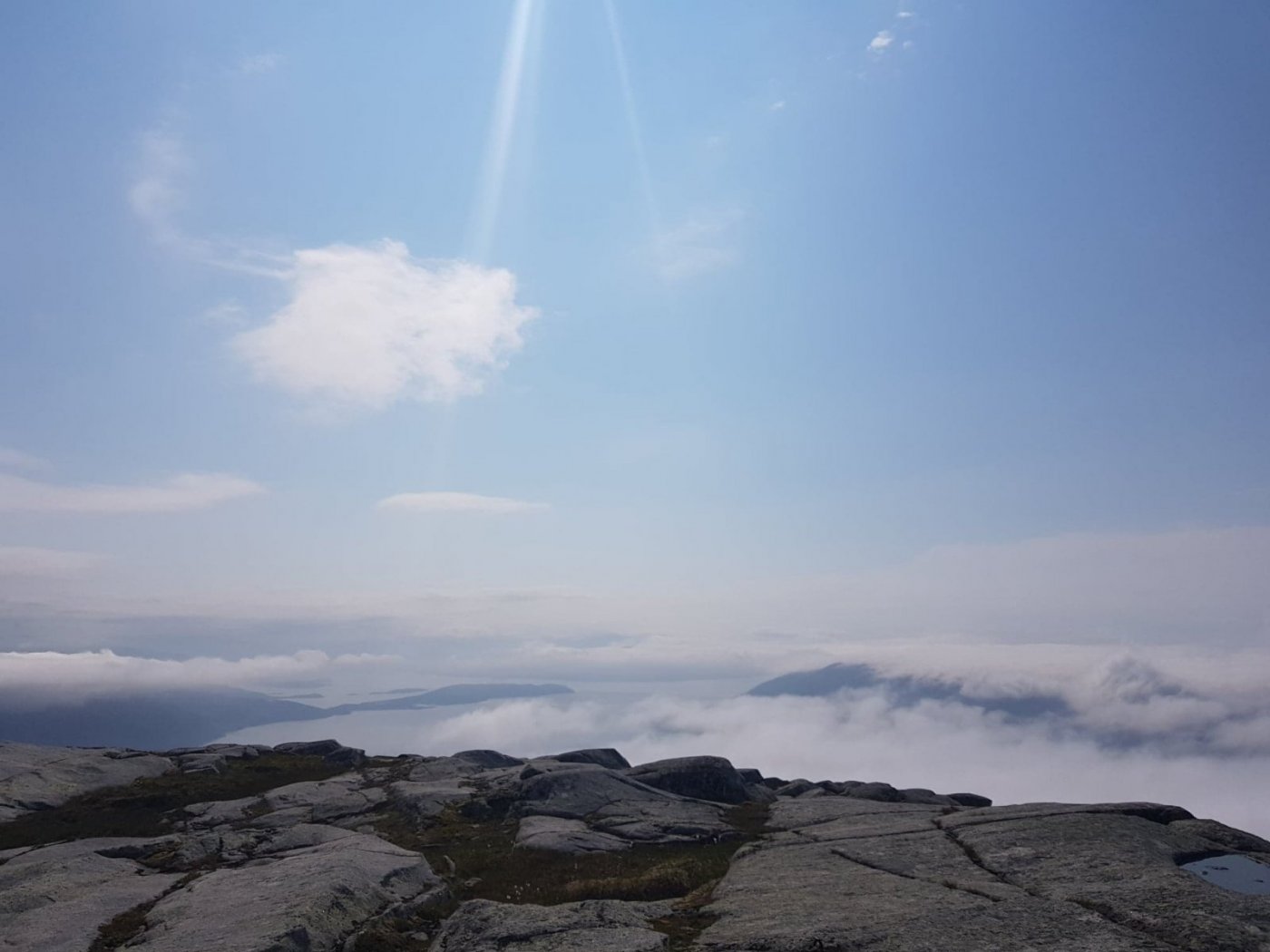 21. Siden jeg jobber på bor i Trondheim, men jobber på Orkanger, var det helt innafor med en ettermiddagstur til Hestgrovheia idag, høyeste i Agdenes kommune. Flott sti opp, sjeldent lettgått. Selvfølgelig tåke på toppen, sol lengere ned