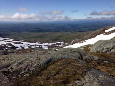 Det var meldt oppholds fra morgenen, og strålende sommervær utover dagen, så vi (jeg og mellomste guttungen på 9 år) hadde som mål å nå Storskarven i "Skarvan og Roltdalen nasjonalpark". Men det ble mye våt myr, vi gikk litt feil (ser jeg i ettertid), og på "toppen" der vi kom opp fikk jeg totalt melt-down. Har lavt stoffskifte, og der møtte jeg plutselig veggen. Så å presse seg i ihvertfall 3 km til med forsering av snø og andre utfordringer, så jeg svært mørkt på. Så turen endte der, og vi satte igang med returen, selv om guttungen nok kunne løpt opp og ned enda en gang og ihvertfall nådd toppen av Skarven (hva pokker er den ungen laget av??). Men for en turkamerat!! Forståelsesfull og empatisk fortsatte han hele turen ned på samme måte som opp, med ukuelig optimisme, strålende humør og full skravlings. Men, vi fikk MASSE sol og vakker natur, vi "måtte" vade over en elv (kunne kanskje komme over tørrskodd lenger opp - vi sjekket ikke), gutten var strålende fornøyd med å få gå på snø barbeint (og med sko), vi fant et bein (reinsdyr?), eggeskall, steiner, og spiste store mengder kjeks og sjokolade (i tillegg til mat da). En fantastisk tur alt i alt!! Og ifølge Runkeeper var vår tur på snaut 19 km, der vi også "klatret" ca 700 høydemeter på tur opp. Så må jo være fornøyd... Utsikt fra "toppen" vi kom til Guttungen (og jeg) er litt nysgjerrig - noen som kan fortelle oss hva slags dyr dette stammer fra?
