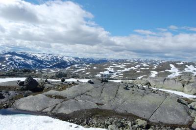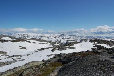 Vel hjemme igjen etter en helt fantastisk tur! Veldig greit å komme seg til hytta, siden den ligger et steinkast fra togstasjonen. Masse sengeplasser og oversiktlig og greit for unger å leke utendørs. Rallarvegen gikk rett forbi gjennom området, og det fristet veldig å teste ut den på sykkel ved anledning. Jeg samsover til vanlig, så det var grei plass i en køye til meg og jentungen - men det var forholdsvis upraktisk med lakenpose da (jeg ammer fortsatt), og sengene (ihvertfall den vi hadde) knirker voldsomt. Men ser for meg at man kan medbringe reiseseng, om man bruker det - grei plass til det, og ikke langt å drasse på fra toget. Knyttet jenta på ryggen på tur, og vi gikk på lørdagen i +/- 7 timer (med noen kaffe/amme/spise-pauser), og kom oss opp på en nær topp der GPS'en viste 1526 moh. Fantastisk utsikt! Vi var så svineheldige at værgudene i høyeste grad var på vår side (tross meldt regn!), så vi hadde hele lørdagen steikende sol lett avbrutt av noen høytsvevende skyer, så vi fikk fin farge i ansiktet (jentungen var smurt, heldigvis!), og kunne se fjell og vidder milevis avgårde. Jentungen koste seg glugg på ryggen, og sov og sang/pludret om hverandre. Hun ble litt lei mot slutten når vi nærmet oss hytta - mistenker at det "humpet" litt mye, da vi tok en snarvei ned en litt brattere skråning, men ikke verre enn at noen rosiner fikk opp humøret. Så - konklusjonen er vel at jeg absolutt kan anbefale Hallingskeid for barnefamilier. Ser også for meg at det er glimrende reisemål vinterstid med akebrett og ski, noe jeg har lest er anbefalt der også forøvrig! Men sommerstid kan det nok være lurt å drøye en stund utover, hvis man ønsker å følge T-merkede stier. Vi prøvde to forskjellige, og den ene gikk til en elv der broen ikke var tatt ut for sommeren enda, og den andre forsvant under snøen. Men med både GPS og kart/kompass tok vi ut på egenhånd og hadde full kontroll og oversikt. Vi var forøvrig alene første natta, men lørdagen kom det fire hyggelige briter, og en hyggelig bergenser. Lurte litt for meg selv om det kunne være noen her inne, men turde ikke å spørre...