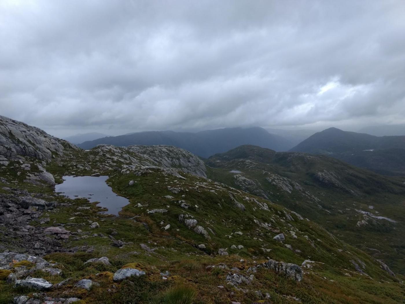 Hmm, skulle ha vert meir i posten, men det skjedde vist noko der. Gjekk opp gullkleiva frå gullbotn og så fulgte eg kanten sørover, kan ikkje huske kva det heiter der oppe. Satte meg ned omtrent her ved enden av det sørlegaste vatnet: https://kystinfo.no/share/8751119d1b0a (må kanskje flytte/zoome kartet for å få riktig plasering på markør) med utsikt nedover mot gullbotn og samnanger. Tok same veg tilbake men rota litt rundt på steinfjellet for å ta fleire bilete. Var overraskane bra vær, stort sett opphald heile turen, godt å varmt nede men ein smule kjølig oppe. Skulle berre ønskje at det var vær til å fly ned. Middagsplassen sett ovanfrå, med utsikt mot osterøy og trengereid.