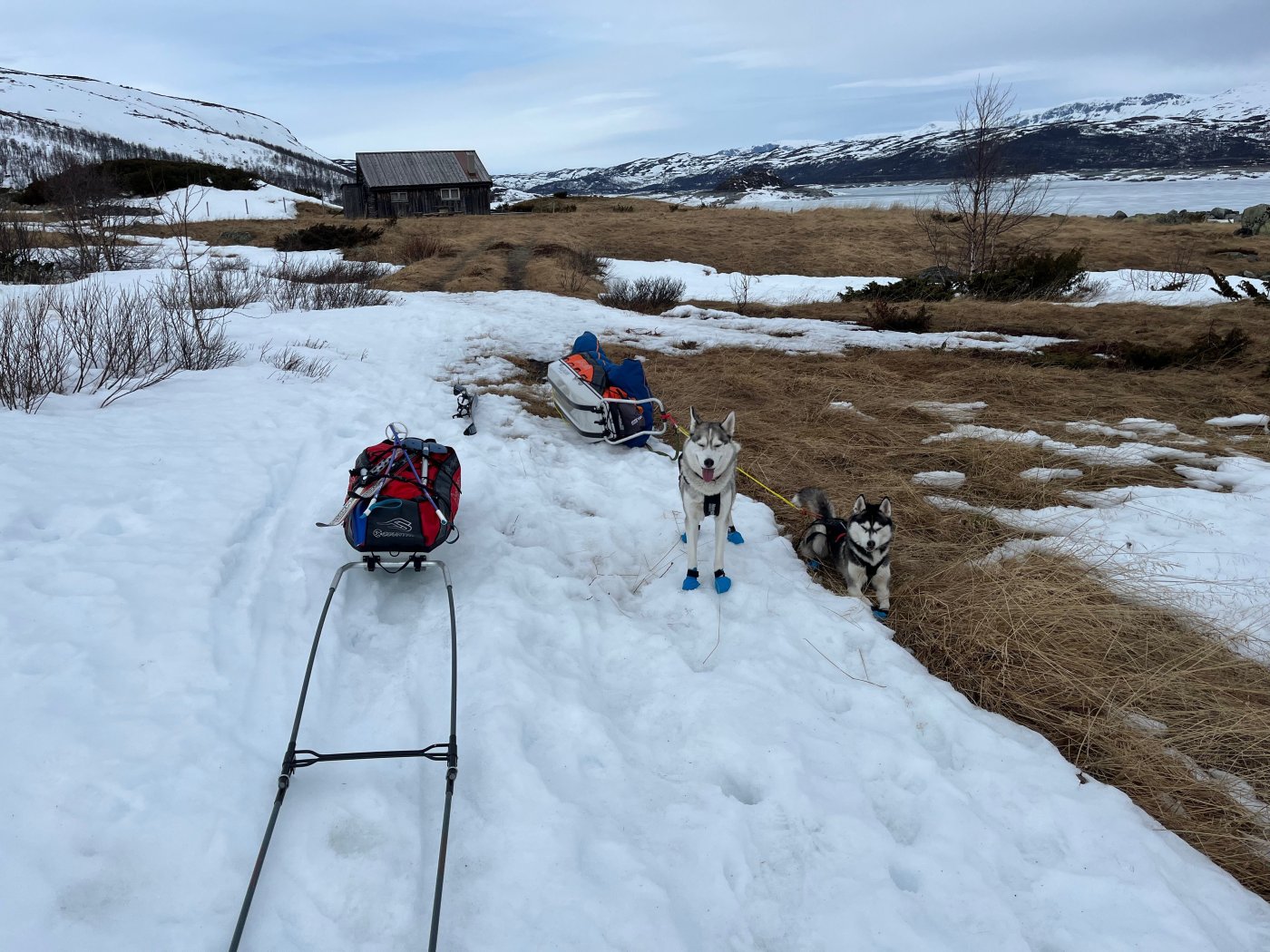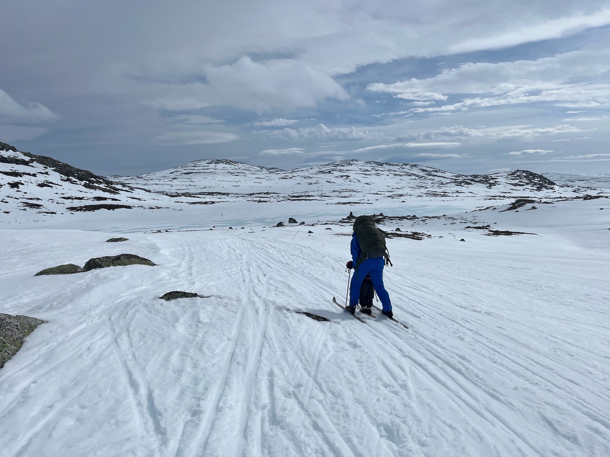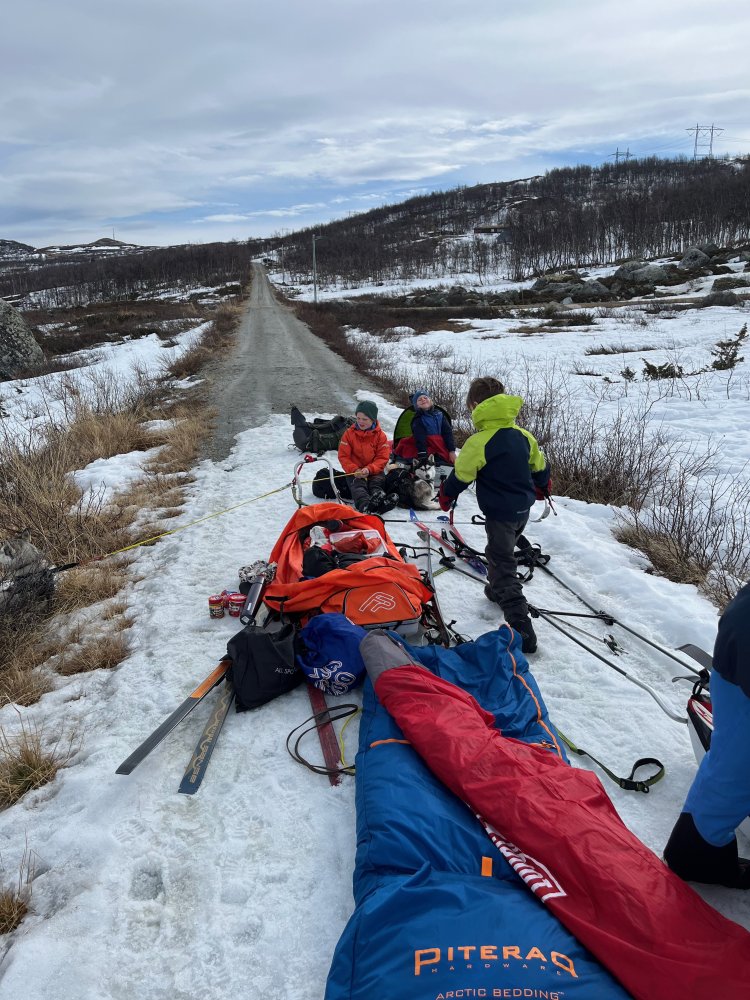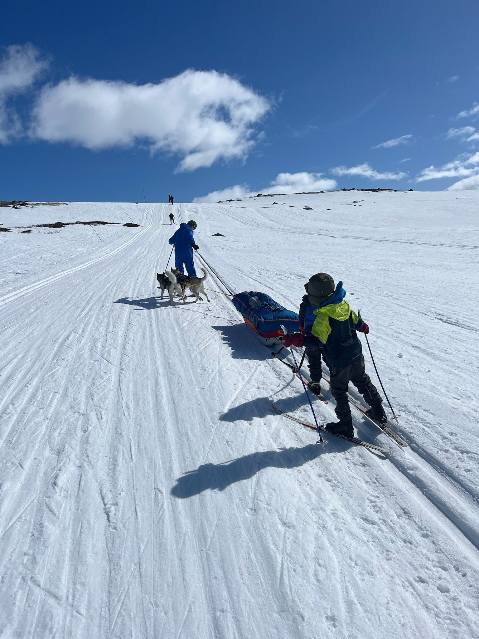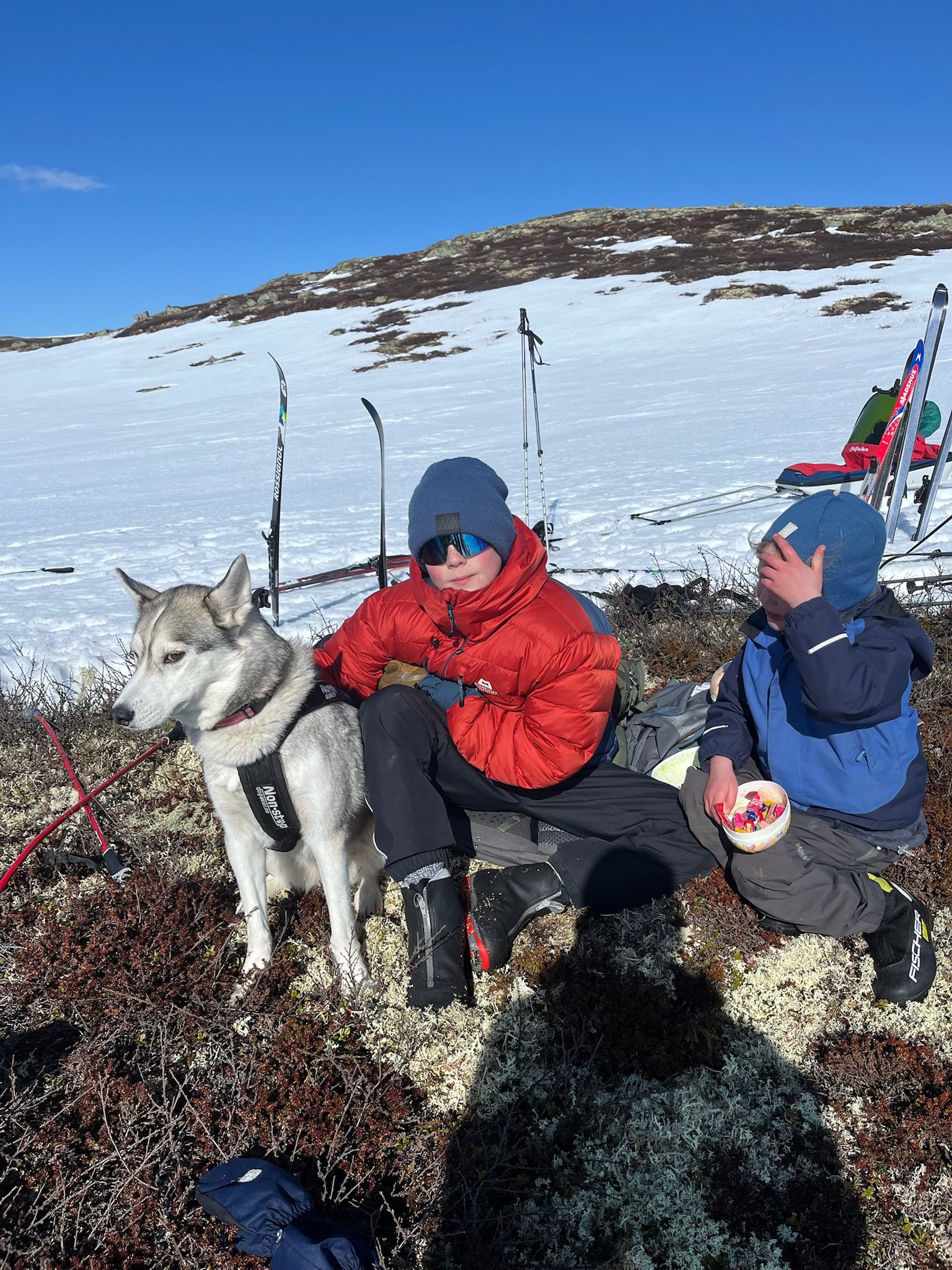 Vinteren 24/25 kan vel de fleste enes om at ikke skriver seg inn i historiebøkene som den beste og utviklingen mot påske tilsa at tur på hytta ville bli mindre spennende. Selvfølgelig kan vi kose oss på hytta uten snø, men planene om å ta med barn og hunder på toppturer i nærområdet og lek i snøen, det så litt mørkt ut. Diverse alternativer ble diskutert, teltleir i jotunheimen feks, men det var ikke så tiltalende for de på 4 og 7 hvis resten skulle på randoturer. Mor i huset som, i alle fall tidvis, er ambisiøs optimist forslo å ta toget til Finse og gå noen dager med telt og full pakke. Far var som vanlig litt skeptisk, det var tross alt 6 barn i alderen 4-13 år som skulle være med og ikke alle er superivrige til å gå langt på ski. I fare for å bli stemplet som den alltid kjipe måtte undertegnede bare bite det i seg og være med på å planlegge tur. Planen ble å kjøre til Ustaoset, ta toget til Finse og gå tilbake. Og hvis dere lurer på hvorfor vi kjører til Ustaoset og ikke bare tar toget fra Oslo, prøv å kom dere til Oslo S og tilbake med 3 pulker, 6 barn og 2 hunder. 4-åringen måtte ha med pulk og vi trengte 2 transportpulker for å få med oss alt. Planen var at våre 2 Sibirske huskyer skulle trekke en fjellpulken 168 alene, men dette hadde vi ikke prøvd før så barnepulken ble rigget med dragfester bak for å ha en liten transportpulk hengende på slep, sånn i backup. Lørdag 12. April Avreise Fetsund kl 0600 med bil og henger for å nå toget 12:08 fra Ustaoset. Vi hadde beregnet god tid, men var litt usikre på parkeringsmuligheter. Google hadde gitt oss indikasjoner på at det var parkeringsmuligheter på stasjonen, men det stemte ikke. Bagasje og unger ble lesset av på stasjonen før vi etter litt rundspørring fikk leie en parkering til 200kr dagen. Jaja det fikk heller være. Toget var stappfullt med pulker og utstyr, vi var vist ikke de eneste som skulle starte fra Finse denne palmelørdagen. Det gikk vist av 150 personer, noe flere en vi foretrekker å starte en tur med, og langt flere en de 2 som gikk av toget sammen med fruen en onsdag 4 uker tidligere. Etter opptelling på perrongen for å være sikre på at alt og alle var kommet av toget var det bare å spenne skiene og skli forbi Finsehytta og svinge i retning Krækkja. Varmegrader og slush gjorde føret litt trått, men sirkuset var i gang. Det var tidvis litt misnøye og klaging når vi startet på stigningene, ungene var vist mest gira på gaming og avslapping i påsken, men det ga seg fort. Faktisk var interessen stor for å trekke pulk, tvillingene på 13 og brødrene på 11 og 9 konkurrerte nærmest om å trekke pulk opp bakkene, og det med smørefrie/felle-ski av ymse slitte kvaliteter. Hundene løste også oppgaven trekking av pulk fint, selv om de ikke forstår helt det med jevnt og passe tempo, det er full spiker eller full stop p. Været skiftet litt med overskyet og sol, tidvis kunne vi skimte Hardangerjøkulen opp på vår høyre side. Etter 9km ble det camp ved Brattefonnvatnet og skydekket lettet og gjorde at vi kunne spise middag ute i strålende sol. Det ble lek og morro ute og rundt teltet. Etter at ungene hadde lagt seg insisterte fruen på at vi måtte vente til fullmåneoppgangen. Det ble ganske magisk. Søndag 13. april Det var en del minusgrader i løp av natten, men ikke verre enn at de voksne klarte seg fint med 3 sesong pose, ungene hadde fått vinterposene. Etter frokost ledet fruen raskt og effektivt riving av leir. En Artic bedding fikk alle liggeunderlag tømt for luft, og en sovepose. På den måten slapp vi i det minste å rulle og pakke 7-8 underlag, men måtte fortsatt blåse opp. Nattefrosten ga litt raskere før og alle ivret i vei. Motivasjonen for noen av barna var egentlig at vi skulle gå alle milene helt frem første dagen, slik av vi kunne dra hjem. Egentlig liker de godt å være på tur så litt rart. Uansett, vi var alle litt spent på monsterbakken som mamma hadde dratt pulk opp noen uker før, og denne monsterbakken var motivasjon i seg selv. Og til monsterbakken kom vi til slutt, etter at undertegnede vist nok med viten og vilje hadde sent hunder og pulk etter mamma for en stygg takling. Jajaj, man får tåle noen gloser etter slike uhell. Når monsterbakken kom skulle alle gutta vise at de var menn, her skulle det helst dras alene, men de forsto raskt at det var bare å samarbeide. De imponerte foreldre og andre skuelystne stort med innsatsen. Også Lillesøster på 4 fikk noen km på ski denne dagen. Etter en 11-12km kom vi oss frem til Krækkja der det ble vaffel, de burde jobbe litt med kapasiteten på vaffelsteking. Ventetiden ble lang når vi skulle ha 8 vafler. Interessant hvordan historien om sirkuset vårt på tur ble gjenfortalt på engelsk i peisestua før vaflene var ferdig. Teltleir nr 2 ble på en odde rett bortenfor Krækkja. Drittværet som egentlig var meldt tidligere på dagen begynte så smått å sige inn. Vi var glade for at vi ikke fikk regn og vind midt på dagen. Mandag 14. april. Igjen hadde vi fint skareføre og kunne suse avgårde over Store Krækkja og Ørteren før vi krysset RV7 ved Lægreidstølen. Her var det fullstendig galematias, biler parkert over alt, kø, folk, hunder… Vi startet videre mot Tuva, men 4 åringen var kald og sulten så det ble å søke ly bak første løa, frem med primus, varmeflaske, mat og Kakao før alle igjen var klare for fight. Løypa innover mot Tuva var i overkant befolket for vår smak og det var ikke lett å få hundene til å gå dit vi ville når det var så mange Settere å leke med på alle kanter. Ble fort bedre når vi krysset Nordover en mer direkte rute mot Ustaoset. Nok en gang ble Mor og Far overlatt til en lett sekk og måtte nøye forvalte hvem som skulle få lov til å trekke pulk. Mest stas var det å trekke lillesøster på 4, selv om dette nok lett var den tyngste pulken, Det ble en ganske tidlig leir, til noen sin fortvilelse. De ville jo tilbake. 