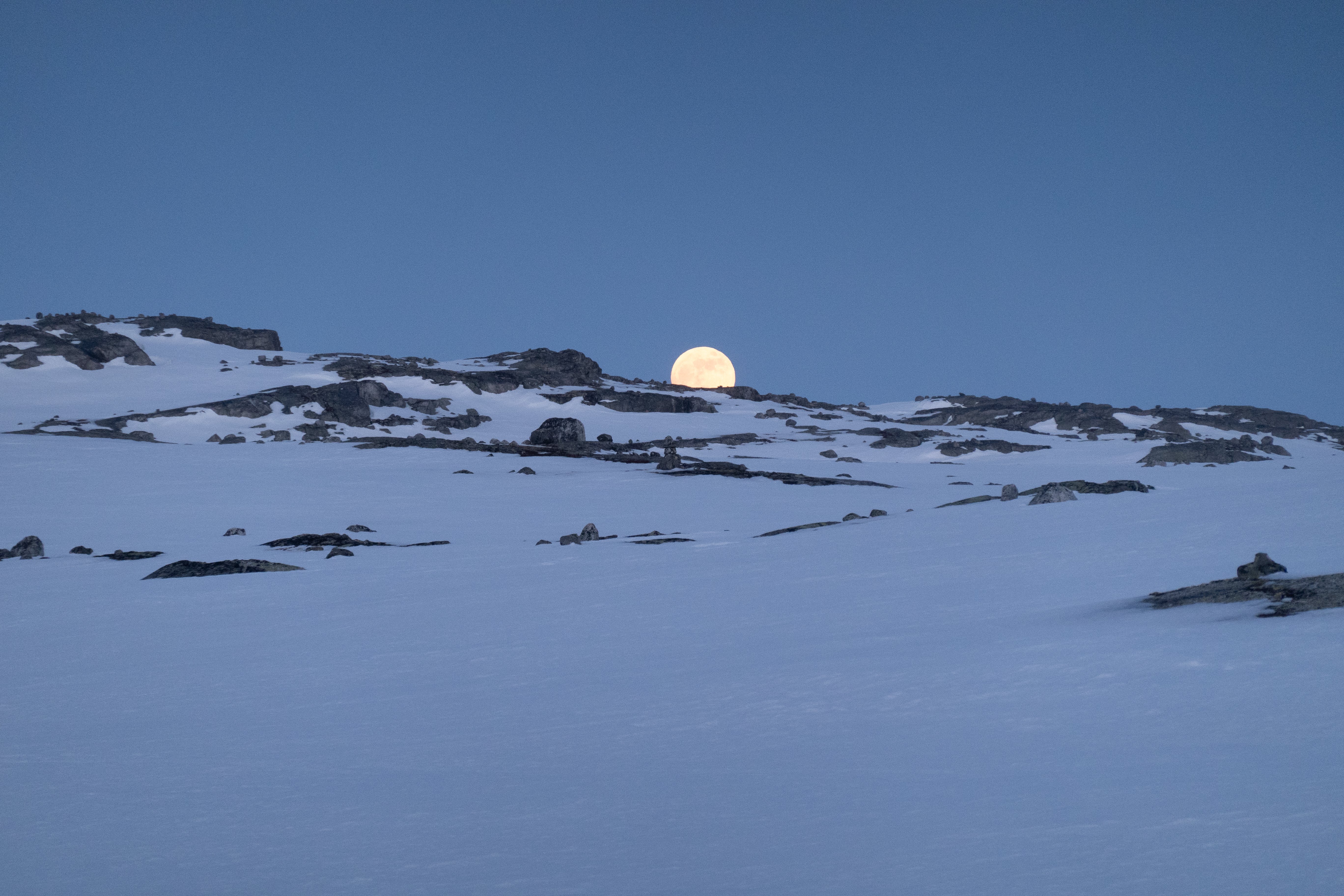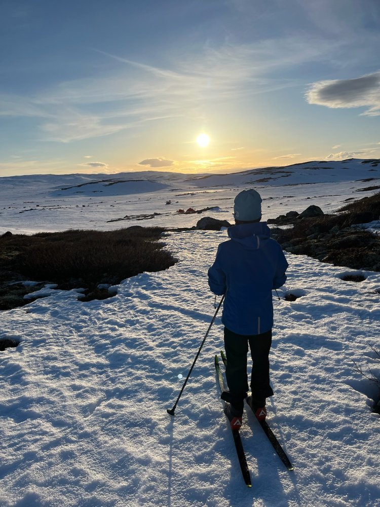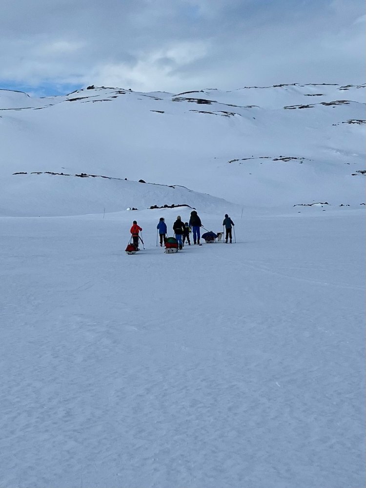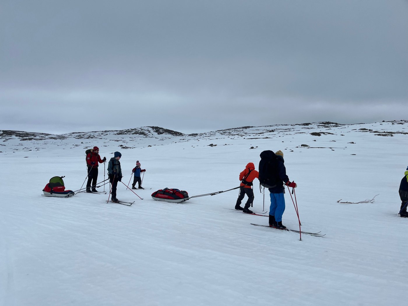 Vinteren 24/25 kan vel de fleste enes om at ikke skriver seg inn i historiebøkene som den beste og utviklingen mot påske tilsa at tur på hytta ville bli mindre spennende. Selvfølgelig kan vi kose oss på hytta uten snø, men planene om å ta med barn og hunder på toppturer i nærområdet og lek i snøen, det så litt mørkt ut. Diverse alternativer ble diskutert, teltleir i jotunheimen feks, men det var ikke så tiltalende for de på 4 og 7 hvis resten skulle på randoturer. Mor i huset som, i alle fall tidvis, er ambisiøs optimist forslo å ta toget til Finse og gå noen dager med telt og full pakke. Far var som vanlig litt skeptisk, det var tross alt 6 barn i alderen 4-13 år som skulle være med og ikke alle er superivrige til å gå langt på ski. I fare for å bli stemplet som den alltid kjipe måtte undertegnede bare bite det i seg og være med på å planlegge tur. Planen ble å kjøre til Ustaoset, ta toget til Finse og gå tilbake. Og hvis dere lurer på hvorfor vi kjører til Ustaoset og ikke bare tar toget fra Oslo, prøv å kom dere til Oslo S og tilbake med 3 pulker, 6 barn og 2 hunder. 4-åringen måtte ha med pulk og vi trengte 2 transportpulker for å få med oss alt. Planen var at våre 2 Sibirske huskyer skulle trekke en fjellpulken 168 alene, men dette hadde vi ikke prøvd før så barnepulken ble rigget med dragfester bak for å ha en liten transportpulk hengende på slep, sånn i backup. Lørdag 12. April Avreise Fetsund kl 0600 med bil og henger for å nå toget 12:08 fra Ustaoset. Vi hadde beregnet god tid, men var litt usikre på parkeringsmuligheter. Google hadde gitt oss indikasjoner på at det var parkeringsmuligheter på stasjonen, men det stemte ikke. Bagasje og unger ble lesset av på stasjonen før vi etter litt rundspørring fikk leie en parkering til 200kr dagen. Jaja det fikk heller være. Toget var stappfullt med pulker og utstyr, vi var vist ikke de eneste som skulle starte fra Finse denne palmelørdagen. Det gikk vist av 150 personer, noe flere en vi foretrekker å starte en tur med, og langt flere en de 2 som gikk av toget sammen med fruen en onsdag 4 uker tidligere. Etter opptelling på perrongen for å være sikre på at alt og alle var kommet av toget var det bare å spenne skiene og skli forbi Finsehytta og svinge i retning Krækkja. Varmegrader og slush gjorde føret litt trått, men sirkuset var i gang. Det var tidvis litt misnøye og klaging når vi startet på stigningene, ungene var vist mest gira på gaming og avslapping i påsken, men det ga seg fort. Faktisk var interessen stor for å trekke pulk, tvillingene på 13 og brødrene på 11 og 9 konkurrerte nærmest om å trekke pulk opp bakkene, og det med smørefrie/felle-ski av ymse slitte kvaliteter. Hundene løste også oppgaven trekking av pulk fint, selv om de ikke forstår helt det med jevnt og passe tempo, det er full spiker eller full stop p. Været skiftet litt med overskyet og sol, tidvis kunne vi skimte Hardangerjøkulen opp på vår høyre side. Etter 9km ble det camp ved Brattefonnvatnet og skydekket lettet og gjorde at vi kunne spise middag ute i strålende sol. Det ble lek og morro ute og rundt teltet. Etter at ungene hadde lagt seg insisterte fruen på at vi måtte vente til fullmåneoppgangen. Det ble ganske magisk. Søndag 13. april Det var en del minusgrader i løp av natten, men ikke verre enn at de voksne klarte seg fint med 3 sesong pose, ungene hadde fått vinterposene. Etter frokost ledet fruen raskt og effektivt riving av leir. En Artic bedding fikk alle liggeunderlag tømt for luft, og en sovepose. På den måten slapp vi i det minste å rulle og pakke 7-8 underlag, men måtte fortsatt blåse opp. Nattefrosten ga litt raskere før og alle ivret i vei. Motivasjonen for noen av barna var egentlig at vi skulle gå alle milene helt frem første dagen, slik av vi kunne dra hjem. Egentlig liker de godt å være på tur så litt rart. Uansett, vi var alle litt spent på monsterbakken som mamma hadde dratt pulk opp noen uker før, og denne monsterbakken var motivasjon i seg selv. Og til monsterbakken kom vi til slutt, etter at undertegnede vist nok med viten og vilje hadde sent hunder og pulk etter mamma for en stygg takling. Jajaj, man får tåle noen gloser etter slike uhell. Når monsterbakken kom skulle alle gutta vise at de var menn, her skulle det helst dras alene, men de forsto raskt at det var bare å samarbeide. De imponerte foreldre og andre skuelystne stort med innsatsen. Også Lillesøster på 4 fikk noen km på ski denne dagen. Etter en 11-12km kom vi oss frem til Krækkja der det ble vaffel, de burde jobbe litt med kapasiteten på vaffelsteking. Ventetiden ble lang når vi skulle ha 8 vafler. Interessant hvordan historien om sirkuset vårt på tur ble gjenfortalt på engelsk i peisestua før vaflene var ferdig. Teltleir nr 2 ble på en odde rett bortenfor Krækkja. Drittværet som egentlig var meldt tidligere på dagen begynte så smått å sige inn. Vi var glade for at vi ikke fikk regn og vind midt på dagen. Mandag 14. april. Igjen hadde vi fint skareføre og kunne suse avgårde over Store Krækkja og Ørteren før vi krysset RV7 ved Lægreidstølen. Her var det fullstendig galematias, biler parkert over alt, kø, folk, hunder… Vi startet videre mot Tuva, men 4 åringen var kald og sulten så det ble å søke ly bak første løa, frem med primus, varmeflaske, mat og Kakao før alle igjen var klare for fight. Løypa innover mot Tuva var i overkant befolket for vår smak og det var ikke lett å få hundene til å gå dit vi ville når det var så mange Settere å leke med på alle kanter. Ble fort bedre når vi krysset Nordover en mer direkte rute mot Ustaoset. Nok en gang ble Mor og Far overlatt til en lett sekk og måtte nøye forvalte hvem som skulle få lov til å trekke pulk. Mest stas var det å trekke lillesøster på 4, selv om dette nok lett var den tyngste pulken, Det ble en ganske tidlig leir, til noen sin fortvilelse. De ville jo tilbake. 