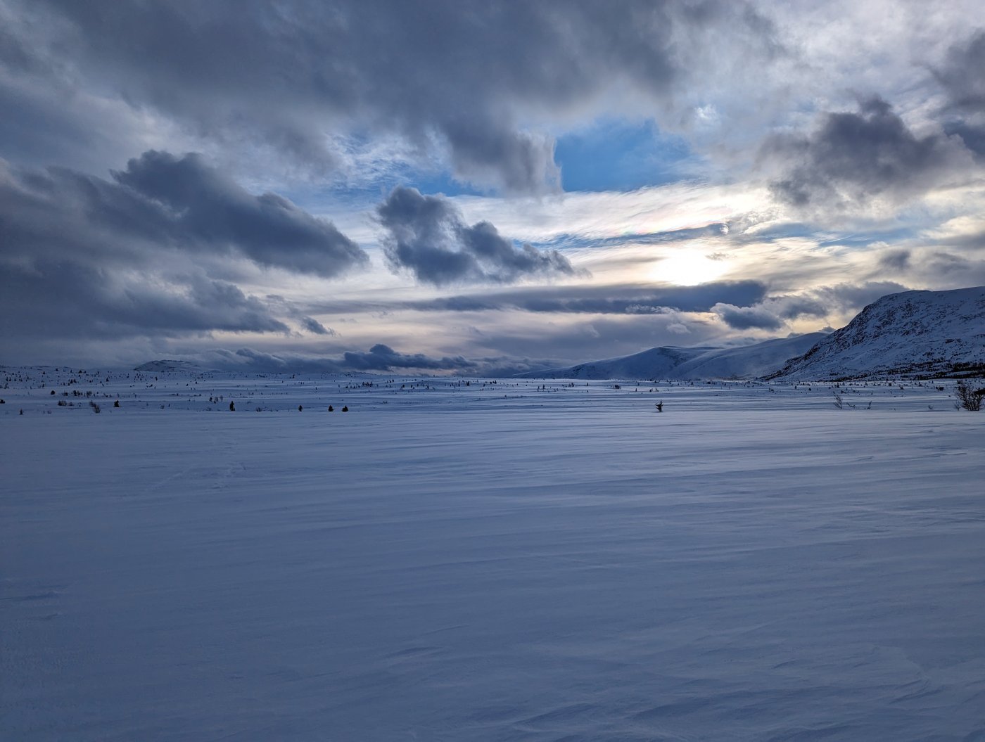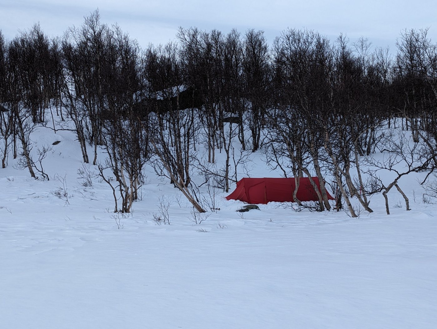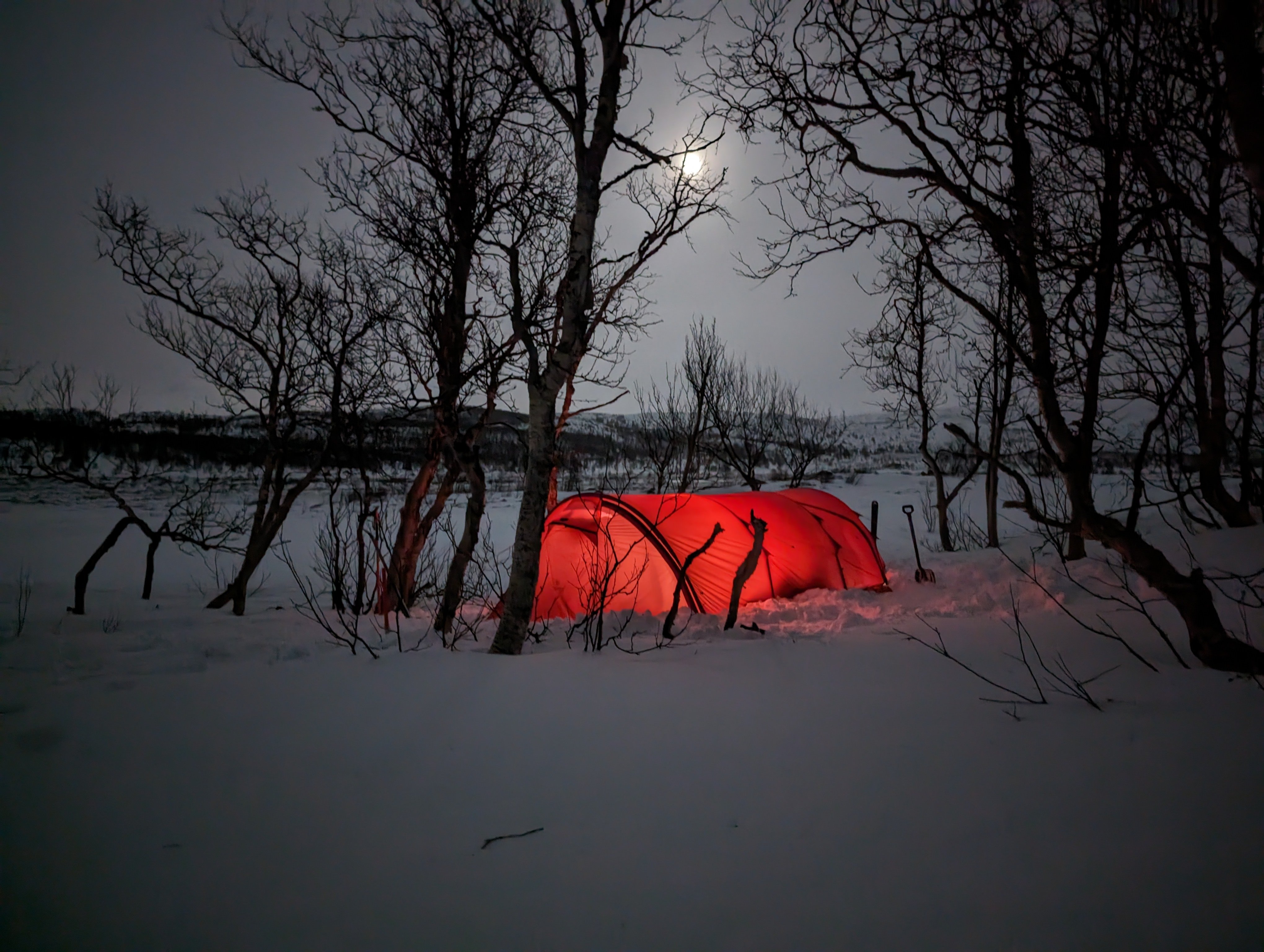 Førjulstur på Hardangervidda, selvfølgelig etter en altfor ambisiøs ruteplan som veldig fort ble nedjustert etter form og forhold. Jeg startet i mørket like ved Halne Fjellstugu, fra en brøytet parkeringslomme. Det skal vise seg å være lurt å ha med spade når man parkerer i disse lommene i noen døgn Turen skulle eegentlig gå tett opp mot Hardangerjøkulens østside, og delvis retning Finse før en retur. Føret i kombinasjon med litt vel kuppert terreng gjorde at jeg nedjusterte til en ~16 kilometers rundtur over Olavsbuvatnet, nedenfor Kjeldenuten(e) og over Olavsbuhæa og Halnebotnane før retur til bilen. Fredag kveld i mørket var føret veldig delvis panserhardt og skarete, men mye snøfall og vind begge nettene gjorde resten av turen til baksing i tung løssnø og semi-hardpakket nysnø som akkurat ikke bærte nok og det ble blytung å bevege seg fremover. Det kan meldes om gode mengder snø i området. Det var null problem å ha 1+ meter dyp grop i teltet. Ikke på de blåste heiene, men på de flatere partiene. Jeg prøvde ut Åsnes Falketind 62 Xplore-skiene for første gang, og jeg mistenker at kanskje (bare kanskje) hadde de 10cm lenger Nansen-skiene mine klart å bære noe bedre på den semi-pakkede snøen. Sannsynligvis ikke. Morsom ski uansett, og jeg liker at de er litt kortere. Det er mye mer manøvrerbart opp bakker i løssnø i hvert fall! Litt annet føre må til før jeg kan gi noen dom på glid for pulktrekking. Andre nye ting ble også testet: Fjellpulken Traverse 145 - Denne liker jeg veldig godt, men jeg syntes det var vanskeligere med taudrag og "meiepulk" enn taudrag og plastbrettpulk. Kanskje mest på grunn av tau-innfestingen på de fremre sidene av pulken istedenfor i front. Pulken er nok mer stabil og veltesikker ved å feste inn i sidene, men det kunne kødde seg til når jeg skulle kjøre ned bakker og hanefoten rakk å bli dratt under pulken før jeg fikk tatt tauet og kjørt pulken på leggen. Kanskje det er like greit å korte ned hanefoten så tauet ikke klarer å legge seg under? På bekostning av ingen tau-brems, men det bruker jeg ikke så mye bevisst. Før hver tur tenker jeg alltid: Har du det viktigste med? Telt, liggeunderlag, sovepose. Grei nok sjekkliste. Likevel klarte jeg å glemme liggeunderlag. Heldigvis bare det ene skumplastunderlaget! Oppblåsbare Exped Synmat 7 gjorde fint jobben alene med et fleeclepledd jeg rasket med fra bilen, men jeg passet på å være ekstra forsiktig med det opplåsbare denne gangen