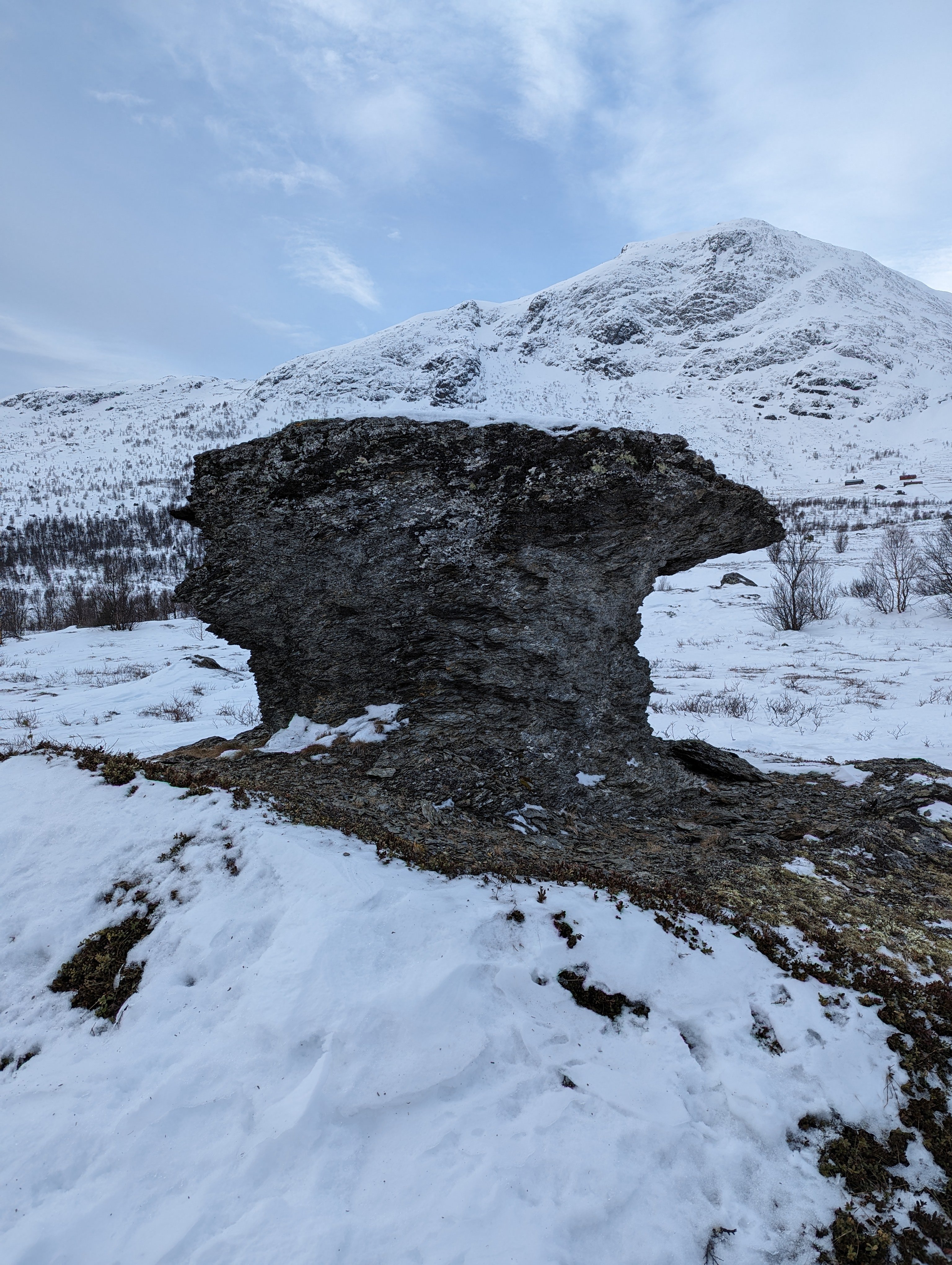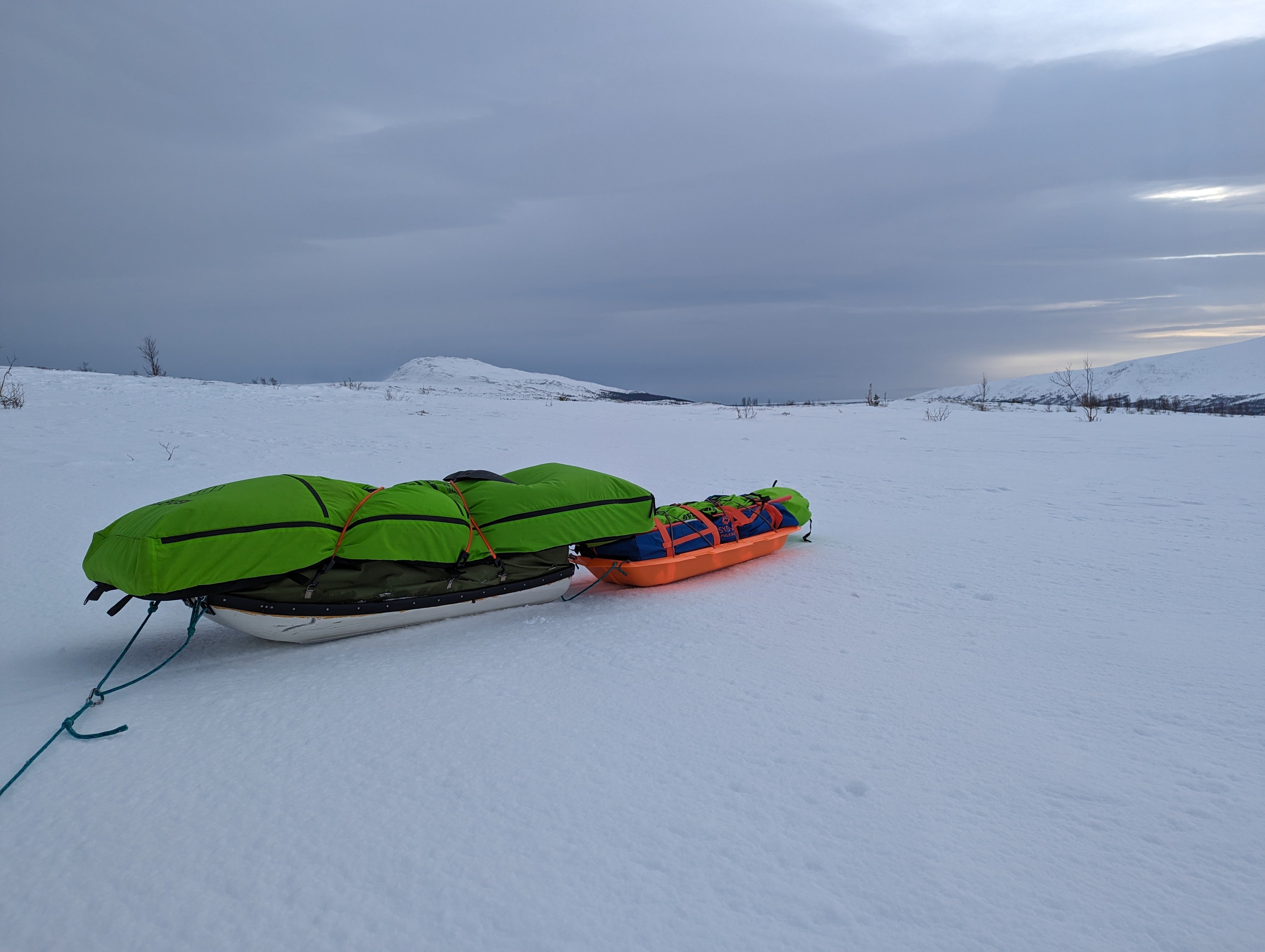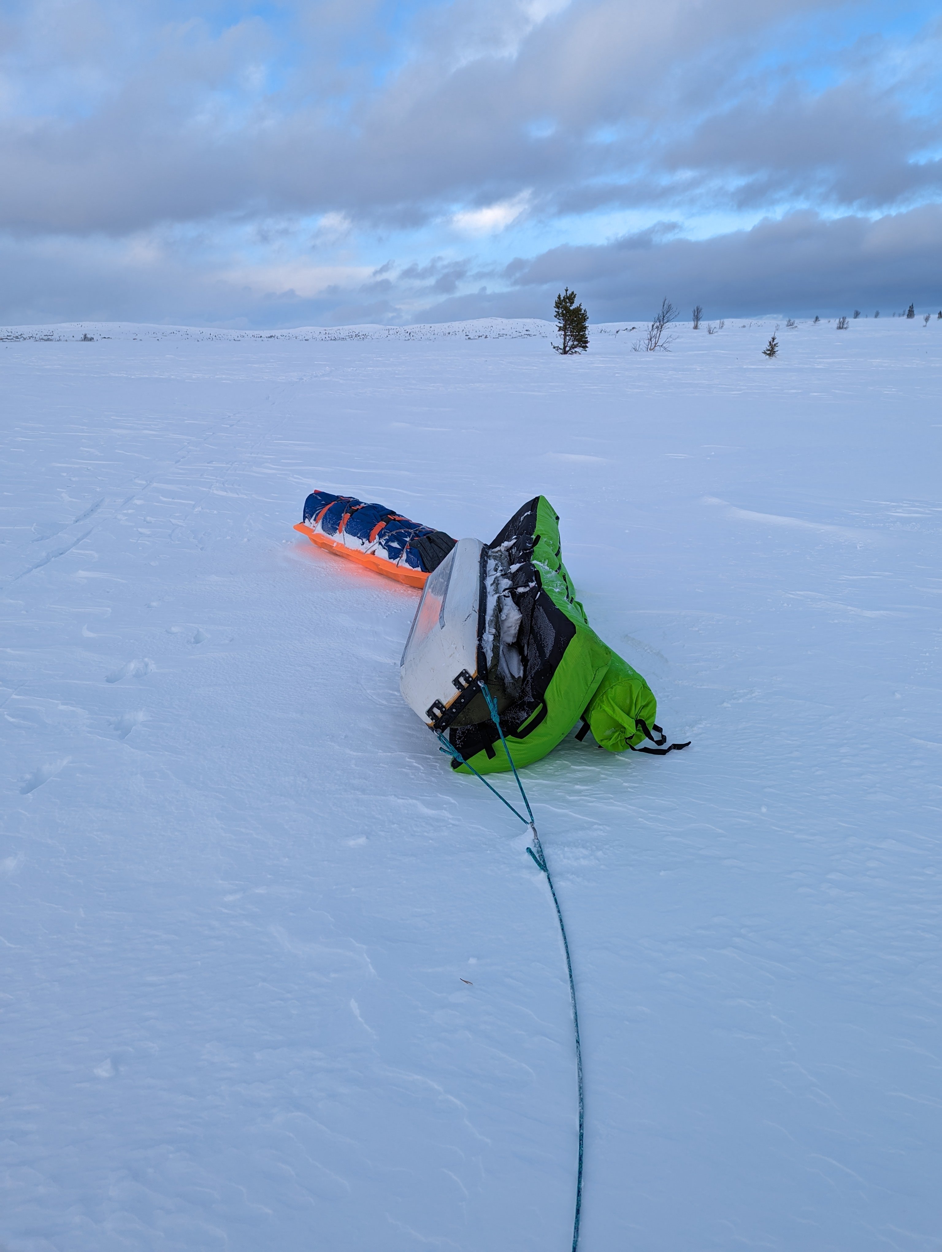 Ja se der, hadde visst nevnt det tidligere og Jeg hadde brukt det du foretrekker. Jeg hadde gått for taudrag igjen, men det partiet der det ble ordentlig bratt nedover tok jeg av meg skiene og gikk ned med pulken foran. Sånt er jo enklere med stivt drag.