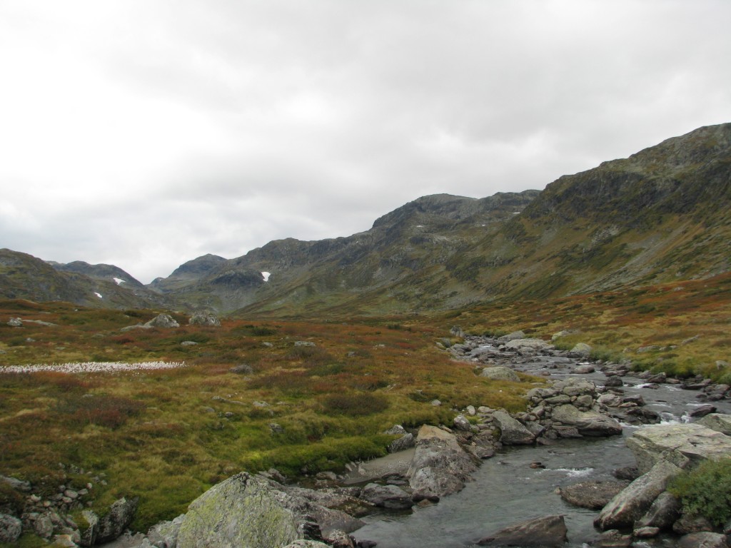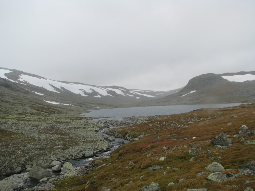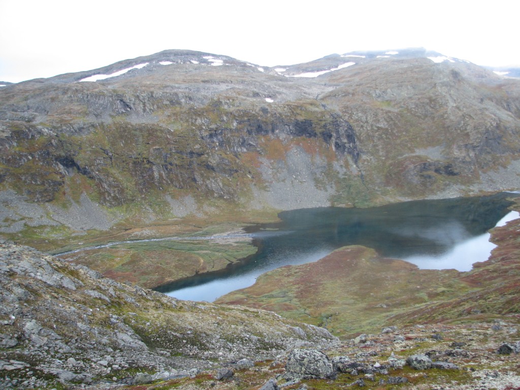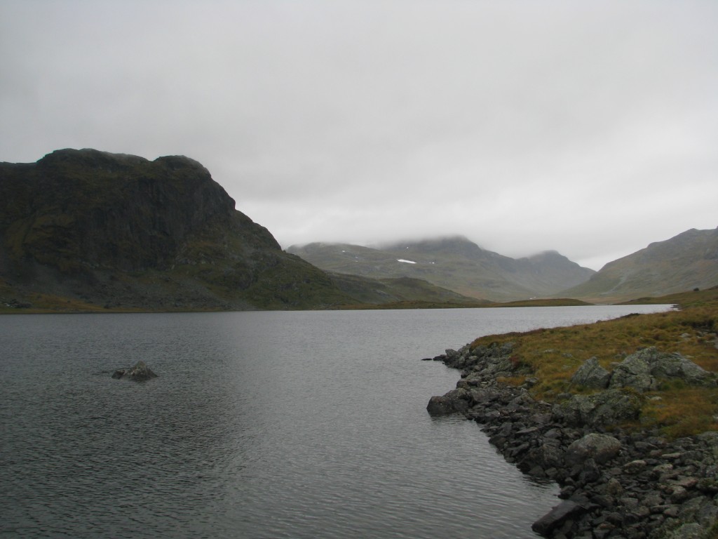 Egentlig skulle jeg gått denne turen med to forskjellige kompiser i fjor sommer og i år, men de ble av diverse grunner avlyst begge gangene. Dermed bestemte jeg meg for å pakke sekken og å ta med bikkja for å gå turen alene. Utgangspunktet var hytta vi har på fjellet i Ål, for så å ta seg gjennom Skarvheimen til Lærdal. Værvarselet for uka var gode. Det var stort sett meldt opphold og bra vær, men som alle vet så kan det fort endre seg til fjells. Onsdagen startet med å finjustere sekken, sjekke at alt utstyret var på plass, for så å få i seg en ålreit frokost. Været var ålreit, og skulle etterhvert vise seg å bli veldig bra. Jeg startet fra hytta kl. 10, og slo opp teltet ved Olsennvatn rundt kl. 17. En sjutimers gåtur i et terreng som startet med skog, for så å ende opp på vidda. Natt til torsdag var det minusgrader, men soveposen holdt varmen. En helt blå himmel dagen før var nå forvandlet til en grå himmel med en god del tåke som lå spesielt over Reinskarvet. Denne dagen var planen å ta seg til Iungsdalshytta, midt i hjertet av Skarvheimen. Jeg gikk til Djup, et stort vann som jeg skulle følge helt til hytta. Å gå grusveien vest for Djup virket kjedelig, men enklest. Tåken forsvant etterhvert, og sola tittet frem i perioder. Jeg kom frem til turisthytta rundt fem, og tilbrakte natta der. Fredag var det meldt litt regn tidlig på dagen, men etterhvert skulle det bli opphold. Dette skulle dog vise seg å ikke stemme. Jeg skulle gå innover Fødalen for så gå over fjellet til Kvevatnet. Dagen startet bra, og Fødalen er en vakker dal med bratte fjell og en fin elv. Etterhvert bestemte jeg meg for å gå inn i en sidedal over fjellet. Her var det ikke annet en stein, stein og stein, og så kom så klart tåka. Jeg kunne ikke se mer enn rundt 100 meter foran meg. Steinura tok aldri slutt, så jeg ble etterhvert litt stressa når det ikke var mulighet for å slå opp teltet noe sted. Etter fire timer med hopping fra stein til stein, kom jeg etterhvert fram, lettet over å ha kommet frem før det ble mørkt. Jeg fikk slått opp teltet, spist litt mat og lagt meg for å sove rundt kl. 20. Lørdag skulle jeg følge grusveien helt ned til Lærdal. Det hele startet bra klokken halv åtte om morran, men jeg klarte på en utrolig måte å trokke over mens jeg gikk på grusveien. Dermed hadde jeg flaks som fikk sitte på med en lastebilsjåfør som kjørte opp matrialer til en hytta som skulle bygges. Uansett var det en fin tur, så her følger noen bilder.