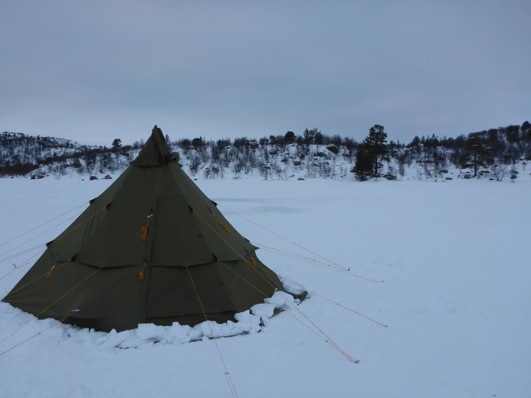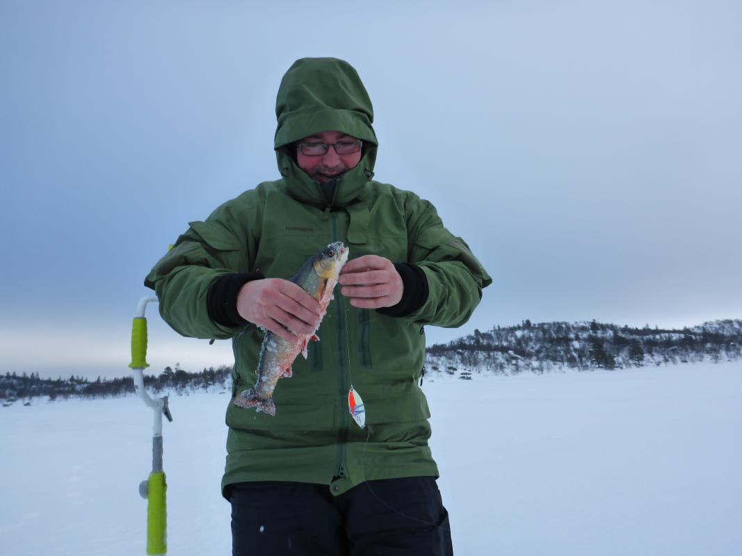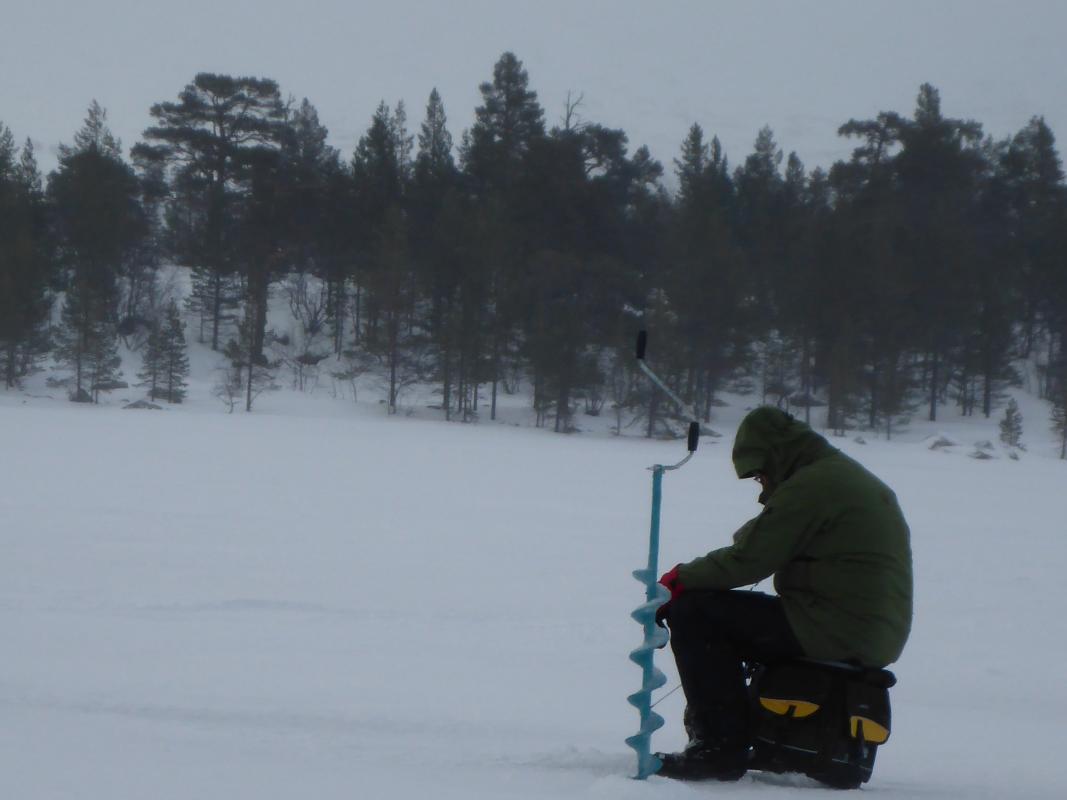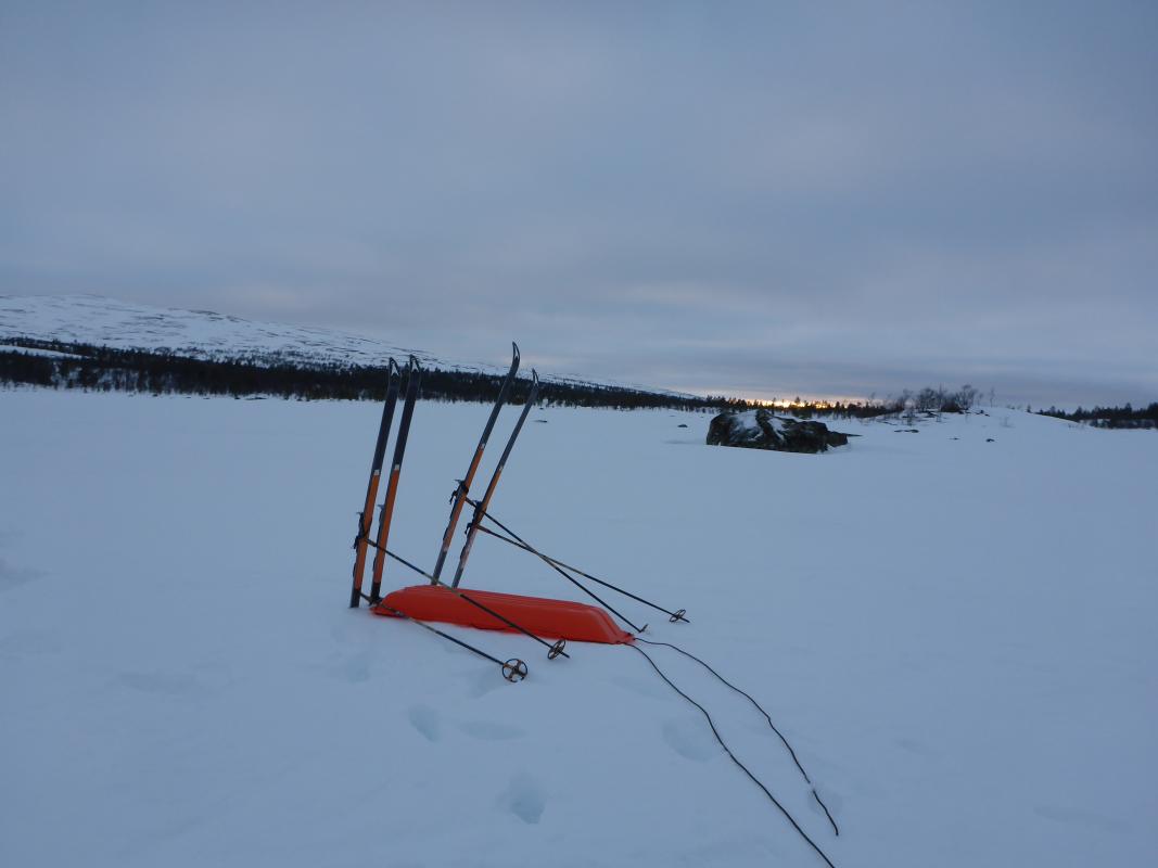 Vinterferie stod for tur. Tradisjon tro dro jeg og bror oppover mot et fiskevann i Engerdal på jakt etter røye. Det var meldt lite vind og ikke altfor mange minusgrader, dette lovet godt! Etter 4 timer i bil, innlagt pølsestopp, en times pakking i pulk og en drøy time på ski i varmt vær med lite vind var vi framme. Vi så til og med sola.. For å ha kort avstand til fiskeplassene valgte vi ny leir for året. Den første dagen bestod kun av transport og etablering av leir. Men tre lange dager var satt av til å lure fjellets fisk. Ski er parkert og sola på vei ned. Boligen, denne tåler mye.. Første dagen var vi på isen kl 07. Vinden hadde tatt seg opp i løpet av natta, men allerede neste dag skulle den avta. Den første dagen ble derfor en kald affære. Men vi holdt ut med på isen til kl 17. Og da middagen var inntatt kl 18 ble det jammen fort mørkt. Vinden løyet aldri, og satte en liten demper på turgleden. 8-10m/s er i overkant. Vi frøs ikke, men den konstante vinden setter en demper på fiskeopplevelsen. Dessuten var det altfor kaldt til å ta masse bilder av fisk. For selv om det ikke ser sånn ut her, så ble det faktisk litt fisk med hjem. Ingen kjemper, men noen solide middager ligger i fryseren og venter. Jeg gleder meg allerede til neste tur!