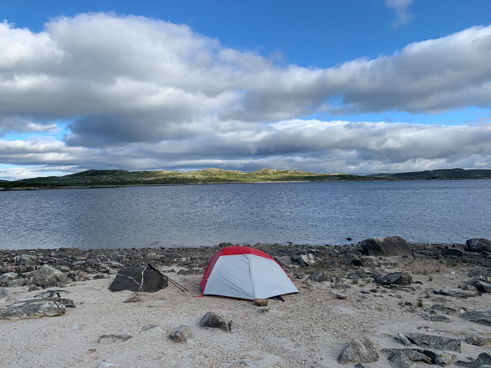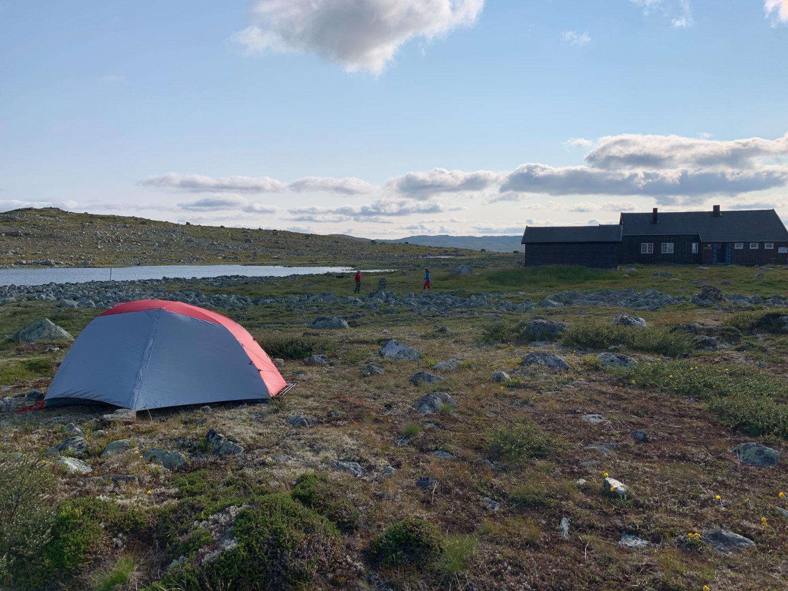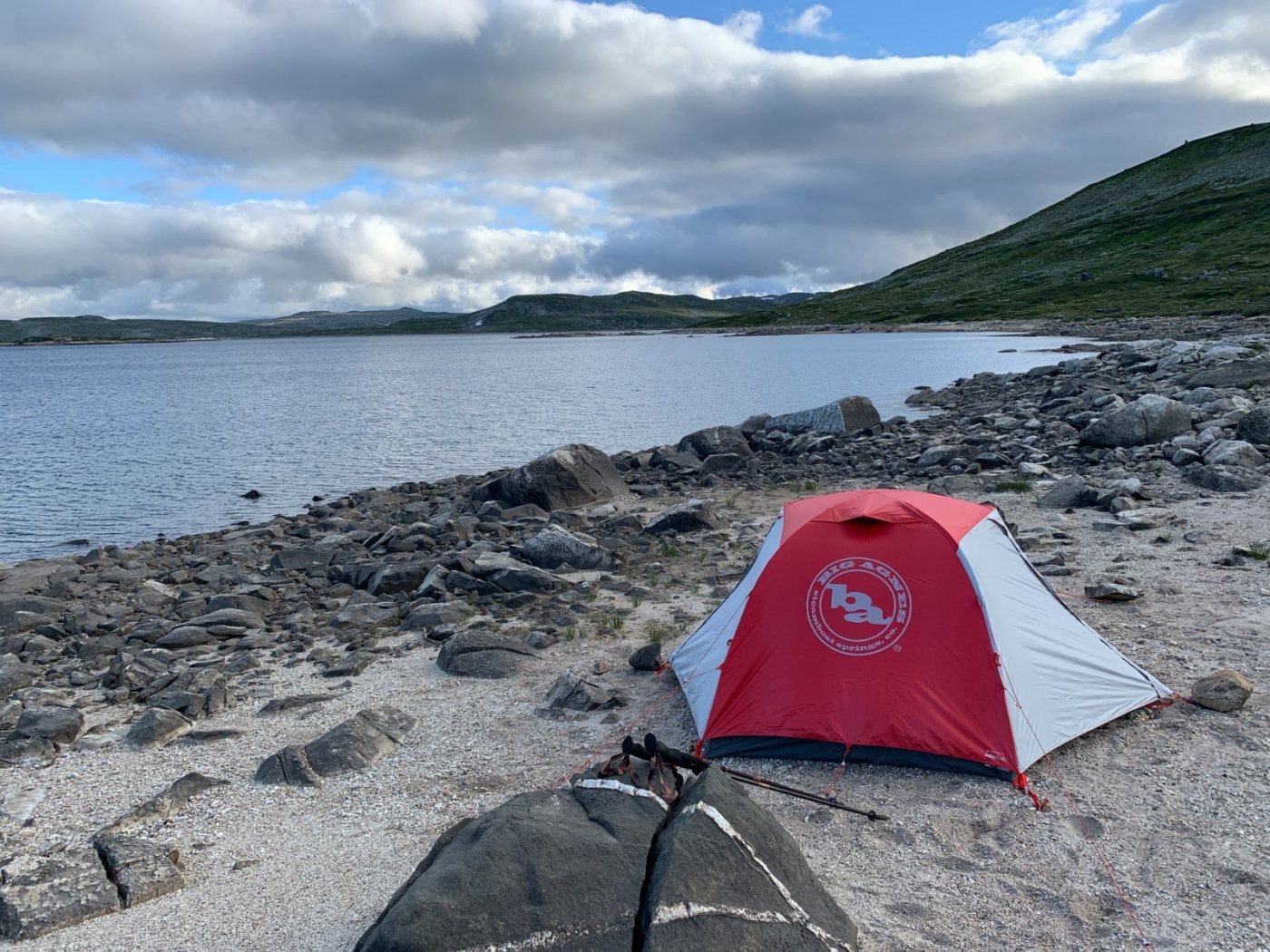 En liten rapport etter 3 netter i mitt nye Big Agnes Copper Spur HV2 Expedtion. Turen gikk på Hardangervidda, fra Haugastøl til Mogen. Må si jeg var litt spent på et amerikansk 3-sesongers med løs ytterduk. Har et Staika fra før so for meg blir referansen for et 2-manns fjelltelt. Med en god del vind de 3 første dagene, anslagsvis i området opp til nominelt 8-9-10 ms, ble det grei test på vindegenskaper og jeg har vel fått bekreftet at valget av Expedition utgaven var det riktige - for meg. Forskjellen mellom Expedition og non-expedition utgavene (foruten en vektforskjell på ca 1 kg) ligger i at Expedition bruker hel duk i innertelt, har kraftigere stenger, kraftigere duk osv. I tillegg er altså innerteltet i Expedition "hel ved" og ikke kun mesh. På Expedition kan du heller ikke bruke yttertelsdøren som "Baldakin". Det blir litt vektforskjeller mellom disse versjonene, Expedition til venstre. Mitt eksemplar veier inn på akkurat 2.4kg: Det skulle fort vise seg at akkurat tett innertelt var lurt - med ventilasjonspanelene helt åpne trakk det merkbart når det blåste som mest. Med litt justering av åpningene ble det etterhvert riktig så lunt og fint inne i teltet. Argumentet om at "det er greit å ha god sovepose, for det trekker mye i innerteltet" (klarer ikke å finne igjen den kommentaren fra en annen tråd) ble viktig for mitt valg av modell. Teltet takler vind forbløffende bra! Litt positivt overrasket - konservativ som jeg er, har jeg nok vært noe skeptisk til "rakkelverket" av et stangskjelett, men innså ikke at "edderkoppen" med stangkryss i midten faktisk utgjør to relativt avstivede trekanter, med den stivheten det innebærer, kontra tradisjonelle buer som krysser. Innerteltets innfesting, med klips over stengene, bidrar også til avstivningen. Resultatet er at teltet leer seg knapt i vindkasta, ihvertfall i de styrkene jeg opplevde disse dagene. Oppsett i vind gikk greit: jeg plugget ned innertelt først, med fotenden opp mot vinden (hodeenden er den halvdelen av innerteltet som innerteltsdørene åpner for). Teltet har grå og røde koder for fot- og hodeende. Sett opp stangskjellettet og tre de på plass i maljene sine. Hekt på klips til innertelt og fest tverrstanga til slutt. Så kneppes de grå klipsa på ytterteltet i fotenden fast. Hold duken samlet og fest borrelåsene som sitter under hvert bardunfeste rundt stengene. Dette er viktig, ihvertfall i vind - du forankrer bardunen til stanga på denne måten, slik at bardunen ikke bare er festet i ytterteltsduken. Fortsett "medvinds" til du har kneppet fast duken i de røde klipsene. Stram så opp ytterduken i hvert av de fire klips-festene. Deretter barduner. Av en eller annen uforståelig grunn har BA valgt å sende med 10 plugger, riktignok av god kvalitet, mens du egentlig trenger 12. Merkelig sted å spare penger - det kan kanskje diskuteres om du egentlig trenger de siste 2 - for utspenning midt på endeveggene, men allikevel... Jeg valgte å ta med Hillebergpluggene mine - i hovedsak fordi de er noe lettere. Som det skulle framgå av bilder er det grei plass - til 1. Hvordan noen ser for seg at dette skal være et 2-manns telt er litt uklart for meg. Det finnes ikke mindre enn 12 +1 små og store lommer i innerteltet. +1 er dekslet for lufteluka rett over hodeposisjon -hvis den er lukket, dobler den fint som lomme, men hvis luka er åpen, forsvinner den muligheten. Kjempedigg med så mange lommer! Her har Hilleberg noe å lære! I tillegg finnes det hemper for tørkesnorer "overalt". Sømkvaliteter og generell finish er bra. Innerhøyden er ok, men ikke mer. litt lavt til å stå på kne på underlaget og ta av og på klær, men det går. Har ikke fått testet teltet i regnvær, så jeg skal ikke si så mye om hvordan det vil arte seg, men jeg er kanskje noe overrasket over mengden kondens på innsiden av yttertelt på morgenen når jeg skal leggge sammen teltet. På en teltkonstruksjon av denne arten, med åpne skjørt hele veien rundt, og med masse vind og luftbevegelse, hadde jeg forventet mye mindre av denslags. Innerteltet var helt tørt alle dagene. Den løse ytterduken har jo også den fordelen at jeg ka ta av duken og riste den nesten tørr før jeg pakker den ned. det er litt verre med Staikaen - det kan gjøres, men det blir mer fomlete... Ellers er det grei plass for Jetboil'en - ingen angst for å komme for nær telduken. Lite og ingen effekt av oppvarming i teltet fra matlaging, antar den varmen bare er for kråka. Jeg hadde nok ikke stastet på dette teltet på tidspunkter hvor oppvarming ble viktig - da ville jeg hatt noe med duk helt ned til bakken, tror jeg. Alt i alt har dette teltet vært i overkant av hva jeg ventet - veldig godt fornøyd! På morgenkvisten ved Lågaros Ved Ørteren Grei plass for å fyre opp en liten Jetboil Tomannstelt? Neppe! Sittehøyde med et chairkit er ok Ved Lågaros