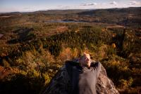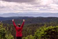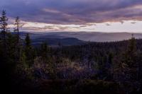 Topptur gjennom Eidsvoll, Østre Toten, Hurdal, Nannestad, Lunner og Nittedal. Onsdag 24. - lørdag 27. sept Disse fire toppene ligger mer eller mindre på rekke. Derfor virket det logisk å ta alle på samme tur. Jeg regna med å bruke tre eller fire dager. I sekken hadde jeg sovepose, liggeunderlag, tremannsteltet, øks, primus, rikelig med mat, og refleksvest i tilfelle skyteglade elgjegere. Jeg ville også prøve å gå en langtur med langstøvler, for å se hvordan det fungerer. Kart: Jeg fikk en god start på onsdag da jeg gikk av bussen for tidlig, men rota meg opp på Skreikampen nordfra. Dette var før jeg "kom inn på kartet", så jeg måtte jukse litt og bruke Norgeskart-appen på mobilen. Det er nok fin utsikt en dag uten tåke, men den får jeg oppleve en annen gang. Etter å ha gått 17 km første dagen, men gjort unna en mindre del av ruta enn jeg hadde tenkt, skjønte jeg at det kom til å bli hardt å rekke denne turen på tre dager. Men jeg hadde noe jeg hadde lyst å rekke, så jeg satte meg mål om å være på Harestua innen kl. 12.00 på lørdag. Jeg ender ofte opp med å gå langt når jeg går alene uansett. Høsten er ei finfin tid, særlig når morgensola treffer det gule. Åsene her er kuttet i småbiter av skogsbilveier, så det ble en del km på disse, da var det godt å ha joggesko. På skogsbilveien er det heller ingen utfordring å gå om natta. Teltet mitt ble søkkvått etter regnvær første natta, men siden det var mørkt og stjerneklart de neste nettene la jeg bare meg i posen under ei gran. Jeg endte opp med å gå 31 km på torsdag. Fredagsetappen var nok det lengste jeg har gått i løpet av en dag, med 48 km etter 17 timers gange. Fem timers søvn før sjarmøretappen over Blekketjernshøgda og Paradiskollen til Harestua var hardt, men jeg var der en time før min egen tidsfrist. Dårlig planlagt selvutløserbilde Dette området har mange topper på 600-700 meter, hvor man kan se langt på klare dager. Jeg vil nok dra tilbake til noen av de områdene jeg hastet gjennom, for å kose meg. Forøvrig så jeg ikke en eneste elg disse dagene, noe jeg syntes var rart. Særlig Snellingen og Fjellsjøkampen var fint. Det jeg lærte: - Bestem deg på forhånd om du skal på kosetur eller ekstremtur, og pakk sekken deretter. Hvis jeg hadde visst at det skulle bli en sånn tur hadde jeg hvertfall sløyfet øks og tremannstelt. - Langstøvler funker helt greit, med gode ullsokker i. - Alltid ha kart - Det er slett ikke dumt å stå opp før sola - Kalde bønner er grei mat Jeg begynte å pusle med kommunetopper i vinter, og det er vanskelig å slutte. Nå har jeg bare fire topper igjen før jeg er ferdig med Akershus sine kommunetopper. -