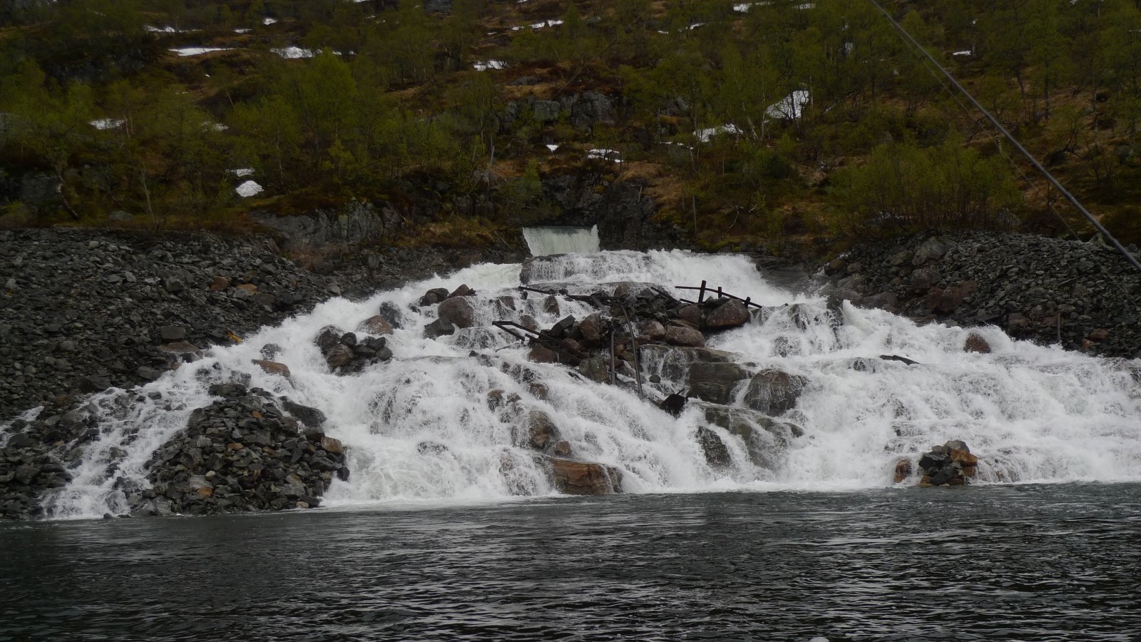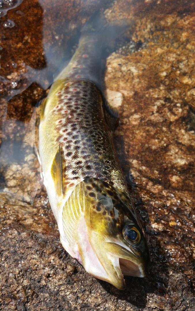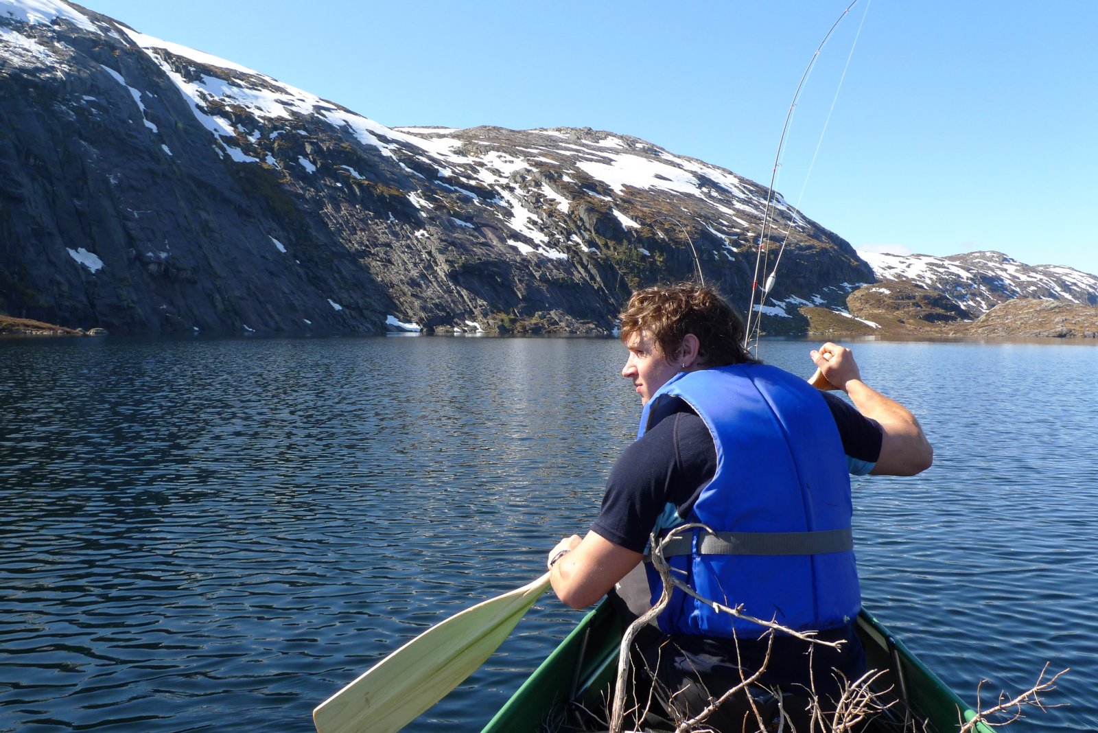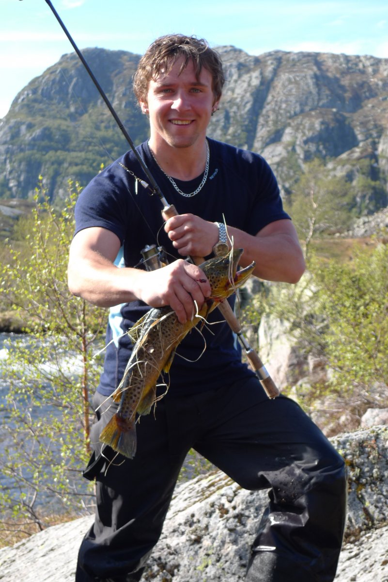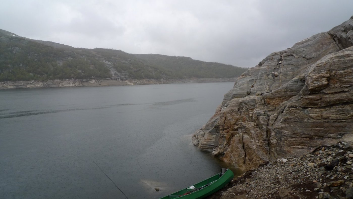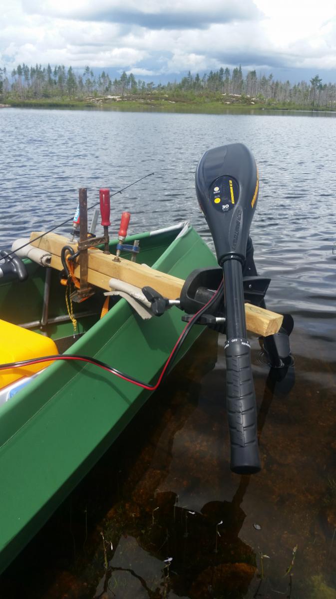 Har vært en tur i Mykland og testet den midlertidige løsningen med EL-motor og Ally kano, fisk ble det også! Værmeldingen så dårlig ut, spørsmålet var om jeg skulle være hjemme eller dra på tur i uvær, svaret var enkelt, det ble tur. Planen for denne turen var å teste noe jeg lenge har hatt lyst til å prøve, nemlig å motorisere Ally kanoen. Da jeg ikke hadde noe feste til kanoen, lagde jeg og faren min et selv på kort tid. Vi skal forbedre dette, men om en bestemmer seg 10 minutter før en skal gå er dette en foreløpig løsning: To 2 tommers planker ble skrudd sammen, og det nederste sporet ble frest et spor i som passet med den tverrgående aluminiumsrammen som er i kanoen (se bilde). Den ene siden stakk noe ut som feste og myke biter av liggeunderlag beskyttet kanoen fra trykket. Vi festete 3 tvinger og en jekkestropp over og vips, så satt motorfestet «som heia»! Jeg dro opp til Mykland og inn i Saurdalsvassdraget, dette fordi plassen har lange sammenhengene vannområder, noe som gjør det enkelt å få testet om det fungerer med EL-motor på Ally kanoen. Målet var å komme så langt inn som til Flekevatn (Har vært her før på vinteren), det er ørret og abbor over kiloen her. Etter at 9 effektive kilometer var tilbakelagt var resultatet på fiskefronten en ørret og to fine abbor. Det blinket rundt meg som om noen der oppe tok bilder av meg med en kraftig blits. Torden var det også rundt meg på alle kanter, det var bare et tidsspørsmål før jeg ble kliss blaut. Jeg rakk å komme få på meg regntøyet og spise før det verste regnet startet. Jeg bestemte meg for å gå opp til Flekevatn til fots med fiskestanga, og droppe kanoen. Det ble kun ett kast før jeg snudde (vrient å kaste fra land der jeg var). Regnet pisket mot ansiktet, det lynte og tordnet og det tok ikke lang tid før jeg blaut tvers igjennom gore-tex tøyet. Hjemturen gikk fortere, da EL-motoren ble skrudd noen hakk opp. Jeg tok stadig hendene mine nedi vannet for å få varmen i de, vannet kjentes varmere enn luften. På hjemturen beit det på sju abbor og fire ørret, de var ikke store. En ting er sikkert, El-motor på Ally kano fungerer supert! Helst bør man kunne kjøre bil til der hvor man skal sette ut kanoen, batteriet til motoren veier litt! Nå skal vi lage en litt nettere og proffere løsning. Les tidligere turer her!