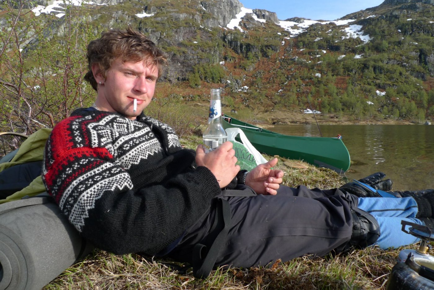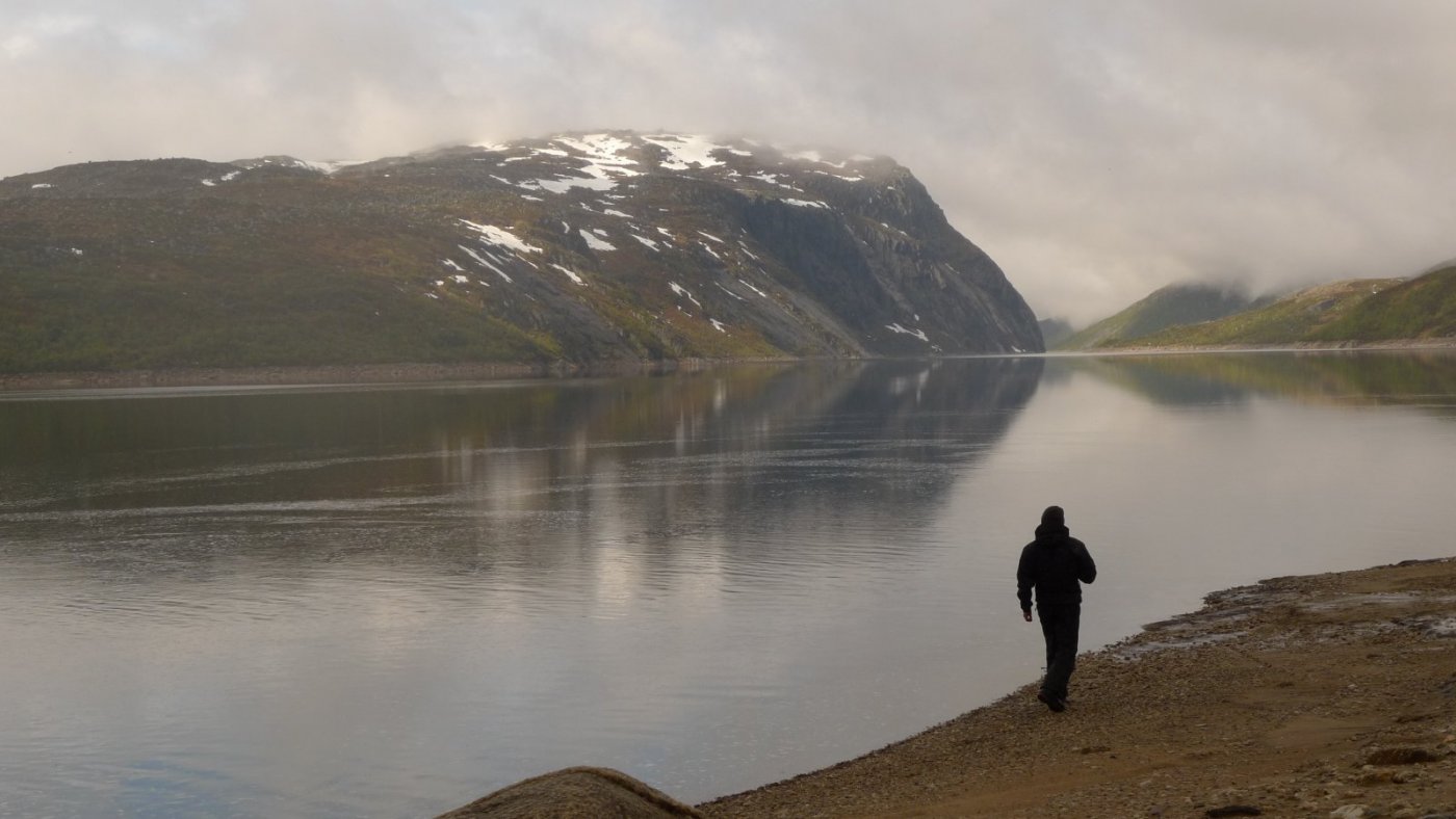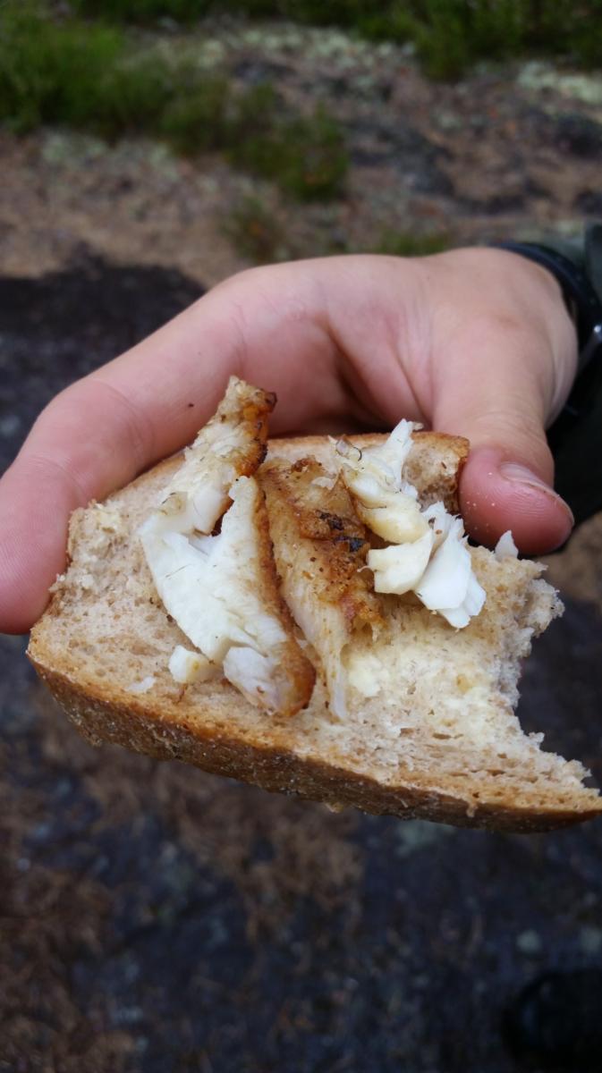 Noen opplevelser vet man at man kommer til å huske resten av livet. Vår første tur inn i Finnmarks og Finlands ødemarker kommer utvilsomt til å falle inn under denne kategorien opplevelser. Her følger en (lengre) rapport fra turen vår. Bildekvaliteten er av type kompaktkamera og fotografen av type amatør. Håper likevel at rapporten faller i smak for villmarksentusiaster. Øvre Anárjohka har vært en årelang drøm for meg. Hvorfor det?, har jeg spurt meg selv noen ganger. Hvorfor ikke Pasvik eller Stabbursdalen, eller et annet virkelig naturskjønt område? Hvorfor ikke Laksfjordvidda eller Ifjordfjellet, eller et annet område som er kjent for godt fiske? Jeg må nok innrømme at det er noe tilfeldig at det ble Øvre Anárjohka, og Lemmenjoki, som ble valgt som åsted for vår første skikkelige villmarkstur, men det har nok noe med dragningen mot den virkelig dype villmarka å gjøre. Øvre Anárjohka er kanskje ikke den mest billedskjønne nasjonalparken, men det er nok den mest utilgjengelige og urørte. I tillegg har man variasjonen - man kan fiske i høyfjellsvann, fyre bål i skogen, og padle i vassdragene. Det er noe jeg virkelig setter pris på. Hele dette villmarkseventyret har jeg delt med Arne. Det gjelder alt fra ide-unnfangelse til gjennomføring. Arne og jeg har en felles oppfatning av hvordan en slik tur ska se ut. Vi deler villmarksverdier. Ingen av oss er fanatisk opptatt av å ta flest mulig og størst mulig fisk, så opplevelsen står ikke og faller kun på fiskelykken, men det er samtidig uhørt å dra på tur uten fiskestang. Begge er også av den oppfatning av at bålet er den viktigste ingrediensen på en slik tur. Dessuten er ingen av oss fremmede for å bære tungt og å gå langt, så lenge dette gir avkastning i form av en fin tur. Vi var begge enige om at vi skulle være avhengige av å ta fisk til maten, men at vi samtidig skulle bære med oss nok til av vi slapp å fiske døgnet rundt. Vi ønsket å gi turen vår et preg av ekspedisjon. Ikke i den forstand at vi setter liv og helse på spill for å utforske nye områder, men at vi skal ta oss fra A til B, gjerne via C og D, gjennom urørt, variert villmark, med navigasjon, leirliv og opplevelser knyttet til ny natur og dyreliv. Ellers har det vært svært lite krangling om rutevalg og gjennomføringsplan. Vi ønsket begge en variert tur, med vandring i skog, myr og på vidde, med padling av vassdrag og vann, og sist men ikke minst med mest mulig urørt terreng og mest mulig oppdagerfølelse. Jo mindre bekk å padle i, jo bedre, om jeg skal sette det litt på spissen. Melkeruta opp til Alta gikk knirkefritt, og vi ble hentet av Olaf på flyplassen. Samme mann sto for overnatting og transport inn til Finland og Kalmankaltio, en tur på nesten 30 mil. En stor takk til Olaf! For meg som aldri har vært nord for Namsskogan, var det mange nye inntrykk allerede på bilturen. Det var en ny landskapstype, og jeg følte jeg var fryktelig langt hjemmefra. Men været var strålende og lysten på å fyre første kveldsbål i Øvre Anárjohka var veldig stor. Etter en siste stopp i Nunnanen og noen kilometer på dårlig grusveg kunne vi endelig parkere på parkeringsplassen som markerer siste utpost før et av Nord-Europas største sammenhengende villmarksområder brer seg ut. Vår eneste bekymring var hvordan det ville bli å bære den tunge børa vi hadde med oss, men det skulle f... meg alvor til før det skulle forskiple turplanen vår. Etter flere år med drømmer og planlegging hadde vi Kalmankalitos sandgrunn under føttene og Allyen på ryggen, og var på tur mot Gállojohka. Og det beste med alt - vi skulle være på tur i nesten fjorten dager, uten å vite noe om hva disse dagene skulle bringe. Frodig. Etter denne vegen trasket vi de første kilometerne. Løs sandbunn, men ellers flatt og lettgått. Fra Kalmankaltio til grensa er det omtrent en mil. Første drikkestasjon når vi krysser Käkkälöjoki, som nettopp har starten sin ferd sørover mot Bottenviken. Tung bør, men godt humør, som man alltid har i starten av turen. Det stiger svakt innover mot grensa, og vi fikk etter hvert litt utsyn utover småbjørkeskogen. Været var upåklagelig. Der hvor stien deler seg ble vi tatt igjen av en finne som vi også så på parkeringsplassen. Denne hyggelige karen fra Rovaniemi tok stien til venstre, som går mot de vestlige områdene av Øvre Anárjohka nasjonalpark. Han hadde nemlig vært der inne på vinters tid, og fått stor ørret. På vår ferd innover mot grensa skremte vi opp flere røyer og ryper (om det var fugl eller mann som ble mest skremt, kan dog diskuteres). Røyene hadde kull med kyllinger, og prøvde alltid å avlede vår oppmerksomhet vekk fra barna ved å løpe hodeløst rundt omkring, som om kameralinsa var et haglegevær og et nærbilde i fokus var en byge med blyhagl. Vi kom etter hvert inn i en rytme hvor vi bar Allysekken omtrent halvannen kilometer hver før vi byttet. Det var det skuldrene våre klarte. Når sekken bikker 35 kg er mangelen på magebelte høyst merkbar. Ved hver pause var det bare å kollapse ned i lyngen og få igjen pusten, før det var å hjelpe turkameraten med å få Allydjevelskapen opp på ryggen igjen. Joda. Klopplagte myrer ved Kalmakaltionjärvet. Vi nærmer oss grensa. Vi fant ut at det beste var å følge stien over toppen av Jorbavárri. Várri betyr fjell, men toppene her på vidda er ikke av det alpine slaget. Allikevel var stigningen fra Kalmakaltionjärvet og opp på Jorbavárri en voldsom kraftanstrengelse. Arne var så heldig å få Allyen på denne etappen, og bestemte seg for å sette opp et helsikes tempo for å få gjort unna slitet så raskt som mulig. Arne er på føttene igjen etter å ha fått igjen pusten på toppen av Jorbavárri. Jorbavárri er ikke rare fjellet, men for en fantastisk utsikt man får ved å bare bevege seg 70-80 høydemeter over myrdragene. Her ser vi for første gang Gállojávrrit foran oss i nord. Dit er det bare