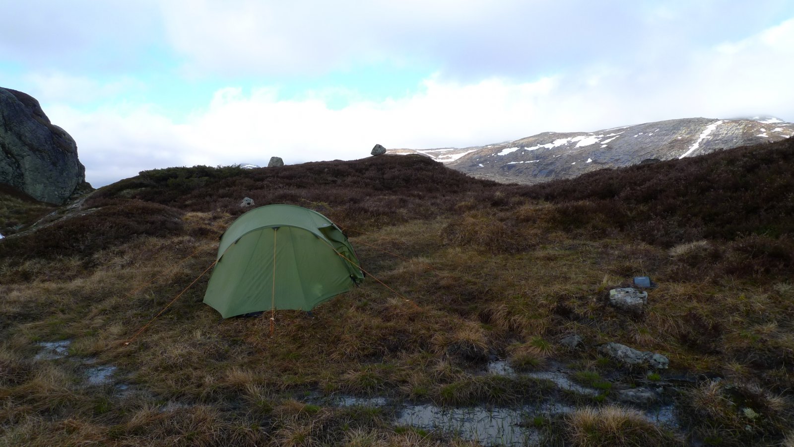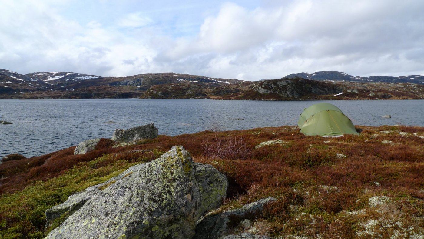 Dag 1: Planlagt: Valldalsvannet – Holmavatnet, 9 timer Reelt : Valldalsvannet – Holmavatnet, 6,5 timer Avmarsj fra parkeringsplassen ved Valldalsvannet, (760 moh), klokken 15:00. Fulgte stien opp til Middalsbu. Dette er en liten omvei, men siden Olaf er ansatt i DNT, så måtte bare denne bli med. En kjapp drikkepause her, før vi dro oss vestover retning Vivassvannet. En anbefaling til andre som skal gå turen, er å holde dalstrøket hele veien, ikke gå innom Middalsbu. Dette fordi den bratte lia som måtte forseres etter Middalsbu, var kanskje den tyngste etappen på hele turen. Første rast etter Middalsbu, var ved steinbuene ved Vivassvatnet, 930 moh. Fremme her klokken 17:00, og her tok vi 30 minutters pause. Fantastisk flotte steinhytter, og her møtte vi også 3 stykk på vei ned etter dagstur til Litlos. Her tok vi en matbit samt litt preventiv taping av føtter. Fortsatte stien videre opp Vivassdalen til vi så Brokafossen. Begynte å bli tungt, slik at det tok sin tid å faktisk komme bort til selve fossen. Underveis her hadde vi kun små pauser for å hvile ryggene våre, før vi tok en lengre pause ikke langt sør for hyttene mot Tyristeinen. Denne pausen ble uansett ikke lang, da vi ble ivrige grunnet mørkets frembrudd. Vi kjørte på imot og forbi Tyristeinen og fikk endelig øye på Holmavatnet (1204moh) klokken 20:50. Etter noen minutter med diskusjon på teltplass, så endte vi opp på S/V-enden av vannet, ved en stor iøynefallende stein. Erfaringer dag 1: Grunnet tunge sekker, så ble «geologistudium» innført relativt tidlig på turen. Dette innebar at vi bøyde oss frem 90%, avlastet sekk fra hofte og skuldre, og lot sekken hvile kun på ryggen. I en slik posisjon, så ble vi kikkende ned i bakken, og derav «geologistudium». Dette fungerte veldig godt på en etappe som både er lang og hvor det skal forseres rundt 500 høydemeter. Da ble det korte effektive pauser, kontra det å hive sekk av og på ofte. Sekkene våre på denne turen ble veid inn til 45 kilo, noe som vi var enige om var i meste laget. (Bilde: Olaf peker på hvor turen startet, Valldalsvatnet) (Bilde: Vi har passert Tyristein og kan endelig se Holmavatnet 1204 moh) (Bilde: Olaf kjenner på følelsen av å kunne fly) (Bilde: Ronny særdeles fornøyd med å være fremme ved Holamavtnet) (Bilde: Forvarming av primus får tankene til å fly....det er fint det !) Dag 2: Etappe: Holmavatn og Kvennsjøen En senere start på denne dagen enn vi hadde tenkt. Tok oss et glass rødvin som oppstart på dagen, kun fordi vi kunne . Denne morgenen var det et relativt utrivelig vær ved Holmavatnet, og når vi var ute på morgenen for å sette sammen kano, så ble det frosne fingertupper. Vi rev leir og var i kanoen på Holmavatnet klokken 11:30 klar for avmarsj. Været roet seg noe underveis i padlingen, men det var grått, tåkete og det regnet kontinuerlig. Uansett en fantastisk opplevelse så høyt oppe, snøen lå godt i sidene på vannet, og det ble mye snakk oss imellom om hvor heldige vi var som fikk til dette. Padlingen på Holmavatnet tok oss 1 time. I enden var det klart for litt bæring, og her ble det litt organisering. Siden vi ikke hadde testet ut bæremåter med kano på forhånd, ble det rett og slett «learning by doing». Vi prøvde oss på å hive sekkene på ryggen, og kano oppslått oppå skuldre/hodet. Dette var en blytung opplevelse, og denne bæremåten ble vi enige om ikke skulle gjentas. Bar kano ned til en liten koie ved vann (moh 1189), og her padlet vi frem til strykene ned mot Kvennsjøen. Ny bæreetappe ned til Kvennsjøen, sekker på rygg og kano i mellom oss. En kjapp matbit i evjen sør for Kvennsjøen. Planla en lengre lunsj her, men regn og vind gjorde at vi valgte å fortsette. Starten på Kvennsjøen var ekkel. Veldig grunt, og det blåste godt. Kvennsjøen er veldig stor, og en skal være forsiktig her. Det var god sjøgang, og vi valgte å padle langs land ved sørsiden. Mye grunnet at vinden var litt roligere her, men også med tanke på eventuell velt. Nå vi kom på spissen av hvor sjøen kveiler seg inn mot Raudåna, så valgte vi å krysse rett over mot den største holmen som ligger ved sørlig bredde. Kraftig vind gjorde at denne turen var krevende på mange måter. Vi merket at det var nødvendig med kontinuerlig padling, hvis ikke tok vinden kanoen på tvers av bølgene. Vi kom oss likevel greit over, og fortsatte mot utløpet av sjøen. Etablerte leir i området Kvennsjø øst klokken 18:00, og da lå «indrefileten» klar til å gripes fatt i på morgenen etter. Mange kurante teltplasser på sørsiden av Kvenno her. En tidlig kveld ble avrundet med litt øl, lapskaus og god varme i teltet. Erfaringer dag 2: Poncho: Kan være kurant å ha med som padleutstyr. Ikke bare som ekstra beskyttelse mot regnet, men også som en god hjelp mot vind Bæring av kano: vi vet hva vi foretrekker nå, men gjerne tørrtren på dette før en eventuell tur, og da med sekker på. Vi fikk virkelig erfare viktigheten av kommunikasjon mellom padlere i en båt, og hvor liten påvirkningskraft den som sitter foran har i kraftig vind. ( Bilder: Because we can ) ( Bilder: Kano slås opp i friskt vær, to svært fornøyde karer som endelig var kommet seg ut på tur. ) (Bilde: Snøen ligger noen steder langs Holmavatnet) (Bilde: Vi har kommet i le ved enden av Kvennsjøen og er klar for å slå leir ) (Bilde: Olaf ved utløpet av Kvennsjøen. Her starter det som mange har kalt for indrefileten, vi gleder oss til å padle her i morgen) (Bilde: kveldens nøye tilmålte belønning ) Dag 3: Etappe Kvennsjø – området Hansbu Vår første utforkjøring sto for tur, og det som omtales som «indrefileten på Hardangervidda». Nydelig padle-etappe i starten, i fantastisk natur. Hær-menn som vi er, så både gledet og gruet vi oss til strykene, men det gikk veldig bra. Så spørs det om vi ble noe overmodig, for vi hev oss på det siste stryket i «indrefileten», og her kunne det gått galt