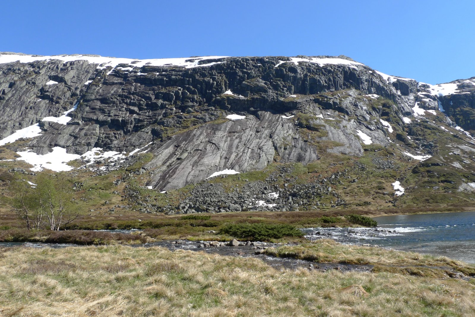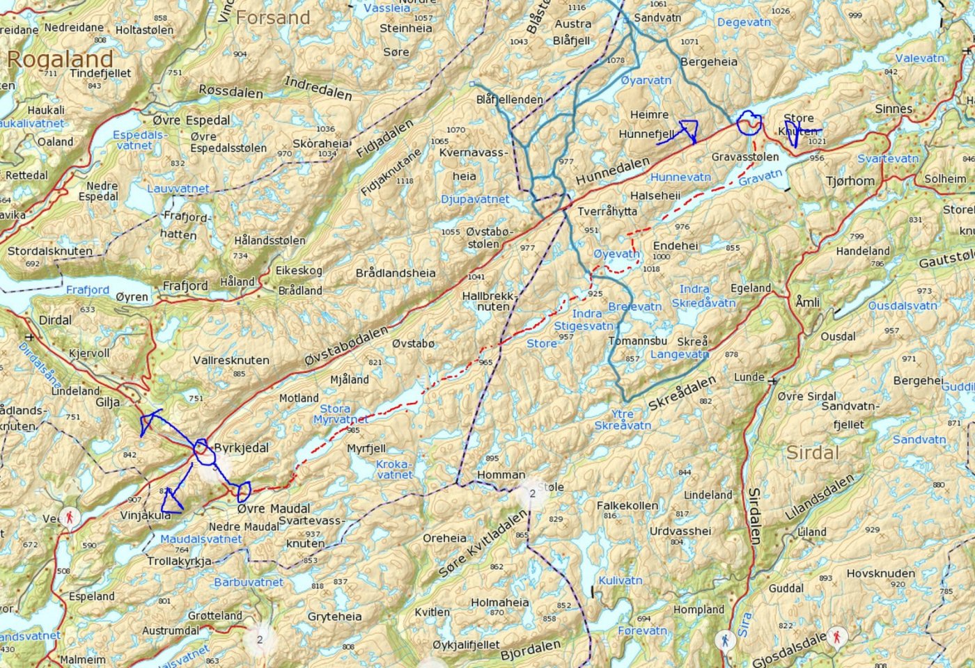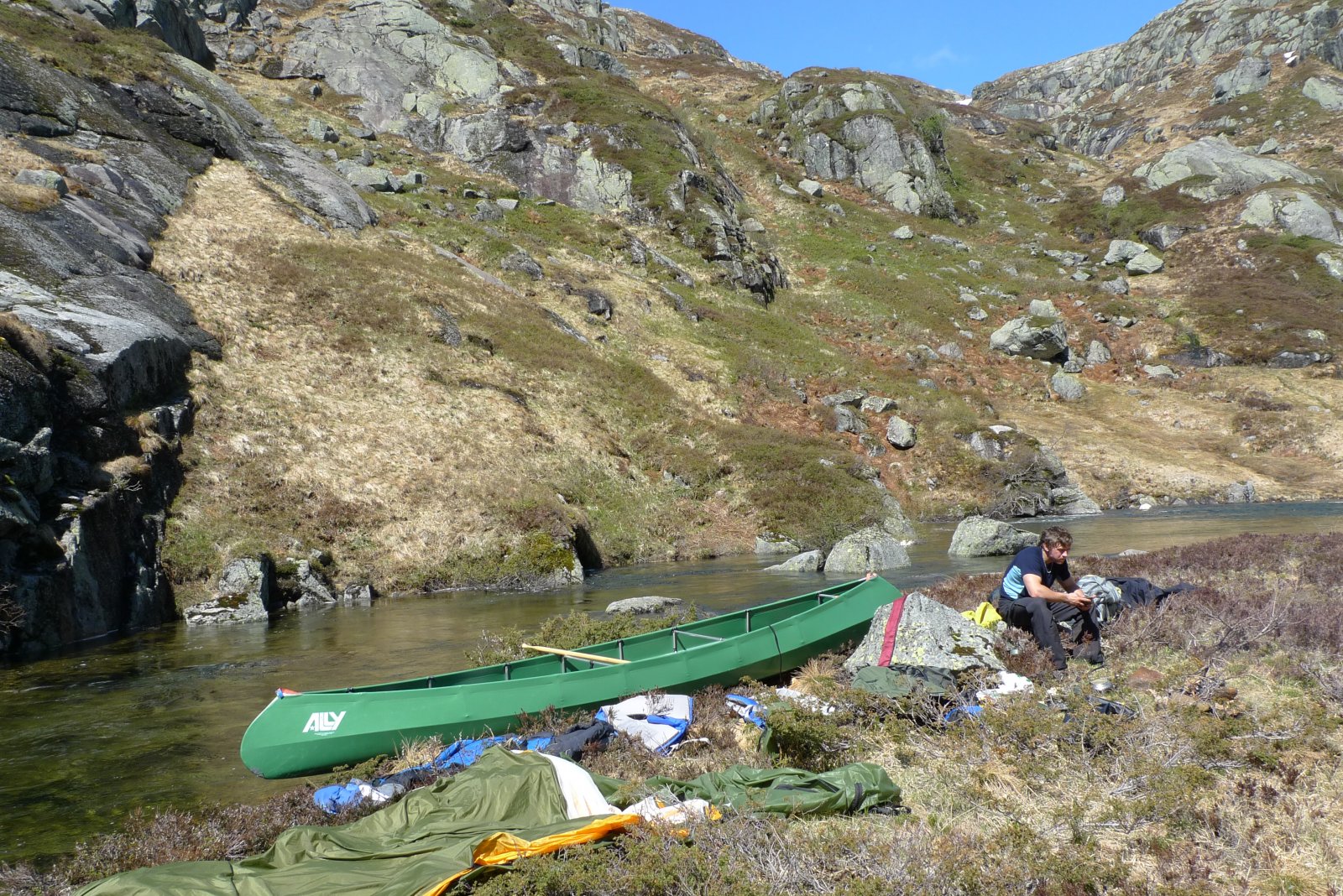 Jeg og en kamerat padlet denne turen som spede frilufts-amatører med en helt ny Ally i slutten av mai 2009. Så jeg skal ikke gjøre de store litterære krumspring i denne turrapporten. Jeg ser også at mine foto-egenskaper ikke står til sammenligning med de produkter jeg leverer i dag. Men det er en svært fin tur som jeg ser tilbake på med gode minner, og som andre kanskje vil få lyst til å gjennomføre etter oss. Vi ble kjørt opp til Gravatn/Langvatn av kjæresten til kompisen min, og vi lempet Allyen ut bakluka ved kanalen som forbinder de to vannene. Padlingen over Gravatnet gikk lett, og vi ankom enden hvor bæringen begynte. Her gjorde vi egentlig en stor blemme og begynte å bære tingene våre med en gang. Men vi opplevde senere at bekken som kommer ned er såpass flat nederst at kanoen kan dras med tau et langt stykke innover. Men det ble god trening da. Vi padlet forbi det vi antar er en tunnel til vannkraft. Det var andre rutiner med opprydning i gamle dager... Vel oppe ved Store Øyevatn satte vi kanoen utpå og padlet til andre siden for teltleir. Det regnet en del. Men vi våknet til opphold igjen neste dag. Vi dro inn til Tomannsbu på dagstur for å la armene og ryggene hvile fra padlingen. Vi var jo ikke kondisjonert for padling og en del muskler var vel støle. Vel fremme laget vi mat og snudde forsåvidt tilbake til teltet igjen. Regn og surt. Dette var vel i slutten av mai så all snøen var heller ikke smeltet bort. Det ble ingen fisk i Store Øyevatn, og heller ingenting i vannet nedenfor Tomannsbu. Tilbake til teltet så pakket vi sammen og forflyttet oss ned til neste vann, Litle Øyevatn. Heller ikke her bet fisken. Padleturen var ikke noe å skrive hjem om. Vi satte opp teltet i en liten skråning, som viste seg å være heller fuktig. Det ble en miserabel natt. Tredje dagen våknet vi til opphold, og etterhvert ble det strålende solskinn. Begge Stigesvatna ble padlet i solskinn, men uten at fisken bet på. Videre kanoferd nedover langs elva gav oss en bra bæring nedenfor fjellet Kjerringhalsen. På et tidspunkt fant vi også godt med tørt vierkratt som vi fylte kanoen med. Dette brukte vi til å steke pannekaker. Og pannekaker smurt med honning fra Tomannsbu smakte noe så utrolig utmerket i lunsjpausen! Fra Heinshølen og nedover padlet vi strykene og det var en svært begivenhetsrik opplevelse for oss ferske kanopadlere. Som bildet viser så brukte vi lunsjpausen i solskinnet til å tørke både telt og annet utstyr. Vi slo oss til ute på øya i Litla Myravatnet og min gode venn dro endelig opp en brunørret fra vannet. Denne bar kraftig preg av aldring da den var full av arr og skrukker. Men tynn som et slips. Mat ble den. Vi tok også frem pilsflaskene vi har unnlatt å unne oss i alle disse dagene. Stemningen med solnedgangen var virkelig verdt regnværsdagene. Fjerde og siste dag kastet vi loss og gav oss til på hjemturen over Stora Myravatnet. En distanse på rundt kanskje en mil med innsjø skulle forseres. På dette tidspunktet husker jeg at jeg sang Eddie Murphy sin "I want McDonalds, i want McDonalds" fra Raw eller Delerious filmene. Også husker jeg at da vi kom inn under granittklippene på Myrfjell så følte jeg meg utrolig liten. Det regnet litt, og regnvannet fosset nedover fjellsiden. Det gjorde et sterkt inntrykk å være i en liten båt under et slikt et massivt fjell. Selv om man i dag har vært på betydelig større fjell lenger nord i landet, så sitter minnene fast. Da vi kom mot slutten så så vi en grotte oppe i fjellsiden. Jeg har tidligere spurt på grotteforumet og det har vært folk oppom og sondert grotta etterpå. Men det krever klatretau og litt ekspertise for å komme seg opp. Kanskje noe for en Fjellforum ekspedisjon å sjekke ut? Vel fremme så gjenstod det en bæring på mange kilometer langs asfalt ned til bommen hvor vi skulle bli hentet. Men det var heldigvis en grunneier med en kassebil oppe ved demningen, og han gav oss skyss helt tilbake til Oltedalstunet hvor en stor elgburger ventet oss begge. Så da ble ventetiden til skyssen hjem ankom betraktelig kjekkere. Jeg er usikker på om minnene fra denne turen hadde vært like gode om vi hadde måttet bære alt utstyret ned til bommen i mange vendinger. Jeg fant dette kartutsnittet i samme mappe som bildene. Litt usikker hva pilene betyr, men ruta er i hvert fall inntegnet.