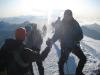 Endelig var et høytrykk på vei og jeg trykket på bestill knappen på SAS sine nettsider. Etter jobben tok et forsinket fly Helge og meg ned til Zürich. Med hjelp av leiebil kom vi fram til Chamonix rett etter midnatt. Den store planen for de fire dagene opp i høyfjellet var GRAND JORASSES traversen. Fra Torinohytta via bivacco Canzio til hovedtoppen. Her trengs det stabilt vær og gode forhold, leste vi. Været var det ikke noe i vei med og forholdene kunne knapt vært bedre. Fortsatt litt snø i rutene men stort sett bra. Etter mange turer til hjemlandet mitt, og mange bestigninger av 3000 topper i løpet av våren /sommeren var akklimatiseringsprosessen kommet godt i gang for min del. Helge, etter flere måneder på havnivå i Oslo, var nok litt mer skeptisk. Men vi begynte med en aldri så liten akklimatiseringstur. MIDI-PLAN traversen. Etter 2 timers venting i kø kom vi endelig opp med gondolen. Ikke hvilken som helst gondol, men en av verdens kuleste, Aiguille du Midi. Traversen fra toppstasjonen og over til hovedtoppen Aiguille de Plan kan til de grader anbefales. Noe av det flotteste en eggtravers kan by på Og ikke spesielt vanskelig heller. Noen punkter med III-er klatring. AD. Dag 2: Etter en natt i Argentiere kjørte vi gjennom den svinedyre tunnelen under MB til Courmayeur. Enda en gondol og vi var opp epå Torinohytta. Derfra gikk vi nok en akklimatiseringstur til en veldig pen topp. Tour Ronde. Pen er den å se på. Bestigningen er derimot ikke av den fineste sorten. Masse løsgods og fallende stein. Dag 3: Med litt norsk charm og Helges italiensk kunnskaper klarte vi å få plass på en full booket Rifugio Torino. Dagen etter skulle altså Jorasse traversen starte. Kl 5.30 var vi i gang og alt gikk etter planen fram til steggjernet til Helge valgte å ta en snarvei i retning Courmayeur. 500 meter nedstigning på null komma niks. Da røyk traversen. Vi har ikke kommet lenger enn halvveis til Aiguille de Rochefort, 4000 topp nummer 1 på den berømte Rochefort eggen. Og den skarpe snøeggen videre så ikke akkurat ut som om man kunne ta den med bare 50% utstyr under føttene. Men, Helge mente det var greit og så fortsatte vi, gikk over A. Rochefort og videre til Dome de Rochefort. Nok en 4000 topp innkassert. Men videre retning Jorasses med bare et steggjern hadde virkelig vært hakket for ambisiøst for ikke å si dumt. Dermed var det bare å gå Rochefort eggen tilbake og ned til Torino hytta. Ved cappuccinoen på hytta (kaffen er god i Italia, uansett hvor du måtte befinne deg) begynte vi å lage erstatningsplaner. Etter noen vurderinger (Jorasses normalruta etc) valgte vi å dra tilbake til Cham for å satse på en spasertur opp Mont Blanc du Tacul. Det var da i overkant kjedelig mente Helge. Så det skulle bli Mont Maudit i stedet. Vi tok en av de første gondolene opp og ved 8 tida startet vi fra toppstasjonen. Været var fantastisk igjen men vinden blåste som faen. Hadde nok ikke vært noe særlig å klatre IV-taulengder på Jorasses eggen i morgenmørke og kuling. Opp Mont Maudit var det derimot helt fantastisk. Islandskapet og toppeggen med utsikt over 3.000 ned til Chamonix. Kl. 11.20 sto vi på Mont Maudit. Det var ikke vanskelig å overtale hverandre å satse videre retning Vesteuropas høyeste punkt. Den arktiske haugen foran oss har en viss tiltrekningskraft. Verken høyden, kulden eller vinden kunne stoppe oss. Kl 13.20 sto vi på toppen. Dagens siste taulag (av mange). Normalruta ned Gouter hadde vært enkelt men dødsrenna under Gouterhytta på ettermiddagen hadde vi ingen lyst på. Så valgte vi å gå tilbake samme vei. Den store utfordringen: Rekke siste gondol kl 6. Og vi var ikke de eneste som hadde dette målet. Det pågikk et race opp Aiguille du Midi. Alle skulle rekke det. Og fra høytaleren hørte man en irosnisk stemme om LAST RUN NOW. Og last runs ble det flere av. Så det holdt akkurat at vi var ved stasjonen kl kvart over 6. Vi rakk da den virkelig siste gondolen og ut fra vinduet så vi de desperate taulagene som kom for sent.
