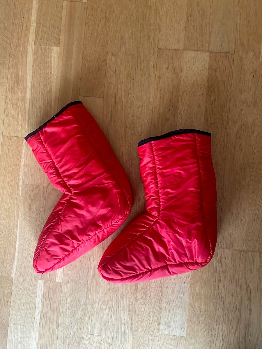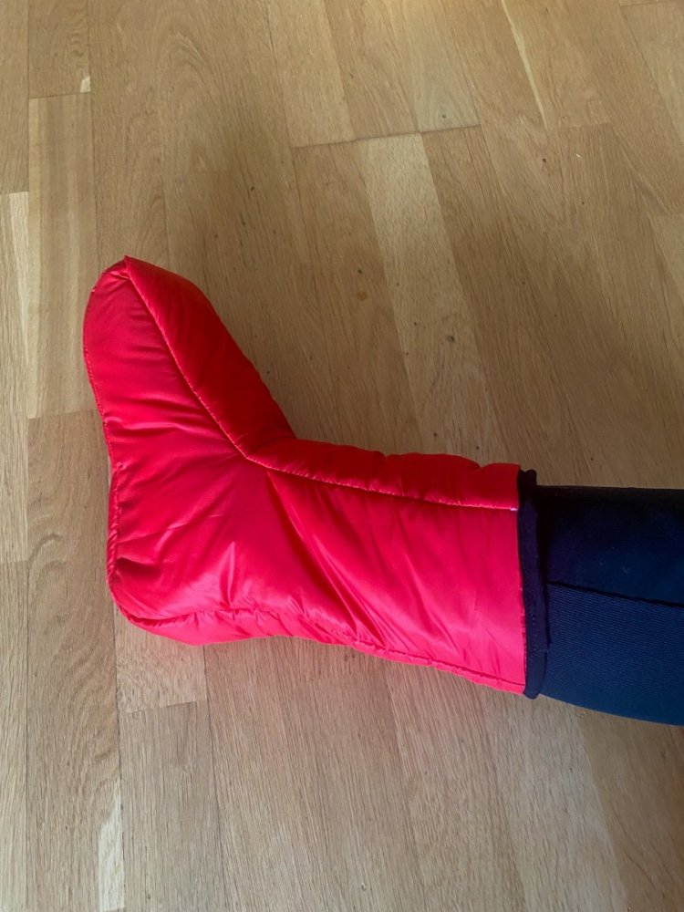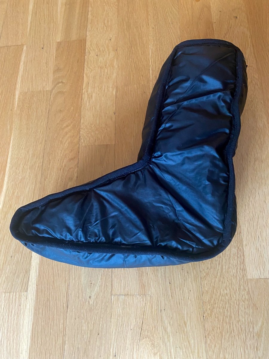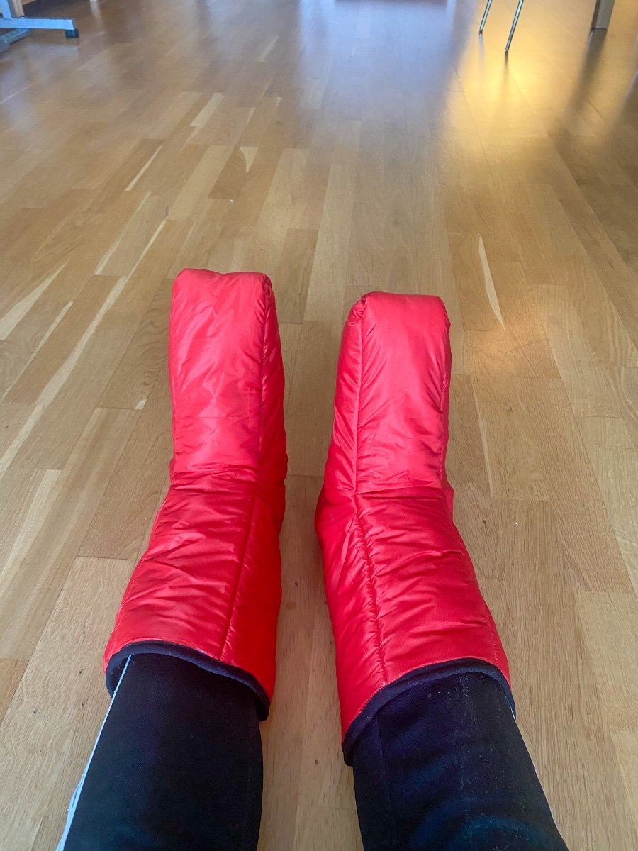 Siden jeg hadde litt ekstra Climashield apex og andre materialer igjen etter å ha laget en quilt, ville jeg prøve å lage et par tøfler aka booties. Tegnet et mønster av foten min i profil og la til et par centimeter. Laget en prototype i papir og justerte mønsteret. Brukte rester av apex i ulike størrelser og laget et lappeteppe som til slutt ga to lag i hvert panel. Dekket alle råkanter med kantbånd. Resultatet ble ikke så verst. De er varme og kan komprimeres mye.
