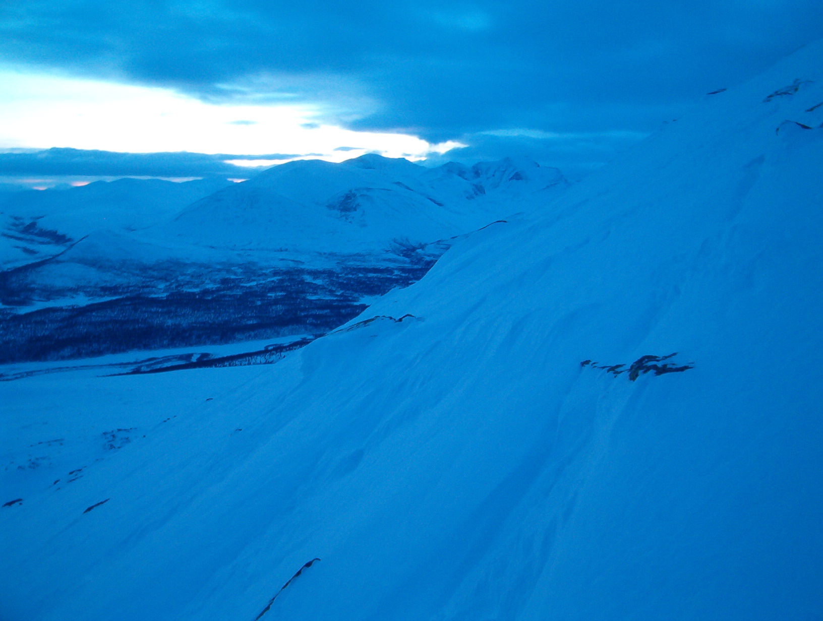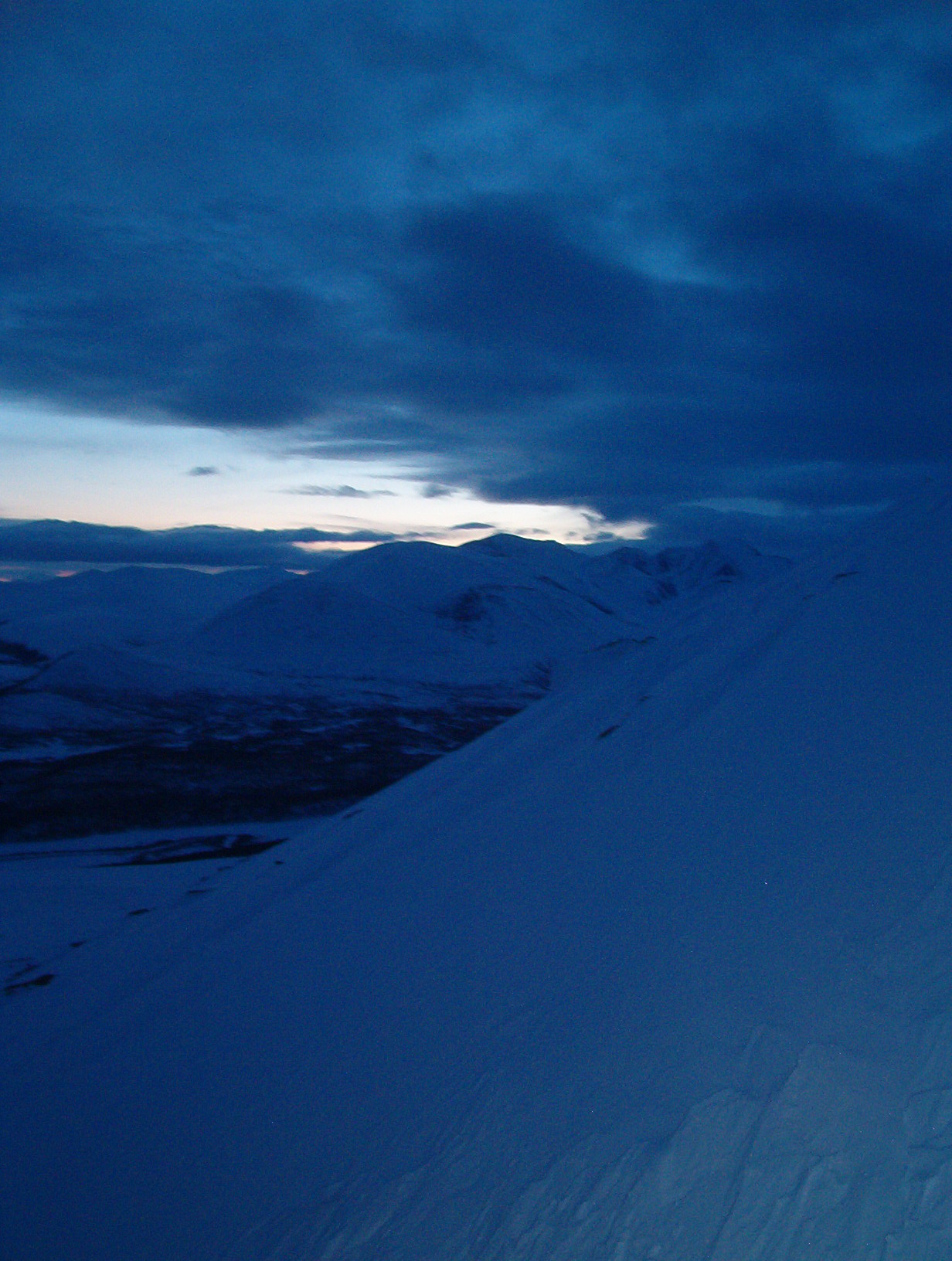 Karret meg opp på Blåkampen, 1621 moh., sola var forlengst borte og kveldsmørket var på veg til å ta over. Måtte selvsagt ta til fornuft å snu der, på "forposten" til Gravskardhøgda. Hele turen ble unnagjort på rundt 2 raske timer, for å nå toppen av Gravskardhøgda så må en nok regne med vel 3 timer.
