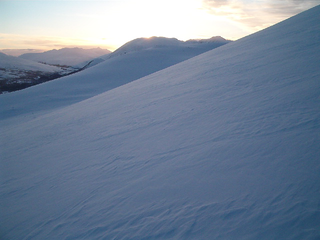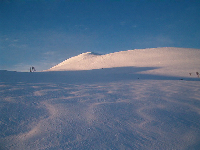 Kjørte gjennom Atndalen i ettermiddag, og fant ut at jeg kunne ta en liten kveldstur på Gravskardhøgda, 1767 moh. Sola var snart på veg ned bak stortoppene i Rondane da jeg begynte oppstigningen i Atnsjølia, så jeg skjønte fort at 1000 høydemeter for å nå til topps kunne bli for hardt. Klokka var passert 17.30 da jeg la ut med nydelige forhold. Skremte ut en hare i lia, der jeg gikk opp, var mye spor etter både rype og hare i nysnøen.