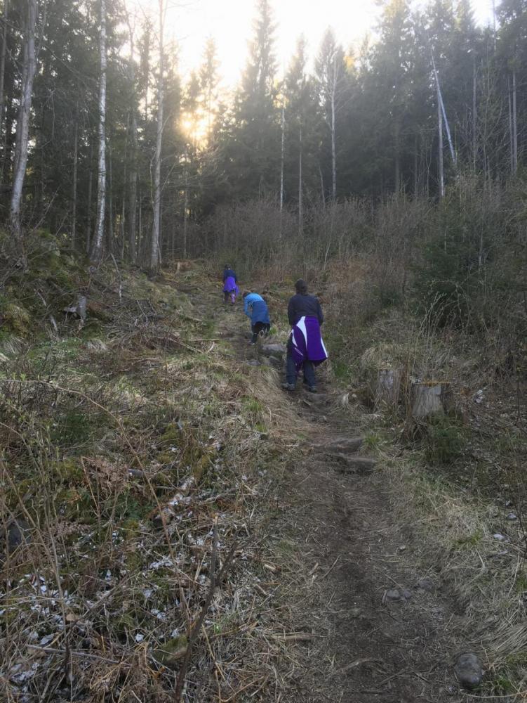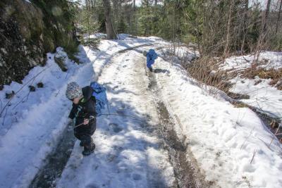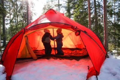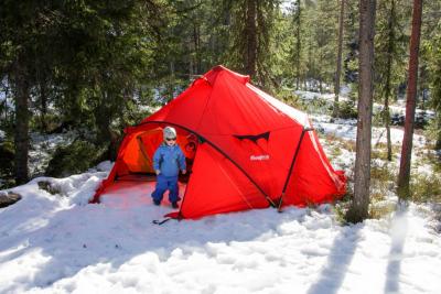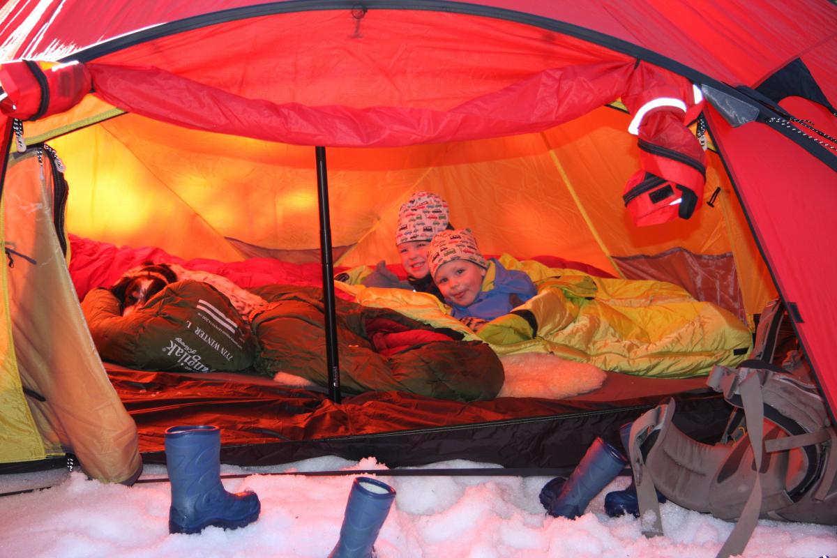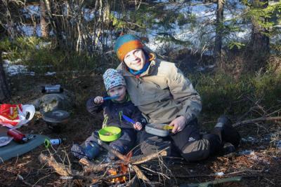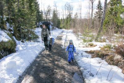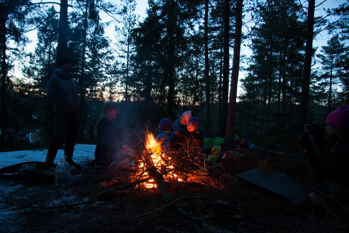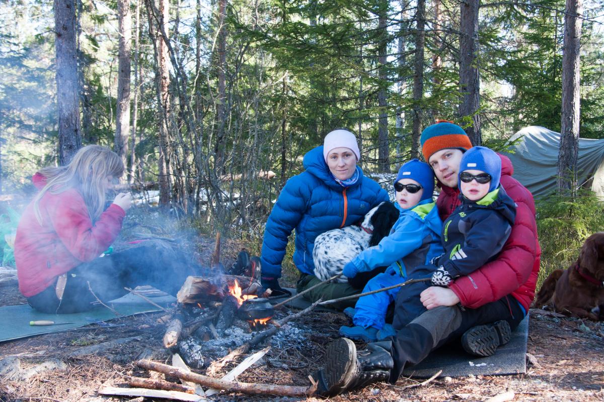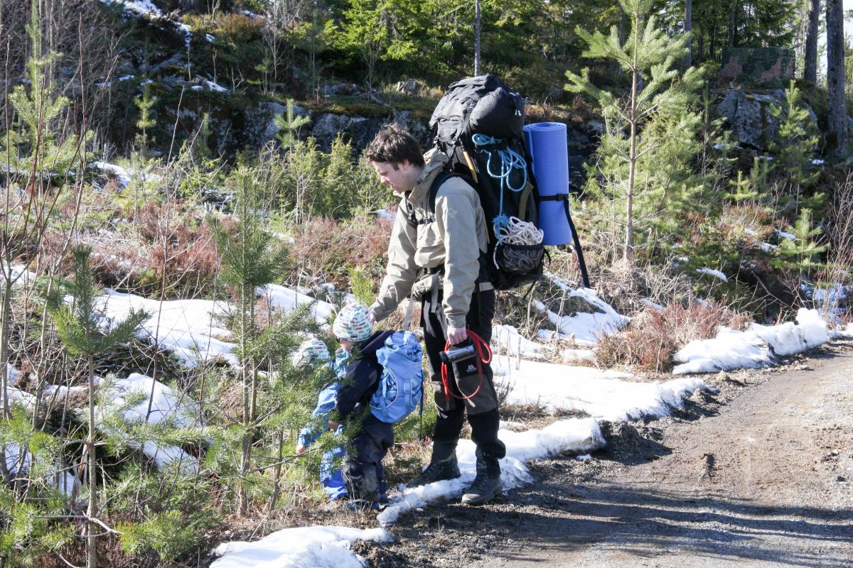 Det har blitt lenge siden november og forrige tur med ungene. Les om den HER. Vinteren har ikke vært spesielt lang eller kald og det har vært mange tanker om tur siden sist. En 1.åring i hus med et noe utfordrende søvnmønster, jobbhelger, enda flere jobbhelger og økende trass på de nå 3 år gamle tvillingene hadde gjort dørstokkmila utrolig lang. Det å ta med 1.åringen på tur vinterstid føltes ikke aktuelt slik som han sov om natta og tur alene med tvillingene i kulda føltes tungt. Jeg var redd for at påkledning og bleieskift ville ta alt for lang tid i kulda. Våren var godt i gang når kong vinter atter slo tilbake og lagde "snøkaos" på østlandet. Dette tok nesten motet fra meg med tanke på når jeg skulle få til tur. Ikke det at jeg eller madammen har noe i mot tur i snø og kulde, men tvillingene har vist seg ikke å være de ivrigste på ski og med snø enda. Da ble det ekstra deilig når godværet virkelig slo til å påsken! Svigermor kunne passe minsten og et vennepar villle være med på tur! Planen hadde jeg tenkt på lenge. Parkere langs en grusvei ikke langt hjemmefra, gå litt innover veien for så å ta av veien inn på en god sti/traktorvei. Denne gikk inn til en hytte jeg brukte å dra til med speider`n i mine yngre dager. Gutta har ikke vist spesielt gode takter når det gjelder gangdistanse så målet mitt nå var at de skulle klare å gå selv og det gikk kjempefint! Tvillingene bar sekken sin med sovepose og kosedyr hele veien og eneste hjelp var en hånd og holde i fra tid til annen. Mange spennende dammer som vi kunne "fiske" i på veien! Vi fant en fin teltplass og vi fikk satt opp teltet, vårt nyinnkjøpte Bergans Wiglo. Kjempetelt!! Ungene syntes det var superstas å sette opp teltet. Mye inn og ut, alle innganger skulle testes. Var så gøy med nytt telt at det måtte prøvesoves med en gang Videre ble det bål og middag. I 19 tiden påsto småtrollene at de ville sove, noe som selvfølgelig ikke var tilfellet. Ville bare turne i teltet. Ble litt jobb med klær som skulle av og på osv. Godt vi var to voksene om jobben. Først etter en god stund til forran bålet var de klare for soveposen og sovnet greit i 2030 tiden. Vi voksene kunne nyte ett par timer ute rundt bålet med den gode samtale før vi krøp inn i teltet vi også. Natten gikk nokså uproblematisk. Emil våknet og ville ned i posen vår i løp av natten. Ble jo litt trangt, men gikk helt fint. Jeg våknet og så på Vetle i løp av natten og han hadde krøpet ut av posen og lå utenfor... Så litt kaldt ut siden det var minusgrader, men han sov godt. Fikk pakket han tilbake igjen uten problemer. Sto ikke opp før 0830 noe de fleste småbarnsforeldre må være enig i at er høyst akseptabelt! Sol og friskt morgenvær. Kunne det vært bedre. Siden det var litt kaldt ble det kokt havregrøt i teltet til frokost før vi trakk ut til morrabålet for en liten kaffekopp før vi sakte pakket sammen og trasket hjem. Turen var en veldig positiv opplevelse for liten og stor. Nå gleder vi oss masse til sommerferien og nye turplaner. Noen som har tips?? Sykkel med sykkelvogn, rallarvegen og nordmarka er noen tanker jeg har. Kano? basecamp på fjellet med mulighet for fine småturer (opp mot 2-3km?) Noen flere bilder