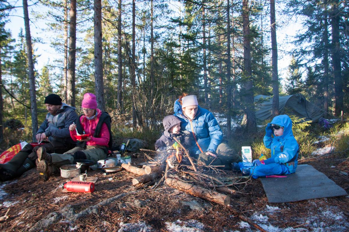 Tenkte å prøve meg på å skrive turrapport. Here it goes! I vinter snakket jeg og min barndomskompis om at vi måtte få til en tur sammen med ungene. Han har en sønn på 5 år, og en datter på 9mnd. Og jeg har en Datter på 4 år og en sønn på 9 mnd. Det var da tenkt en tur med de eldste. Min datter ble hektet på tur- og teltlivet i fjor vår, å har flere overnattinger både i skogen og på høyfjellet. Han på 5 år derimot var helt fersk, men enormt glad i å være ute. Tilfeldighetene gjorde at den helgen vi hadde valgt oss ut, var årets første virkelige sommerdager her i trøndelag. Og ikke nok med det. Men min tremenning, som har barn i samme alder (som min datter går i barnehage med), ble også med. Så lørdag morgen dro vi avgårde til Brungmarka, et lite stykke utenfor Tr.heim. 3 voksne og 4 barn, to jenter og to gutter. Alle hadde stappet full sekkene sine med nødvendigheter, og mye unødvendigheter. Ungene var positive, tross en meget heftig oppstigning på starten av turen. En liten pause på toppen av bakken gjorde godt. Spesielt når påskeharen må ha hatt hull i posen sin i vinter. Han hadde jaggu mistet noe kvikklunsj opp i lien der. Etter en liten pause ruslet vi videre innover, og endte til slutt opp ved Sikatjønna. Det er ca. 3 km fra parkeringen. Ungene var glade for å se vannet, slik at de kunne ta av sekkene sine begynne med fiske. Vi slo opp leir, sanket ved og tente bål for å lage oss lunsj. Pølse stod på menyen. Ungene hadde knapt tid til å spise pølsene sine, de skulle jo fiske! Så her var det bare å få fram fiskestengene. Det ble noe fisking, men lite fangst, men derimot mye leking rundt omkring, og noen "pauser" i teltene. Var greit med to jenter og to gutter. Jentene gikk i teltet og lekte med bamser når de var slitne, mens gutta herjet rundt med andre ting. Ettersom en av ungene ikke hadde sovet i telt tidligere, og to stk. hadde kun et par netter i telt. Samt at vi så for oss "party" i lavvoen ved legge tid, bestemte vi oss for å medbringe egne telt alle tre. Etter mye fisking, leking etc. ble det middag med hamburgere grillet på bålet. Før vi poppet popcorn. Da var ungene helt utslitt og ville legge seg. Alle sovnet med engang. Vi kunne nok alle ligget i en og samme lavvo å spart oss for mange kg. med telt. Uten noe problemer. Da ungene hadde lagt seg, fant vi fram røykeriet min tremenning hadde dratt med seg. Så røyket vi de 5 små ørreten vi hadde fått, som snacks sammen med et par kalde pils ved bålet. Det var veldig godt etter en lang dag! Neste morgen så var det heldigvis overskyet, så både voksne og barn sov relativt lenge før det ble for varmt i teltet. Men i 8/halv ni tiden var alle oppe, og vi inntok en bedre frokost med eggerøre og godt pålegg. Dagen gikk med til fiske, leking og nok en varm lunsj laget over bålet. Før vi måtte begynne å pakke ned telt og komme oss hjem igjen. Turen hjem gikk via maurtuer, se på frosker, trær og andre spennende ting. Slitne unger sovnet tidlig denne kvelden. Det var en veldig hyggelig tur for oss voksne. I løpet av søndag kveld, skjønte vi at ungene hadde hatt det også! "skal vi på telttur neste helg også?" "kan vi ikke dra tilbake og sove i telt ved vannet i natt å?" "jeg vil sove i soveposen i natt". Da var "sommersesongen" for alvor startet. Så får vi håpe vi får mange slike turer i år.