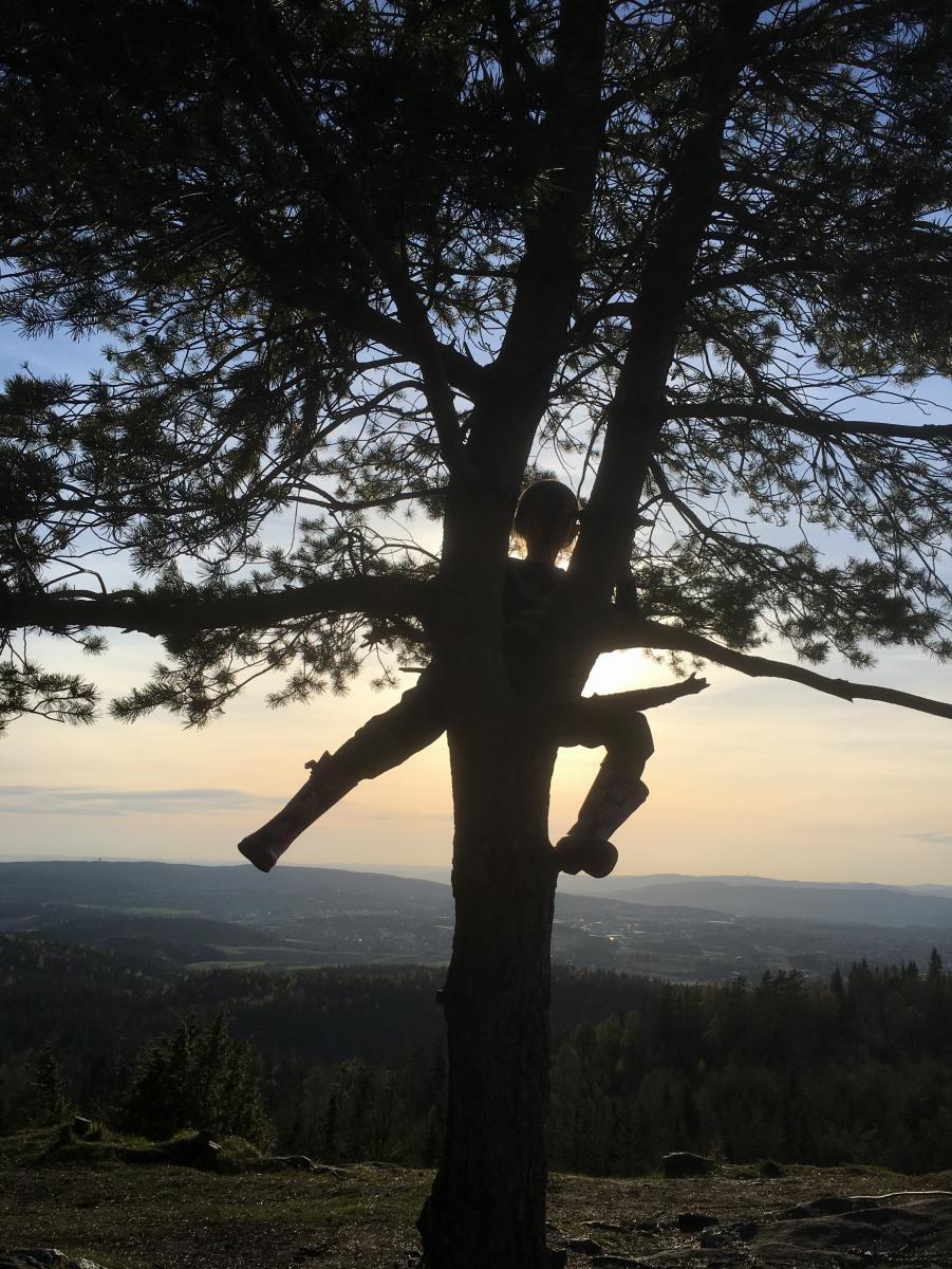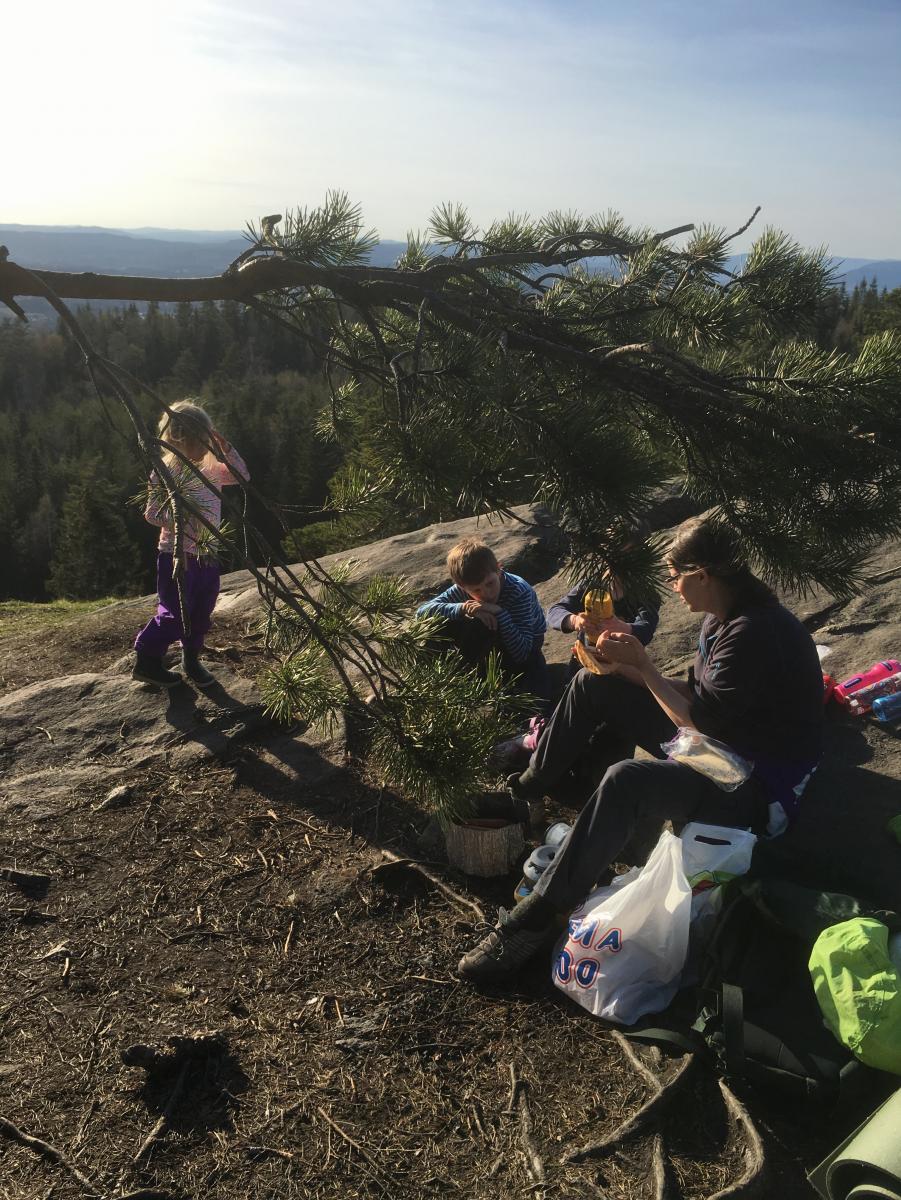 Ja ikke maten altså, men stemningen. Det er en stund siden sist jeg satt og spiste middag med langsom nedadgående sol på tilnærmet skyfri himmel mens ungene slapper av med sitt på alle kanter. Selve middagen var grillpølser med ketchup og sennep. Ikke akkurat Maemo (uten at jeg skal skryte på meg å ha vært der), men ungene var nå godt fornøyd. Vi spoler litt tilbake. Inspirert av @steingrd sitt pappapermisjonsbilde fra Bjønnåsen, påstander om snøfrie forhold i Østmarka og ønsket om utforsking av nye turområder førte til at bilen ble stappet med tre unger, kona ble plukket opp etter jobb sammen med nevnte pølser, og googlemaps dirigerte oss i retning Marikollen skianlegg. Litt rotet skilting i starten, men takket være ut.no-appen, fant vi etterhvert riktig retning. Ungene var klare for å gå på tur, men allerede i første gressbakke skulle minstejenta (5) plukke blomster. Helst alle sammen hun kunne se, og litt til. Ikke snakk om at vi kunne gå før alt var plukket. I første motbakken hadde størstejenta (7) fått stein i støvelen, og eldstemann (9) mente vi skulle stoppe. Prateleken mellom ungene gikk som en foss, men fremdriften turmessig stod helt stille. En kjapp titt på kartet viste at turen ikke skulle være så lang, i underkant av 2 km med 200 høydemetre. I utgangspunktet en relativt kort tur, men nye stier, manglende næring og tullete unger skulle vise seg å være en dårlig kombinasjon. Avmarsj fra bilen var ca fem, toppen nådde vi rundt halv syv. Da måtte mamma inføre femminutters intervaller der ingen fikk lov til å snakke mens nesa og beina pekte fremover bare for å få til tidvis noe forflytning. Minstejenta brøt sammen halvveis opp da hun glemte igjen blomstene hun hadde plukket på en stein hvor vi hadde pause, og de to eldste må minst ha gått 6 kilometer på den relativt korte turen opp. Selv om det var strevsomt nok å komme seg frem, var toppen nok til å være verdt slitet. For en utsikt, og for en ettermiddag å gå på tur på! Himmel og hav. Og middagen var god nok den, i slike omgivelser. Og mamma og pappa fikk hver sin velfortjente kaffekopp etterpå. Ned igjen gikk det vel fort? Ikke hos disse barna. Eldstemann skulle på død og liv vise at han hadde vært på tur, og den beste måten var å få klær og støvler mest mulig skitne. Det var tramping i alle gjørmepytter, rulling i alle mosehellinger, og om de to kilometerne opp ble til seks, ble ikke turen ned igjen noe kortere. Heldigvis fant vi igjen blomstene til minstejenta, og bagasjerommet på bilen takler både støvler og skitne klær. Takk for inspirasjonen, @steingrd, selv om du ikke visste at du ga den! I bilen hjem utbrøt eldstemann at dette var en av de beste turene han hadde vært på!