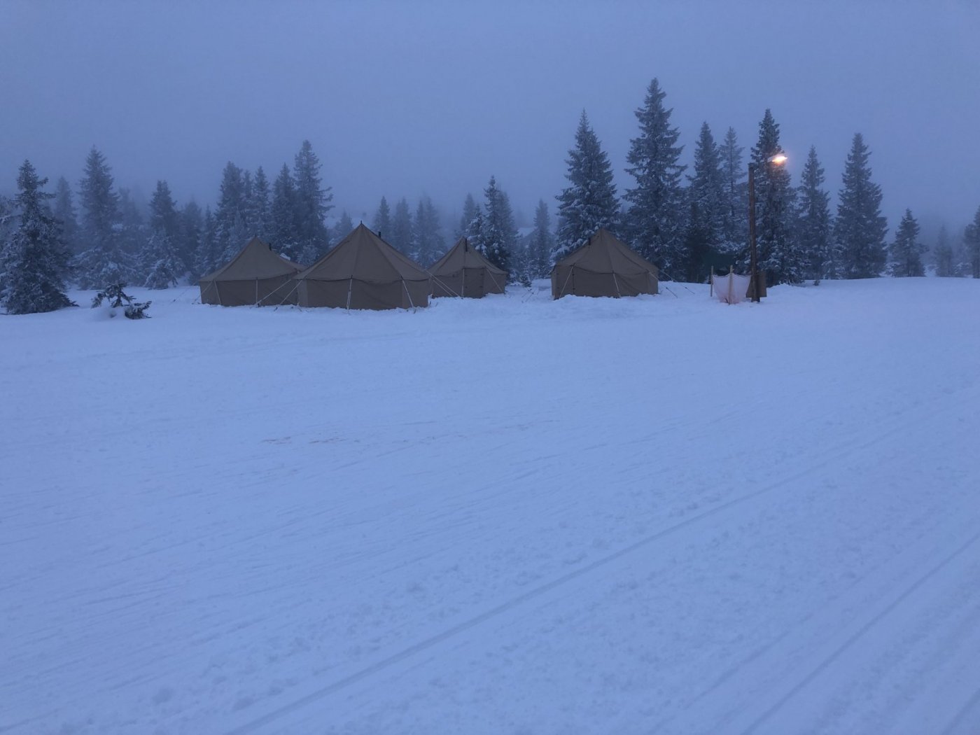 Det er ikke lett å se, men bak lyktestolpen og litt til venstre har en slått opp tarp og køye. Vedkommende kan bivåne det hele uten å forlate køya.