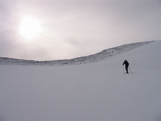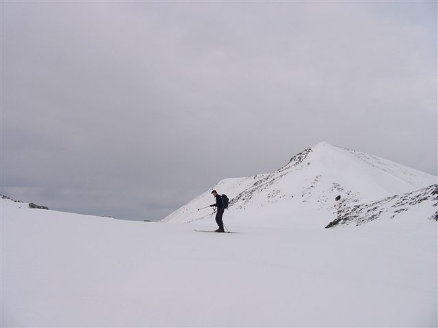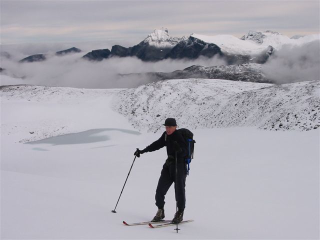 Da meterologene antyda ei lita pause fra restene av tropiske orkaner i helga, var det duket for sesongens første skitur. Det hadde akkurat slutta å regne da jeg dro hjemmefra tidlig lørdag morgen. Oppover Romsdalen låg fortsatt skyer og tåke massivt nedover fjellsidene. Ut av tåka og ned fjellsidene kom det bekker og fosser overalt, ned i en dal fylt av gulsprakende lauvskog. Ved Verma passerte jeg gjennom skydekket, og vel oppe ved Stuguflåten traff jeg Per-Ivar, som kom østfra. Her var det lettskya, og med håp om nysnø inne på Midthøbreen , la vi raskt i vei innover anleggsveien gjennom Sandgrovbotn til Mardalsbotn. Vi satte bilen der veien svinger ned mot nedre Mardalsvatnet. Etter en times gange var vi ved brefronten og kunne sette på oss skia. Selv om det var nysnø her hadde nedbøren gått over til regn på slutten, slik at det var skareføre på breen. Vi fikk oss en fin rundtur på 4-5 km på Midthøbreen og var oppom to av Midthøtoppene (1574 og 1538). På nedtur skya det mer til og lyset blei flatere. Med visshet om at ny nedbør var på vei traska vi fornøyde ned igjen etter en fin høstskitur