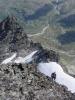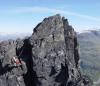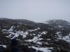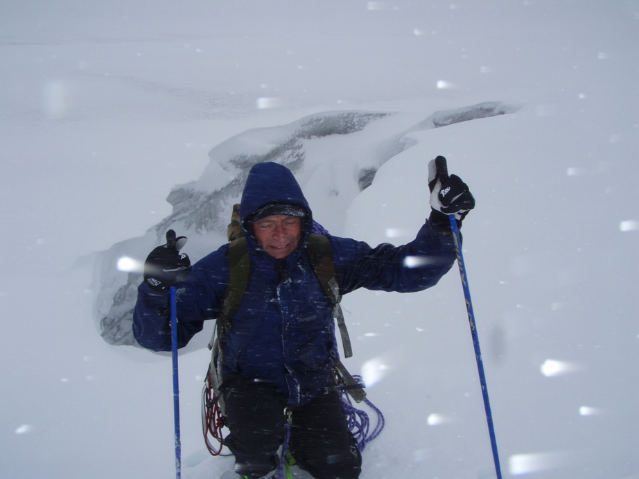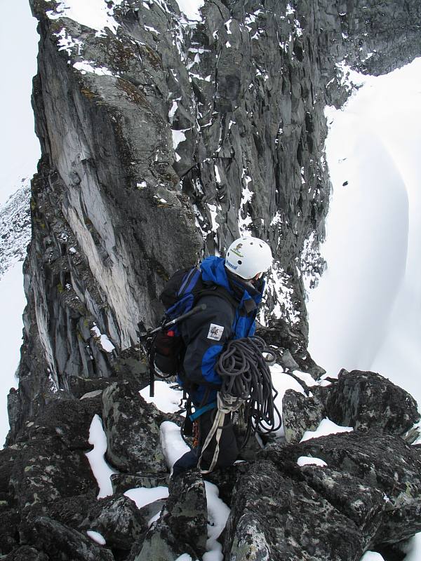 Tor Erik måtte etterhvert ned til lavlandet igjen, men værmeldingen var fortsatt ikke den beste. Likevel bestemte vi oss for å gjøre et forsøk på Smørstabbtraversen denne fredagen. Vi stod opp litt tidligere denne gangen, men enda et lag med nysnø på toppene gjorde det ikke spesielt trivelig å komme i gang og på vei innover dalen mot Krossbu veltet tunge regnskyer mot oss. Gøyalt! Fra Krossbu trasket vi i retning Smørstabbreen, etterhvert midt mellom to stier og totalt uvitende om den flotte stien som tar seg opp til tjernet der Leirbreen og Smørstabbreen møtes (den fant vi på tilbakeveien). På vei opp mot brekanten satte snøværet inn for fullt igjen, for tredje dag på rad! Vi tok på oss tau og gikk innover breflata i retning Kalven med dobbelttau. Vi rundet opp på venstre side av Kalven og tråklet oss opp i den nysnødekte flanken til vi omsider befant oss på fortoppen i tett tåke. Eggen videre mot Kalven krevde en del forsiktighet på det sleipe underlaget. Da vi hadde traversert alle Kalvens tre toppunkt og skulle ta fatt på ryggen mot Skeiei letter været og solstråler var igjen med oss en kort stund. Vi fulgte en markant snøegg ned til det laveste punktet, og så slakt opp til foten av Skeiis egg. Her var det frem med klatreutstyr. Den var gradert til 3-4 i klatreføreren, men en ting er sikkert: Det hjelper lite hvor lett 5 og 6 går i tørt vær med svasko på et klatrefelt i lavlandet. På vått fjell, mens istappene regner ned over en, med våte fjellstøvler og sekk kan fort 4 bli tilnærmet umulig. De første fem meterne var enkle. Tor Erik ledet selvfølgelig. Så kom taulengdens crux, et par loddrette metre hvor kroppen måtte kiles litt på skrå i en sprekk for å komme opp. Vel oppe den første taulengden kom vi opp på et galleri, noen store, våte steinblokker som hellet svakt utover. Jeg med min livlige fantasi innbilte meg at det var mulig å skli utover her, men fulgte til slutt, litt småskjelven etter. Andre taulengden havnet vi langt ut til høyre, etter at glatte svapartier i mitden virket "umulige". På et punkt ropte Tor Erik - Gjør klart for fall. Nøttepirkeren min mistet jeg på vei opp og en kile måtte settes igjen. Vi gikk sikkert litt feil, men det var aldri tre'er over det ene hjørnet, i alle fall ikke i praksis. Jeg var sjeleglad for å ha et tau ovenfra med halvgode håndtak og noen små, glatte fottak, og Smørstabbreen langt nedenfor. Spesielt fingrene fikk lide. Med like over null i lufta, kald vind var det guffent for fingrene og krafse det kalde fjellet eller fingre med det kalde jernet. Det gikk bra og med stor glede kunne jeg notere meg Skeii for besteget. Fra Skeii i retning Veslebjørn er det flere hamre. På høyre side er det stup, på venstre "stupbratt" Sikkert ok å klyve her når sola skinner og svartmosen er tørr. Nå var det kaldt, vått og veldig vått med litt nysnø, så vi rapellerte den første hammeren med rapellfeste 10 meter inne på flata. Den neste kløv vi ned i siden mot Smørstabbreen og seinere ble hamrene lettere og lettere og kunne klyves greit. En hammer i starten opp mot en uvesentlig topp like etter det laveste punktet mellom Skeii og Veslebjørn var litt bratt og veldig glatt, så vi rundet ut til venstre på bratt snø, som etterhvert ble så dyp og bratt at den rakk nesten til brystet. Vi kome oss opp på fjell igjen og videre opp på eggen (jeg med hjelp av en taustump). Videre opp til Veslebjørn var det enkelt. Nå tetnet det mere til igjen og vi hadde bare sporadisk utsikt. Det jeg grudde meg mest for stod nå for tur, Bjørneggen, også kalt Jotunheimens flotteste egg. Med en gang vi kom ned fra Veslebjørn mot eggen havnet vi i skyggesiden. Nå var det ikke bare nysnø og vått fjell. Nå var det full vinter og iskaldt. Istapper som hang fra steinene og en utrolig gufsen vind som slå inn på eggen fra Leirbreen. For å komme ned til et rapellfeste slang vi et tau rundt en fastkilt blokk og lot oss slippe to meter ned med godt tak i tauet (sikkert enkelt å klyve her på tørt fjell i litt mer sommerlige temperaturer). Hylla var god og brei (mer enn metern), men likevel med snøen som føltes glatt under skoene og de ubønnhørlige stupene nedenfor stod jeg ikke akkurat og danset. Tor Erik gjorde klart rapellfeste og kastet tauet utenfor. På grunn av den kraftige vinden forsvant tauet rett ut mot Bjørnebreen og måtte rettes på. Rapellen gikk veldig greit. Lett klatring på fine sva står det i klatreføreren. På min rapelltur ned syntes jeg det var uhyggelige og utsatte sva, bratte som fy og sprinklet med vann, is og snø. Vel nede stod vi på noen for så vidt greie hyller, men de var smale, og dekket av snø, nedenfor var det veldig kort vått sva ut mot evigheten. Snart ble det imidlertid bedre og lettklyvd til tross for forholdene over en liten topp på eggen og så på noen sva nedover, over et lite punkt som minnet litt om opptaket til S Austanbotntind 2, bare ikke fult så utsatt og så videre ned enkel svadekt egg mot en kort svahammer. Veslebjørn N, var nå så nære at jeg nesten kunne ta på varden, men likevel så langt unna. Vi var fanget på eggen. Opp kom vi ikke. Rapellere nede til sidene virket heller ikke mulig, så vi måtte videre. Et rapellfeste en god del meter innenfor hammeren var det eneste vi fant. Dette hadde også noen gamle slynger som viste at det hadde vært i bruk. Rapellen ned hammeren (gradert 5- andre veien, men veldig kort stykke) var greit. Pendel måtte man ikke få, men ellers ikke noe problem. Det som fulgte var det værste, en 5-10 meter lang eggete hammer bort til skaret. Den var 30-50 cm. bred og bratt ytterst slik at den på ingen måte var god og gå på. På andre egger skriver man gjerne "loddrette stup på begge sider" uten at det stemmer helt hundre prosent. Her stemte det virkelig helt. Det var skikkelig loddrett på begge sider (ok da ikke helt, men så nærme man kommer). Rapellen fortsatte nesten flatt ned et sva som f