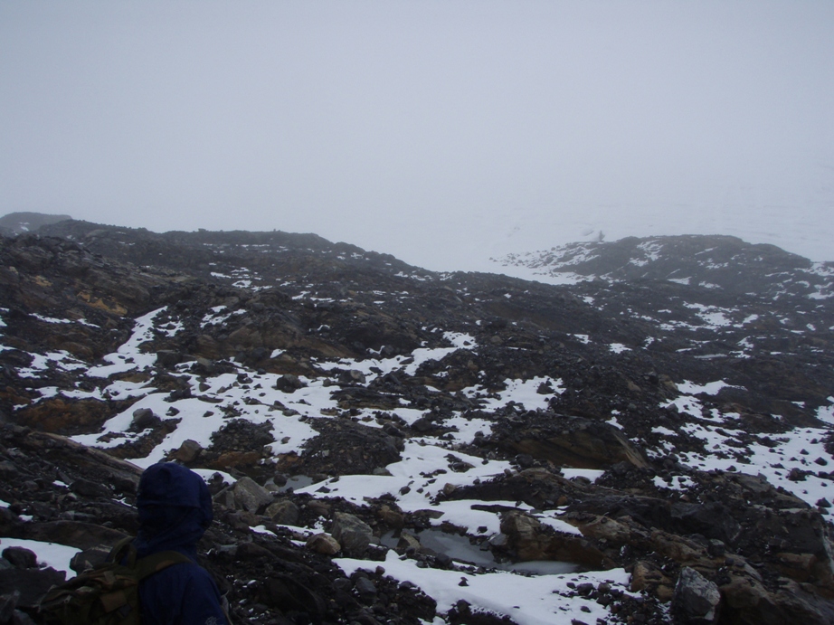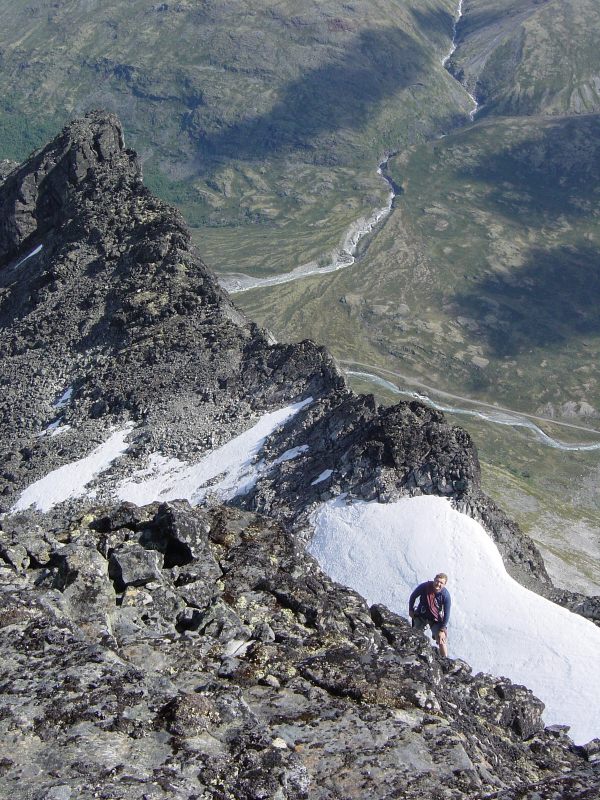 Etter noen behaglige toppturer i Hurrungane var denne dagen en nedtur. Turen inn Ringsdalen for meg og broderen var fin. Noe steinete det siste stykket. Stadige spektangulære stein og issprang kom ned fra Ringsbreen, uten at kidsa skal få skylda for det Tåka lå lavt men vi regnet med å navige oss greit opp breen til Store Ringstind. Oppover den smale breen vest for Midtre Ringstind måtte vi stadig unngå store sprekker. Men oppe på vel 2000 meter var det slutt. En kjempesprekk kløyvde breen på tvers, her muligens 150 meter langt. Sikkert 4-5 meter bred, 6-8 meter dyp og kanten på breen ovenfor var muligens 4 meter høyere enn der vi stod på nedre del på grunn av den kraftige hellningen her. Samtidig var fjellsidene nesten loddrette. Siden det allerede var blitt sent på ettermiddagen og tåka reduserte sikten til 10-15 meter valgte vi å snu her i stedet for å bruke tid på å jobbe oss over. Samtidig satte også regnet inn. Det ble en heller guffen retur. Glatt som det ble måtte vi ta en rappell ned det kinkige punktet nedenfor breen. Så spørsmålet er: Er dette vanlige forhold oppunder Store Ringstind på denne årstida ?? Ser at breen her har en trekant i mortens bok, men det gjelder vel heller stigningen som her er 45 grader. En heller kurant sak med stegjern og øks.