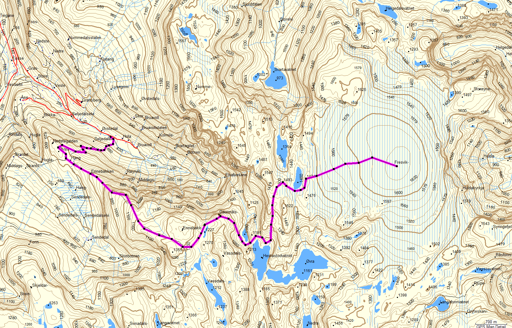 Fresvikbreen var ikke så sprekkfri som forventet. Vi gikk innpå fra vest, gikk opp fra Seljedalen til setrene på Hang. Deretter opp ryggen til 1320 m, for så en god del berg og dalbane før breen dukket opp i skodda. Yr hadde lovt oppklaring utpå dagen denne siste fredagen i september, uten at vi merket så mye til det. Skodde, sterk vind med regn, sludd og snø gjorde breturen værmessig utfordrende. Når blåisen i tillegg var dekket av 20 cm nysnø som skjulte nesten alle uhumskhetene ble det en heller jobbig tur til topps. Hadde lest at på denne breen skulle det være lite sprekker men her var det flust med store og små på tvers av ruta. Og på langs gikk det en hel del dype smelterenner. Alle dekket med nysnø. Så her var det bare å jobbe seg oppover med skistavene som søkestenger og utføre sprelske hopp over styggedommen, samt ta noen gjennomtråkk med godt humør. Stegjern, sele og tau kom godt med, selv om et taulag på to personer nok ikke er optimalt. Brukte bortimot 2 timer på de siste 1,5 kilometerene. Totalt 28 km på denne turen som nok er en god del drøyere enn fra Fresviksida. Turen tok 12 timer med et par pauser. Total antall høydemetere, ganske nøyaktig 2000. Været bedret seg, men ikke før ut mot kvelden på veg ned mot Hang igjen. Fresvikbreen med sine 15 km2 er Norges 23 største bre. Kunne virke som større arealer med is var nedsmeltet de siste årene. Høyeste punkt er 1648 meter og breen er nummer 11 på lista over fjell med størst primærfaktor i Norge. PF er 1310 meter. Høyeste punkt i Vik kommune er Fresvikbreen.