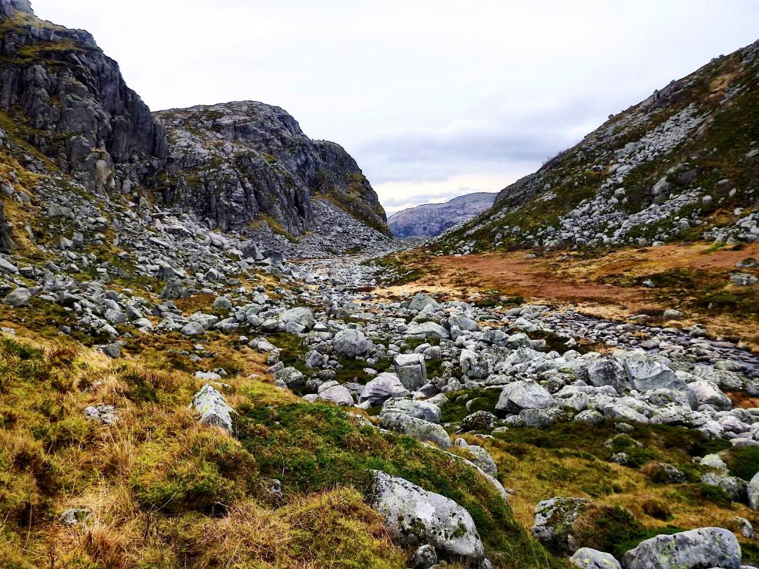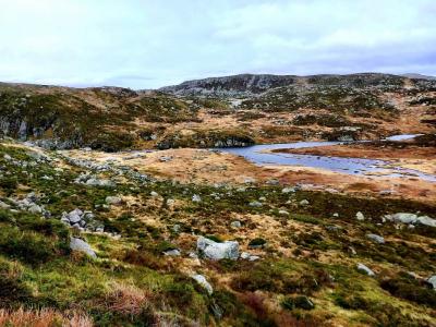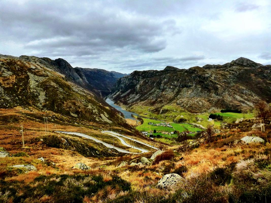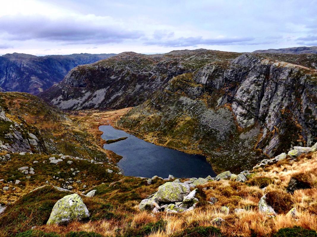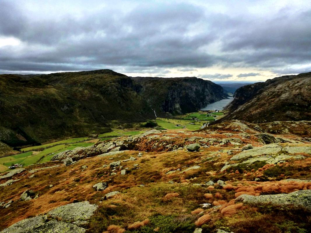 Normalt så er det jo Søndag som er turdagen, men det ble en på sparket tur i går. Jeg har tidligere gått til Vinjakulå, en tur med samme utganspunkt men i motsatt retning. Så denne gangen gikk det da innover Maudalsheiene. Turen er ikke nødlet/vardet og heller ikke merket, så jeg hadde med kart/kompass og GPS for sporlogging (til senere innlegging som turforslag på UT.no). Det er ikke ofte jeg går utenom sti, av sikkerhetsmessige hensyn, men dette området synes jeg så såpass spennende ut fra kartet at jeg tok turen. Jeg planla også å være tilbake i god tid innen det ble mørkt. På parkeringsplassen opp på toppen mellom Byrkjedal og Maudal var det ikke en eneste bil, men det var tydelige spor etter beitelaget som hadde hentet sauene ned fra fjellet. Det kan ikke ha vært så lenge siden heller. På turen traff jeg ingen andre, litt rart ettersom det var opphold og fint denne dagen. Underveis ga vinden fra seg noen kraftige råser mellom toppene, og frem til vannet ved ruinene av Byrkjedalsstølen blei lua tatt mer enn en gang. Så da får bildene si resten, det ble en flott tur og heiene her kommer jeg definitivt tilbake til. Under en times kjøring fra Stavanger er det også. Kanskje det blir telttur med tilhørende fiske neste gang? Fere bilder fra mine turer i Rogaland kan dere se på Tvergastein bloggen min. Byrkjedal ligger der nede... ...og her Maudal Svartatjørn ved Byrkjedalsstølen skimtes oppe til venstre Flott utsikt over Austadlstjørna, sett fra Svartatjørn Byrkjedalsstølen (ruinene) til venstre På vei tilbake nedover Urdalen