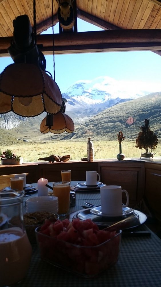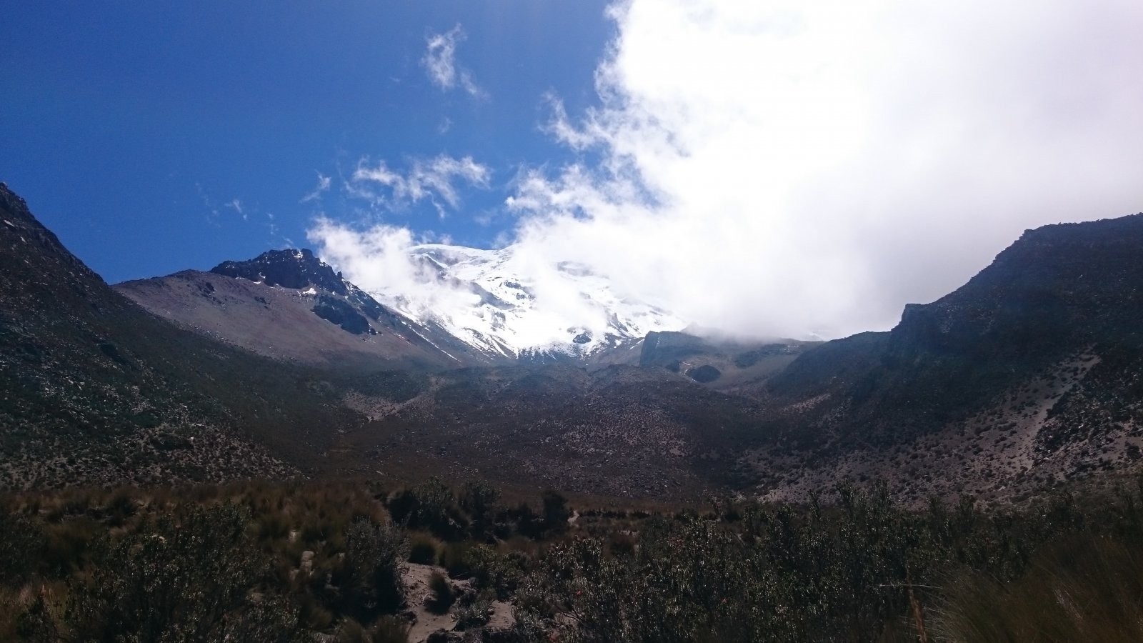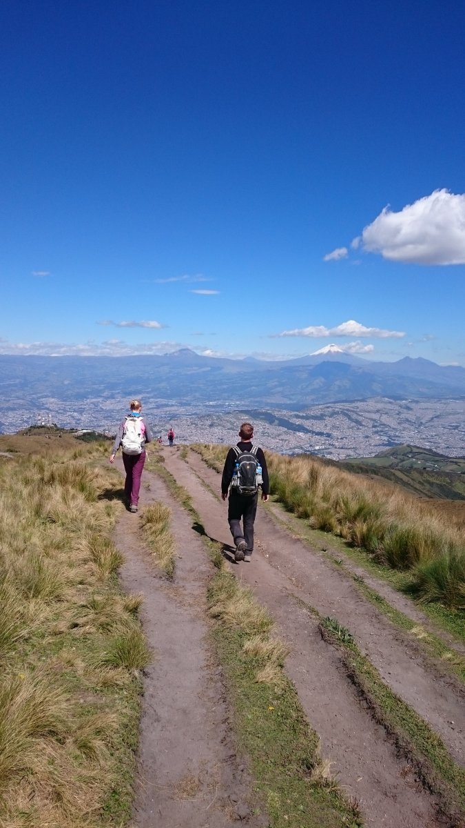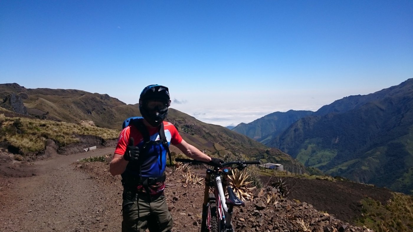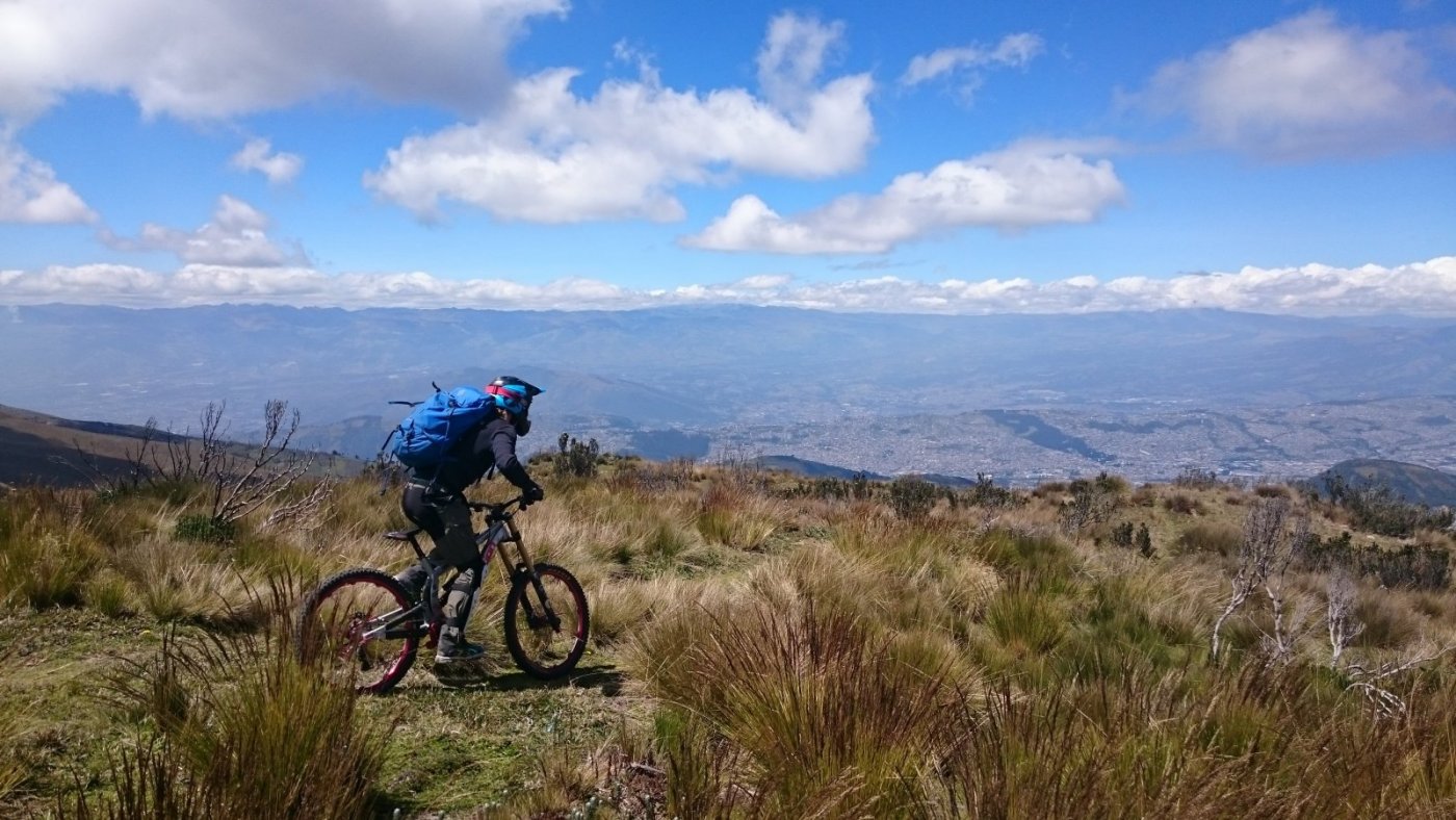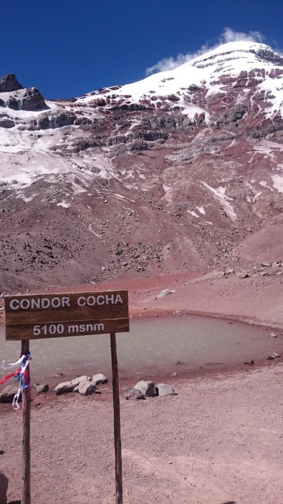 Etter å ha bestemt meg for å reise til Ecuador, vart det også tidleg klart at eg ville prøve meg på eit høgt fjell, når eg først var i området. Tenkte først at det hadde vore spennande nok med 5000moh, men fann ut at 6000 også var tilgjengeleg. Då Chimborazo i tilegg viste seg å vere verdas høgaste fjell ( https://no.m.wikipedia.org/wiki/), vart turplanen gradvis meir fjellorientert. Etter å ha tråla nettet etter diverse turrapportar frå spesielt Chimborazo og Cotopaxi, kombinert med lesing om akklimatisering, virka det som Chimborazo var oppnåeleg med 10 dagar akklimatisering. Sidan slowmotion-fjellvandring åleine ikkje frista spesielt hadde eg ei litt anna tilnærming til akklimatisering enn normalen. DAG 0: Landa, fann hostellet på 2800 moh. i Quito. Kjente at høgda var annleis enn heime når eg gjekk i trapper. DAG 1: Sightseeing, "klatra" alle dei 3 tårna i katedralen i byen og reiste til ekvator. (totalt ca 1,5t buss, 60 cent!) Relativt luftig trapp, passe akklimatiseringsaktivitet, dag 1.. Kryssing av ekvator DAG 2: Sidan eg neste dag skulle køyre bil til 4500moh, så følte eg at eg måtte sette ein personleg rekord til fots først. Den gamle rekorden var på 4167 (quiz: kva fjell er det?). Eg tok Gondolbana frå 3000-4000 moh over byen og starta på rusleturen mot Cumbre Pichincha (ca 4700moh). Med berre to netter på 2800 var eg ikkje uventa dårleg akklimatisert, men låg fart og fint vær fekk meg til toppen. Tegna på mild høgdesjuke kom etter kvart då eg nærma meg toppen og vart verre på veg ned att. Med gondolbana som fjernar 1000 meter på 10 min, følte eg ikkje det var spesielt farleg med litt høgdesjuke. Haudepina slapp taket etter ein time på senga på hostellet. Panoramabilde frå toppen av Rucu Pichincha. Kan ane fleire kvite toppar, som dermed er over 5000 moh. Kunne sjå Cayambe, Antisana, Cotopaxi og Chimborazo frå venstre mot høgre. To tyskarar eg slo følge med ned frå toppen. Quito og Cotopaxi 5897 moh i bakgrunnen DAG 3-5 Gjennom eit lokalt selskap, flowbikerental, hadde eg booka 3 dagar med downhillsykling, der eg gjerne ville vere litt i høgda, sidan dette var ein del av akklimatiseringa. Her fekk eg som bestilt, guide, sjåfør, topp downhillsyklar, og sykling på høgder mellom 4500-2800 i tre dagar (130$/dag). Eg merka dag for dag at eg lettare og lettare hang med guiden på flatene etter kvart som eg vart akklimatisert. Siste dagen var vi i tillegg innom Quilotoa, som er eit stort vulkankrater med ein innsjø i midten, som "alle" turistane på hostellet anbefalte. Her sprang vi ned og opp dei 2-300 høgdemetrane mellom 3500-3800moh. på 38 minutt. Det var vesentleg fortare enn dei uakklimatiserte turistane rundt oss var i stand til! Cruising på flotte stiar, totalt drøyt 8000 vertikale meter ned på 3 dagar! Her med Quito i bakgrunnen Omtrent på 3700 moh. på veg ned dei 1500 høgdemetrane frå 4000-2500 moh. Frå opent fjellklima til tropisk klima på 40 min! DAG 6: Skulle eigentleg reise tidleg på morgonen frå Quito, men sidan eg vart invitert med på joggetur på morgonen vart avreise litt utsatt. Deretter tok eg buss til Machaci (1,50 $) og taxi (20$) til Tambopaxi lodge (3750moh). Her kunne vi ha hatt perfekt utsikt til cotopaxi, om ikkje skyene var i vegen. Tok ein times spasertur i området før middag. Dette var det meste eg fekk sjå av Cotopaxi på nært hald. Svært fjell, bildet er tatt på ca. 3800 moh, med villhestar i framgrunnen. Cotopaxi Refuge på 4864 moh. Delar av det kvite oppe til høgre og venstre for hytta er isbre. Ved godt vær kunne ein truleg ha sett toppen frå dette punktet. DAG 7: Planen for dagen var å bestige midt-toppen på Rúmiñahui (ca4600moh), men på grunn av dårleg vær gjekk eg heller langs vegen dei 13 km opp til Cotopaxi refuge på ca. 4850 moh. Ny høgderekord der altså. Farten var framleis god i forhold til turistane rundt. Fekk haik ned att, dermed sparte eg knea for 1000 høgdemeter nedoverbakke. Møtte på ein nysgjerrig Andes-rev på 4600 moh, rett før eg fekk haik ned vegen! DAG 8: Planen var eigentleg å bli på Tambopaxi lodge ei natt til, men sidan eg fekk veggdyr natta før, kombinert med dyre prisar, diaré og skodde, fann eg ut at eg ville ha eit komfortabelt døgn i Riobamba (2700 moh) i staden. Spleisa på taxien med roomien frå sovesalen og hoppa på ein buss mot riobamba. Litt annleis type buss-stopp her enn i Norge! For å komme meg på bussen måtte eg krysse ein 4-felts motorveg og deretter stille meg opp "kor som helst" (om eg forstod spansken riktig) og stoppe bussen. Det funka fjell. Generelt kostar buss mellom 1-2 dollar i timen i Ecuador. Med den prisen hadde eg nok køyrt vesentleg mindre bil i Noreg. Eit noko uvanleg skilt å møte i fjellheimen for min del! Plasseringa på Chimborazo Lodge er mildt sagt gunstig for fjellentusiastar! DAG 9: Med litt mindre kløe og litt mindre diaré, var eg klar for meir akklimatisering. Tok ein lokal buss frå Riobamba til hotellet Lodge del Estrella, som ligg strategisk til i nasjonalparken til Chimborazo på 3950moh. Gjekk til fots på ein utydeleg sti frå hotellet og peikte meg ut ein ryggformasjon på veg mot Chimborazo som såg artig ut å gå på. Etter kvart som eg passerte ca 4700moh. vart det stadig luftigare oppover, så i frykt for å gå meg vill bygde eg eit par småvardar på nokre utsette punkt i tilfelle eg måtte ned samme veg i skodde. Skikkeleg eventyrfølelse! Etter kvart smalna ryggen av og endte i eit stup. Då eg såg ei slynge rundt ein stein byrja eg å tru at eg måtte snu, men med litt klyving på høgre sida av ryggen kom eg meg ned i eit skar på ca 5000 moh. Veldig stilig geologi her, der både isbre og vulkanen prega utforminga av landskapet. På bilder på hotellet kunne ein sjå korleis breane har trekt set kraftig tilbake dei siste 100 åra. Etter eit halvhjerta klyveforsøk vidare frå skaret konkluderte eg med at dette var idioti, så eg tok lunsj, pusta inn mest mogele