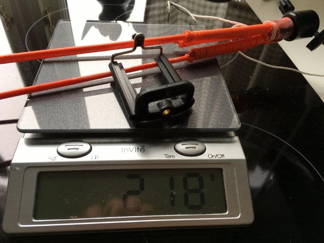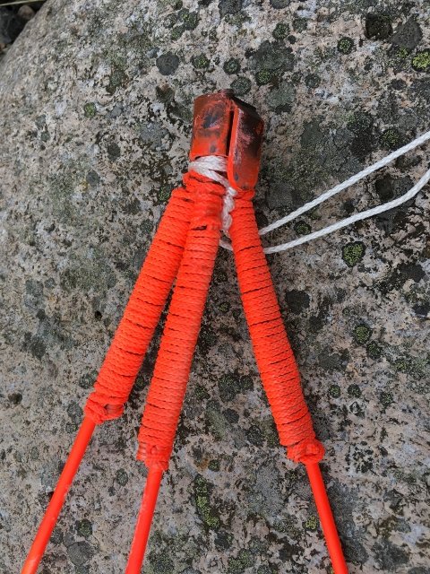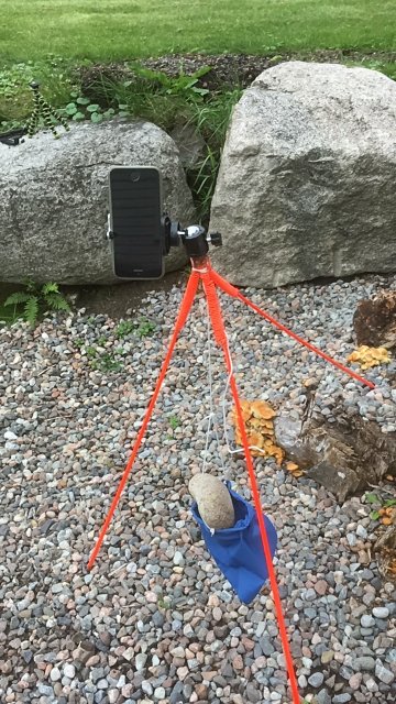 Ved en anledning trengte jeg et fotostativ, og siden jeg likevel hadde med meg ett knøttlite stativ så mekket jeg sammen ett av noen vierkvister. Fungerte bra. Bra nok. Her om dagen sto jeg med 3 gamle fluestangtopper og tenkte. Deretter, tok jeg av knottene og surret fast toppene på hvert bein. Da jeg var ferdig så jeg at jeg kanskje kunne ha tredd dem inni beina. ja, ja. Alle knuter forsegler jeg for øvrig med en dråpe lynlim. Kjøpte et kulehode på Ebay. Og monterte det på stativet Stativer er ikke det mest stødige, men jeg sydde en pose og festet den med en line. I den kan jeg legge en stein og da står den støtt. Selv på ujevnt underlag, her står det ene beinet ca 20 cm høyere enn de to andre, men det er lett å justere de to andre beina, slik at stativer står rett. På selfiestenger er det en holder for mobiltelefonen som jeg skrur fast til stativet. Eller jeg kan skru på et lite digitalkamera direkte. Fant også en fjernutløser (festet til en orange snor) på nettet, så nå er alle muligheter tilstede for å ta flotte bilder, hvor jeg slanger meg makelig under baldakinen og stirrer inn i bålet på blikkboksovnen. På bildet har jeg også et gorilla? stativ som både er lett og anvendelig. Og hele greie veier 218 gram!