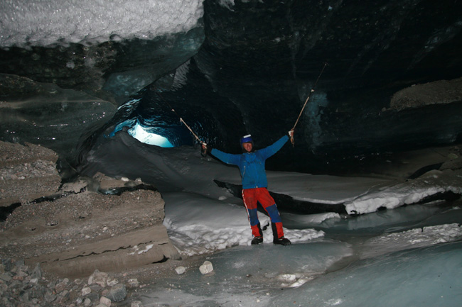 Last winter I discovered a new Icecave at Hoglandllake under the Mittag-lefflerglacier. There should be many icecave`s on Spitsbergen, the problem is to find them. During the summer a big glacierriver is streaming through this icecave. The cave is about 300m. long with a huge hall in the middle.