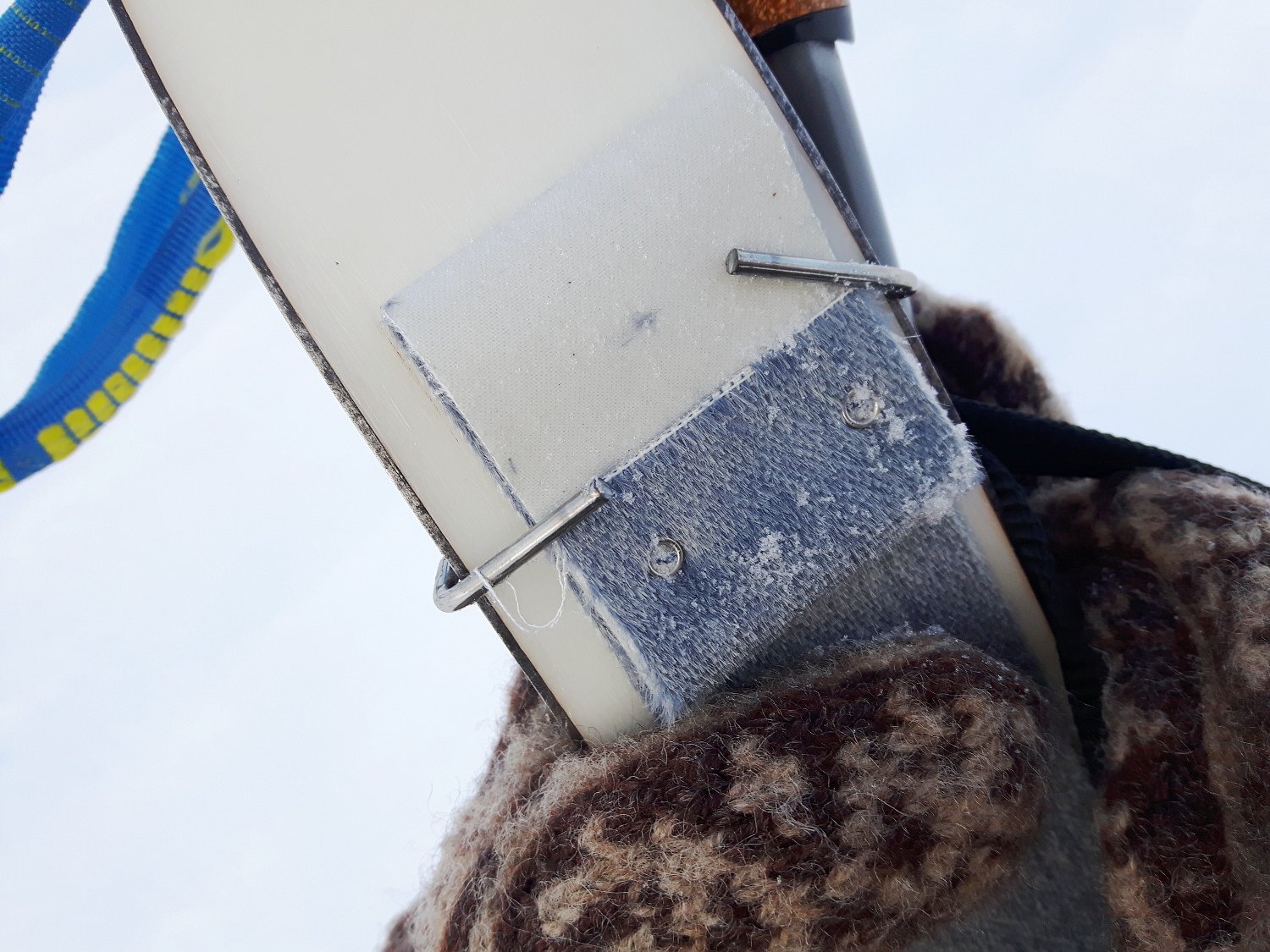 I går brukte jeg noen Silvretta skifeller for første gang. De er kjøpt for et par sesonger siden, men jeg pleier å være for stolt til å bruke feller egentlig og de har bare ligget i et skap. Uansett så satt de godt på, inntil jeg plutselig merka at det ene festet var bøyd opp rundt skitippen: Så det jeg lurer på er jo om dette er et "vanlig" fenomen? Det virker helt tussete at ikke denne lille klemmen er loddet i hop eller fungerer bedre enn som så. Er også usikker på hvordan det egentlig skjedde da fellene satt godt hele veien og uten slakk. Jeg har tidligere brukt feller i vel seks år uten problemer, inntil jeg lånte de videre til en kamerat som rota de vekk. -