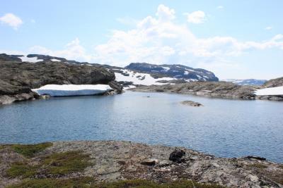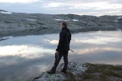 Hadde en nydelig tur opp til trolltunga i slutten av juli. Jeg og dama hadde kjørt fra jotunheimen og tenkte at vi kunne overnatte på odda camping før vi tok turen oppover til trolltunga. Men det viste seg at det var stappfult, men vi fikk nå beskjed om at det skulle være mulig og sove ved sjeggedal på en liten gressplen. Vi fant plenen og klarte og få skvist på plass teltet mellom alle de andre telta som var der. Bilen ble plassert på parkeringsplassen som var i overkant dyr om du spør meg. jeg skulle jo stå der i 5 dager, og det kom på den nette sum av 1200 kroner. Fant på en eller annen nettside at det skulle være mulig å kjøpe årskort som kosta i underkant av halvparten, men da fikk jeg bare beskjed om at det gjalt bare for de som hadde hytte i orådet. Syns nå det burde vært en eller annen kvantumsrabatt, men nok om det. Dagen etter var det bare å pakke sekken opp med det som trengtes av mat og proviant, selv om fiskestang skulle være med, er en nå ikke alltid garantert denne fisken. Vi starta turen oppover og bestemte oss fort for å ta den nedlagte banen i bruk. Masse små trappetrinn, men det gikk nå ganske radig oppover, på det bratteste føltes som den gikk så og si loddrett, men en fin opplevelse i seg selv. Være var fint og sola gjorde sitt for at en måtte være påpasselig med å drikke gode mengder med vann, svetten rant så og si hele tida. Vi kom oss opp til toppen og tok oss en velfortjent liten pause og litt nøtter for å få ekstra energi. Turen fortsatte flatt i en kilometer før det var og ta fatt på neste store kneik, med stor og tung sekk så var det bare og la de som kom uten sekk eller bare med et fingerbøll av en sekk rase forbi, og heller bare holde seg til et rolig og fornuftig tempo oppover. Da vi nådde toppen av denne ganske så harde starten på vår tur fikk vi satt oss ned spist litt ordentlig mat. Skoa ble tatt av, blir fort veldig fuktig inni der, greit å få lufta tæra litt da. Etter en halvtimes tid fortsatte vandringen innover mot trolltunga. Turen fra toppunktet og innover gikk egentlig ganske greit, ikke store stigningene og en nydelig utsikt med folgefonna alltid som det hvite lokket i det fjerne. Da vi kom fra til tunga så fant vi et fint sted og sette opp teltet. bare noen få meter unna vandrestien, men var alikevel overraskende alene der, veldig positivt. VI tok turen bort til tunga for å ta de obligatoriske bildene, kan jo ikke være der uten å få med dem. Prøvde å fiske litt i vannet som var der både med flue og sluk, men fisken virka veldig lite interresert i hva jeg hadde og presantere, hadde kanskje napp, men kan og ha vært bunnapp, så ble ikke mye å skryte av, så da ble det real til middag. Når mørke kom så ble det kvelden siden fiskelykken ikke akkurat strålte. Dagen etter var det å stå opp få i seg litt mat før en skulle vandre videre innoverpå vidda. Dagens mål var satt og det var ikke så veldig langt dit vi skulle og noen timer senenre endte vi opp på området vi skulle være de neste tre dagene, veldig fint der rett og slett. Fiske startet med en gang teltet var slått opp og litt mat fortært, men var ikke så mye napp og få. Men det var vak i vannet, så fisk var det her, så var det bare å klare å lure den på stanga da. Utpå kvelden så ble det endelig fisk, det var dama som dro den opp på en spinner, 600 grams ørret, det gjorde at det begynte å bli riktig så koselig på tur. klokka var blitt så mye at den ble spart til middag dagen etter. Dagen etter våknet vi opp og så fisken varigang igjen og dama fikk fisk på første kast, en fin 450 grammer, og hun begynte og bli litt cocky siden hun hadde fått to mens jeg stod der tomhent enda. Deretter kunne jeg se i horisonten at drittvær var på vei innover og det var bare å pakke så mye en kunne inn i teltet. Det gikk vel ikke mer enn 20 minutter fra en så drittvære komme til det kom over oss med full styrke. Lyn, torden, kraftig regn og selvfølgelig masse vind. det var noen interresante minutter, teltet så ut som om det prøvde og lette fra bakken. den kraftige vinden var der nok bare i en ti minutter før den løya ned til et levelig nivå. Jeg var veldig glad for at jeg hadde vært nøye med teltoppsettet. Etter et par timer gav regner seg og vi kunne komme ut fra vår lille hule og finne fram stengene igjen. Resultatet ble 3 fisk på meg, fra 400 til 550 gram, mens dama fikk en bitte liten pinne. Neste dag var det ikke så mye å rope hurra for, været så ut til å kunne bli verre så vi tok avgjørelsen på å gå ned fra fjellet igjen. Tilbaketuren gikk veldig fint fram til vi kom til trappene som skulle ta oss ned igjen, har vel aldri hatt bein som har skjelvet så mye før, var ikke mange stegene vi kunne ta før beina ble håpløse å stå på, men en morsom erfaring. så etter 8 timers vandring klarte vi å komme oss ned til bilen igjen. Det var en veldig vellykka tur med fin natur og gode fiskeoppleverser.