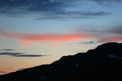 Ankomst Lønsdal stasjon etter 16 timers togtur. Stasjonsbygget på Lønsdal lyser rødt mot blått i morgensolen. Noen parkerte biler, ingen mennesker, ingen lyder. Litt ompakking, før jeg krysser jernbanesporet og tilslutt greier å finne stien. Den følger noen flotte svaberg oppover og jeg snur meg og tar et bilde tilbake mot Lønsdal. I Saltfjellet, ja faktisk i hele Nord-Norge, har det allerede vært finvær en hel uke. Nå håper jeg det holder en uke til. Jeg er spesielt spent på snøforholdene, få kan huske at det har vært så mye snø i fjellet som det er denne sommeren. Stien går inn forbi Kjemåvatnet som ligger 626 moh. Her må jeg ha første skikkelige pause. Allerede har pådratt meg hudløse gnagsår fra hoftebeltet. Hvordan det kunne skje så raskt vet jeg ikke, må bli mer nøye med at sekken sitter riktig. Den veier vel rundt 23 kilo, så det er nok noe av forklaringen. Fjellbjørkeskogen rundt Kjemåvatnet strekker seg litt oppover i lia, men så er det slutt på den. Herlig høyfjell vider seg utover. I bekkefaret og søkk ligger det fremdeles litt snø. Jeg ser Lønstinden i det fjerne, og merker at det er mye insekter i luften. På vei mot Lønstinden står et ensomt Fjellheimen 3Camp og jeg lurer på om det kan være en fjellforumer på tur? Teltet skal bli det eneste tegn til mennesker jeg ser på denne turen. Oppe ved Kjemåbekken er myggplagen blitt såpass sterk at det er såvidt jeg rekker å stoppe for ta et bilde av Ørfjellet. Det er flott kjegle fra denne vinkelen. Det er stille og varmt, kroppen er tung og sekken også. Hoftebeltet gnager og jeg er sliten etter kun noen få timers vandring. Solen står høyt på himmelen, og etter at jeg forlot myggen nede ved Kjemåbekken er jeg helt klar for å slå leir. Men partiet langsmed Lønstinden er ikke særlig godt egnet som leirplass. Det er mest stein og snødekke som jeg stadig plumper igjennom. Plutselig får jeg øye på en reinflokk som renner ned siden av Lønsfjellet. Kanskje det er kleggen som gir dem hastverk? Tamrein kan også være et flott skue! Ved bekken etter stiskillet finner jeg en grei leirplass. Det er tørt og varmt og lite vann i bekken, som sikkert er en stri elv til andre årstider. Dag 2 Dag 3 Dag 4 Dag 5 Dag 6 og 7