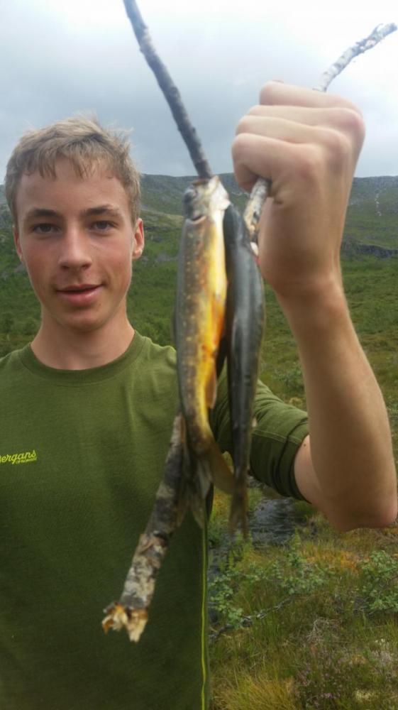 Fantastisk i Femundsmarka Etter mye planlegging og pakking var alt klart, åttte-ni timer bilkjøring ventet. Jeg gledet meg VELDIG til å komme inn i Femundsmarka nasjonalpark for første gang. Det var så mange spørsmål jeg ville få svar på, hvordan er det å finne teltplass?, hvordan blir fiske?, hvordan er terrenget å gå i?, jeg vet at det finnes områder med mye blokkstein, men hvor? Kommer jeg til å treffe mye folk? Hvordan blir været? Alle disse spørsmålene (pluss mange flere) vil jeg få svar på i løpet av turen. Informasjonskilt om narsjonalparken Det var ettermiddag og vi (jeg skriver «vi» fordi pappa var med, det hadde jo vært litt rart om jeg hadde kjørt alene, jeg er tross alt bare fjorten år) kommet så langt som til Alvdal. Her sov vi en natt hos noen venner. Vi kler oss omog venter på ferga Fergen (Femund 2) går klokka 09.30 fra Synnervika til Røa, dermed ble det en tidlig avgang fra Alvdal (det er nemlig et lite stykke å kjøre). Klokka 06.00 våknet jeg, og klokken 06.30 var vi på vei til Synnervika. Her ble det spist noen skiver som en rask frokost før fergen kom. Vi traff også en hyggelig kar her på kaia (hei til deg!). På fergen spiste jeg en nydelig vaffel som jeg sikkert kommer til å sette enda mer pris på hjemturen. Femund II Turen opp til Røvollen turisthytte gikk ganske fort og greit, men det skal sies at sekken ikke var lett! På vei mot Røvollen Tung sekk! Krysser Røa Røvollen Videre gikk fulgte vi turistforeningens sti opp til Røvolltjønnane. Røvolltjønnan-stille og varmt! På veien kom jeg så nærme et reinsdyr at jeg nesten kunne ta på det! Reinsdyr Vel oppe ved Skogtjønna satt vi opp leir, etter en lang etappe var magene skrubbsultne, pølser og ris sto på menyen i dag, det smakte herlig! Mat til to personer! På kvelden var det tidvis litt bris, men ingen vak. Vi forsøkte det meste uten hell. Neste morgen var det skyfri himmel og ikke et vindpust, jeg så røya vake og spise fluer i vannflata. Det var nytteløst med sluk og spinner i slike forhold, tørrflue ville muligens vært nøkkelen (har noen tips til hvordan man kan fange røya, så skriv gjerne en kommentar!). Prøver stanga på kvelden ved Skogtjønna Da leiren var pakket ned tok vi turen mot øvre Roasten. Utsikt over Roasten Her traff vi en hyggelig kar på en av hyttene som kan leies. Vi slo oss ned en liten stund her og spiste lunsj. Han tilbød å ro oss over på nordsiden av Røa, vi takket gladelig JA. Vi sparte mange timer med gåing eller en skummel vading over Røa, da vi bare hadde 5 dager til rådighet. Fyren vi traff tipset oss om Roastbua (en åpen koie), den var ledig og vi bestemte oss for å ligge her for natten da de meldte regn den natta. Roastbua Før kvelden gikk vi en tur opp til Gislehåen for å prøve noen kast. Her dro pappa opp en Gjedde på 1,6 kg. Denne beit på møresild. Vi hadde aldri forsøkt å spise Gjedde før, så vi tok fileter og tok sjansen. Første Gjedde på turen Da vi kom ned til Roastbua igjen tok vi noen kast ved innoset til Roasten. Plutselig ropte pappa «Isak, hent håven, jeg har fisk på!». Jeg løp bort og stakk håven ned i vannet og fikk opp en fin og feit ørret, den var ikke av de aller største. Denne beit også på møresilda av en eller annen rar grunn. Første ørret på turen Stekt ørret og ris Dagen etter tok vi turen lenger opp i vassdraget, vi fulgte bekkene fra Gislehåen oppover til noen vanner. Det første av disse vannene var et typisk Gjedde-vann. Jeg forsøkte med møresilda pappa hadde fått fisk på tidligere på det første kastet. Vannet var klart og blikk stille, etter noen sveiv kunne jeg se sluken nærme seg land. Plutselig så jeg et beist av en fisk komme etter møresilden, det var en Gjedde, den nappet og jeg gjorde et kraftig mothugg, kampen var i gang! Jeg hadde bremsen på snellen passelig på, men denne fisken merket den ikke en gang! Bremsen ble strammet så kraftig at jeg selv ikke klarte å dra den ut. Etter noen minutter trodde jeg Gjedda var utkjørt, pappa prøvde å håve den, men så sprellet den vilt og hoppet ut av hoven. Etter å ha fått den inn til land igjen fikk vi håvet den opp på land. Vekten stoppet på to kilo! Min Gjedderekord Gjedda sammenlignet med vekta i størrelse Skarpe tenner Etter Gjedde opplevelsen gikk vi videre langs Storbuddhåen, her var det mye blokkstein og vanskelig å gå, det ble ingen fangst her. Her var det ikke langt unna at jeg sovnet! Da vi hadde kommet ned til Roastbua igjen tok vi noen kast på nordsiden av øvre-Roasten. Her dro jeg opp to feite og blanke ørreter som ble veid til 300 og 500g. To ørreter til, største på halvkiloen Av disse to ble filetert og kappet opp i små terninger og puttet oppi Lofoten fiskesuppe. Dette måltidet smakte herlig. Fin farge, men ikke røde Klokken 10.00 neste dag var vi klare til avgang. Vi gikk langs hele nordsiden av øvre-Roasten og fulgte en bekk opp til Litlsjøen. Her fant vi en fin leirplass på vestsiden av vannet. Leiren ved Litlsjøen Utsikt fra teltet Pappa tok første kastet med en lillauren spinner. Plutselig rykket det kraftig i stangen hans, og jeg sveivet inn så fort jeg klarte og løp bort med håven. Det var en fin abbor som ble veid til ca.500g, ikke dårlig! En av abborene herfra Etter noen timer med fisking stoppet vi, resultatet var fem abbor på rundt halvkiloen og to litt mindre, dette var mer en nok til en god fiskemiddag! Det smakte himmelsk med stekt abbor og ris. Kvelden ved Litlsjøen var fantastisk, jeg nøt hvert eneste sekund! Da var allerede siste morgen kommet. Jeg startet dagen med to store porsjoner med havregrøt, dette skulle bli en lang og tung dag. Havregraut-herlig! Etter at leiren var blitt pakket sammen bestemte jeg meg for å ta et kast med stangen som en avskjed. Jaggu beit det også på det ene kastet, en abbor på 500g, den fikk svømme ut igjen. Ned til Roasten tok vi en annen vei en opp, vi krysset ned på skrå istedenfor å følge bek