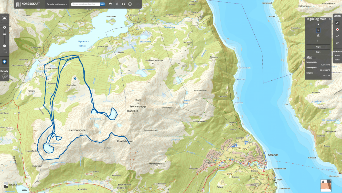 Fisking og toppturer i Sunnmørsalpene Like etter en fantastisk tur i Femundsmarka gikk turen mer vest i landet, inn i de spisse og mektige fjellene i Møre og Romsdal. Mektige fjell Etter mange timer i bil var kvelden kommet og jeg var endelig kommet frem til Fjellsætra og Nysætervatnet hvor jeg og familien min eier en hytte. Denne plassen er et fint utgangspunkt for mange turer, særlig toppturer. Utsikt fra Roaldshornet, der en ser Storfjorden Neste dag dro jeg fra Fjellsætra og over til Standa og tok gondolen nesten til topps på Roaldshorn. Jeg gikk siste biten som var ca. 200 høydemeter opp til toppen. Været var bra og utsikten var ubeskrivelig. Toppen av Roaldshornet Toppen på Roaldshorn rager på 1230 moh, man kan se ned til Stranda, Storfjorden, inn i Jotunheimen og ut mot havet. Toppen er fin å bestige både sommer og vinterstid. Planen var nemlig å gå fra Roaldshorn og tilbake til hytta på Fjellsætra. Turen er fantastisk å gå i fint vær og ikke for lang (i luftlinje er det en mil). En mil i luftlinje høres kanskje langt ut, men det er noe helt annet å gå med dagstursekk enn blytung fjellsekk! På vei mot Myrdalsfjellet Forholdene var fantastiske, helt stille og strålende sol. Den første delen av turen gikk på eggen fra Roaldshorn og til Kleivdalsfjell. Her gikk jeg over flere hvite snøflekker. Etter et lite stopp gikk turen videre fra Kleivdalsfjell til Myrdalsfjellet. På denne etappen var det litt mer gress, myrer og små vann, og selvfølgelig en fantastisk utsikt. Kleivdalsvatnet nærmest og Nysætervatnet nederst Fra Myrdalsfjellet og ned til Nysætervatnet er det mellom 500 og 600 meter nedstigning, noe som jeg kan love deg at du vil kjenne godt. Mektige fjell På veien ned traff jeg på mange sauer og kuer som var på beite. Vel nede ved vannet kjente jeg lukten fra en nydelig middag som viste vei tilbake til hytta. Etter en nydelig middag tok jeg et par kast i Nysætervannet, det viste seg at vannet inneholdt store mengder med knøttsmå ørret. Her må det kultiveres! Dagen etter tok jeg med stangen opptil Kleivdalsvatnet, jeg var spent på hva og om det var fisk der i det hele tatt. Jeg har hørt at det skal være det, men jeg har aldri fisket der selv. Da jeg kom opp til kulpene før vannet bestemte jeg meg for å ta noen kast. Jeg så små vak og små fisk svømme rundt i kulpen jeg sto ved. Den svarte spinneren med gule prikker ble festet på svivelen. Etter kun to kast kjente jeg en svak napping i stanga. Selv om jeg hadde bremsen veldig slakt klarte ikke fisken å dra den ut, altså liten fisk. Jeg fikk fisken på land, og overaskende nok var det en Canadisk bekkerøye – jeg som trodde det var ørret jeg hadde på kroken. kanadisk bekkerøye Etter jeg hadde halt i land fire stykk av den samme arten gikk jeg ned til Nysætervatnet igjen. Da vet jeg det, Kleivdalsvatnet har mye Kanadisk bekkerøye, men ingen ørret som jeg kunne se. Neste dag ble det ny fisketur. Denne gangen opp i vannene i Blådalen, som ligger sørvest for Blåfjellet. I det første vannet jeg kom opp til vaket det voldsomt, men ingen fangst, jeg så flere fisk i vannet, men de var bare små. Nedre blådalsvatn Etter en stund fulgte jeg elva/bekken opp til det neste vannet i Blådalen. Dette er det største av vannene her og ligger ca 830moh. Litt opp fra vannet ligger det en liten flott koie av stein som er ganske vanskelig å få øye på. I koia er det plass til to personer, det er litt ved der og en liten ovn, en veldig koselig koie! I vannet ved koia ble det flere små ørreter og en på mellom 200 og 300 gram i fin kondisjon. Blådalsvatnet nær koia - Blanke og fine Jeg hadde ikke vekten med men den veide noe i den duren, ikke den største men fin stekefisk. Etter dette gikk jeg ervannet. Siste dagen regnet det på morraen, og jeg brukte en del tid på å fikse et lite problem på bloggen. Hvis noen har merket det så har bildene vært borte en liten periode, det meste skal være fikset nå:). Ruta jeg gikk Les om toppturene jeg hadde i samme området i påska her!