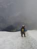 Det var jo nesten for dumt, men selv etter så mye lesing og grundige forberedelser klarte jeg å bli ganske dårlig på turen til Mont Blanc du Tacul. Enda godt vi ikke gikk for hovedtoppen Mt Blanc denne første gangen. Akklimatiseringen visste vi var for dårlig: To dager på Leshaux-breen i drøyt 2000 meters høyde, med overnatting på Leshaux-hytta (2500 m). Så hadde vi klippeklatret en dag nede i Chamonix. Men vi satset på at det var sant; at Tacul var ganske kort og lett, og at vi umulig kunne rekke å bli alvorlig syke – DET skulle vise seg å stemme. Vi hadde ikke forhåndsbooket plass på taubanen opp til Aiguille du Midi (3842m), og møtte derfor opp en halv time før avgang, dvs 07.30. Da fikk vi tid til å parkere gratis 400 m unna. Dette var utenfor høysesongen, og det gikk greit med plass i vogna, som forøvrig holdt en imponerende hastighet oppover. Vi anslo farta til 40 km/t, og en oppstigning som trykkmessig klart overgår det man opplever på fly. (Sondre fikk svært vondt i øra ned igjen…) Etter skiftet av vogn på mellomstasjonen var det aldeles utrolig å løftes oppover de bratte og glatte klippene og snøskrentene opp til den spisse toppen. Den økende og imponerende utsikten slukte faktumet om at dette egentlig var vanvittig kommersialisert, og vi frydet oss vilt! Når høydemåleren passerte 3000 m rådet en høytidsstemning blant oss tre nordmenn. Byggverket på toppen er imponerende plassert, men jeg uroet meg straks fordi jeg kjente meg ganske svimmel. Og den skarpe snøkammen ned fra toppen som vi måtte gå ned etterpå, så ikke ut til å tillate noe fall. Vel, erfaring har lært meg å ta det som kommer når det kommer, og vi konsentrerte oss om å finne veien til utgangen. Her var det behørig merket om ansvar og bresprekker, med både achtungs og warnings. Med skjelvende hender (det var et par minusgrader i skyggen) tok vi på oss stegjern og tau. Solkremen ble heller ikke glemt, men faktor 12 viste seg å være altfor lite, og sunblock’en på leppene burde vi nok brukt flere ganger. Det ligger vel klart mellom linjene nå at vi ble ganske forbrente… Rolig, pent og rolig Det gikk ganske bratt på snøeggen - og luftig - ned mot breflata. Hadde det vært panserhard is og ingen spor, hadde jeg glatt psyket ut, for utsikten 2800 m rett ned i Chamonix var helt utrolig! Men det gikk egentlig veldig greit, selv om jeg var ganske svimmel. Vi hadde jo også isøkser å støtte oss på, og tau mellom oss. Ganske snart flatet det noe ut, og vi gjorde en halvsirkelformet bevegelse rundt hele Aiguill’en, der noen allerede var i gang med å klippeklatre på de finslipte granittveggene. Vi passerte Cosmiques-hytta og Col de Midi i rolig tempo. Det visste vi var en suksessfaktor; rolig gange, ikke stresse selv om iveren er stor. På denne flata hadde jammen noen slått opp telt også. Bivuakk er tillatt, men ikke camping. Dvs at du kan sette opp teltet seint om kvelden, men må pakke bort alt neste morgen, og også bære det med deg. Opp NNV-siden på Mt Blanc du Tacul så vi tydelige spor, og været var helt topp, så alt lå til rette for å nå toppen. Snart ble det motbakker, og åpenbart at oksygennivået var lavere enn vi hadde opplevd før: Det nyttet ikke å gjøre annet enn å rusle! Før det bratnet for alvor satt vi oss ned på om lag 3800 m og spiste frokost. Jeg merket jeg var tung i hodet, og det prikket litt i fingrene. Svimmelheten var gått noe over. NNV-flanken Fotsporene rundet en isvegg på 8-10 meter, og buktet seg oppover NNV-flanken. Dette var gradert WS (wenig schwierig – lite vanskelig, eller PD om du vil), og vi gjorde erfaring med hva det vil si. Ett punkt var en tydelig forkastning på breen vi måtte opp, en 2m loddrett isvegg på andre siden av en smal meterdyp sprekk. Noen hadde lagt igjen et tau med knuter her, festet i en isskrue, som gjorde videre avansement svært enkel. Vi var nesten litt skuffet, men benyttet tauet og dro oss opp for å spare tid og krefter. Etter hvert tiltok vinden kraftig, og snøfokket gjorde sporene utydeligere og mindre dype, men været var ellers topp. Begeistringen steg brått da jeg oppdaget at høydemåleren bare viste streker – vi hadde passert grensa for hva den kunne måle; 4000 meter! Trafikken oppover var ikke avskrekkende; det var tydelig at vi var utenfor høysesongen. Snart flatet sporene ut, og vi møtte vinden i ansiktet med full styrke samtidig som vi så toppen og Mt Blanc ruvende noe bakenfor, bak Mont Maudit. På med vinterlue og hetta på anorakken! Dette tilsvarte norsk vinterfjell en vindfull påskedag. Kraftig vind på toppen Hodepinen hadde for alvor meldt seg nå, og det gikk utrolig sakte i de kraftig vindkastene oppover de slake bakkene mot toppeggen. Denne så vi gikk over i bratt klippe på slutten, der snøføyka sto mange meter ut over stupet i nord. Om lag 30 høydemeter under toppen, før den siste snøeggen og den bare klippen, ble jeg regelrett blåst over ende, og vi besluttet å stoppe her. Å gå videre i slik vind kunne bli skummelt på en smal egg, og så var vi for første gang godt over 4000 meter. 4248 m skulle toppunktet være, og vi regnet Tacul som besteget med god samvittighet. Sikkerheten i høysetet! Vi klarte å ta noen få bilder, men jeg turte ikke ta opp videokameraet på grunn av vinden. Så hastet vi nedover. Det gikk i grunnen fort å gå ned, og vi passet kun på å holde balansen i tråkket. De andre i laget kjente også hodepine nå, mens jeg hadde dundrende verk. Ved 2-metersforkastningen var det stor kø av italienere, som skulle sikre seg uavhengig av tauet som var lagt opp. Dette tok lang tid for dem, og vi var heldige og fant en isskrue til ved siden av - med slynge - og rappellerte raskt forbi alle sammen. Jeg var imponert over hvor greit Lars-Petter (11) – sønnen min – hang med hele tiden. Han stolte virkelig på utstyret – og på oss! Men jeg var litt bekymret for høydesyke også for ham. Det er visstnok ikke bra for 