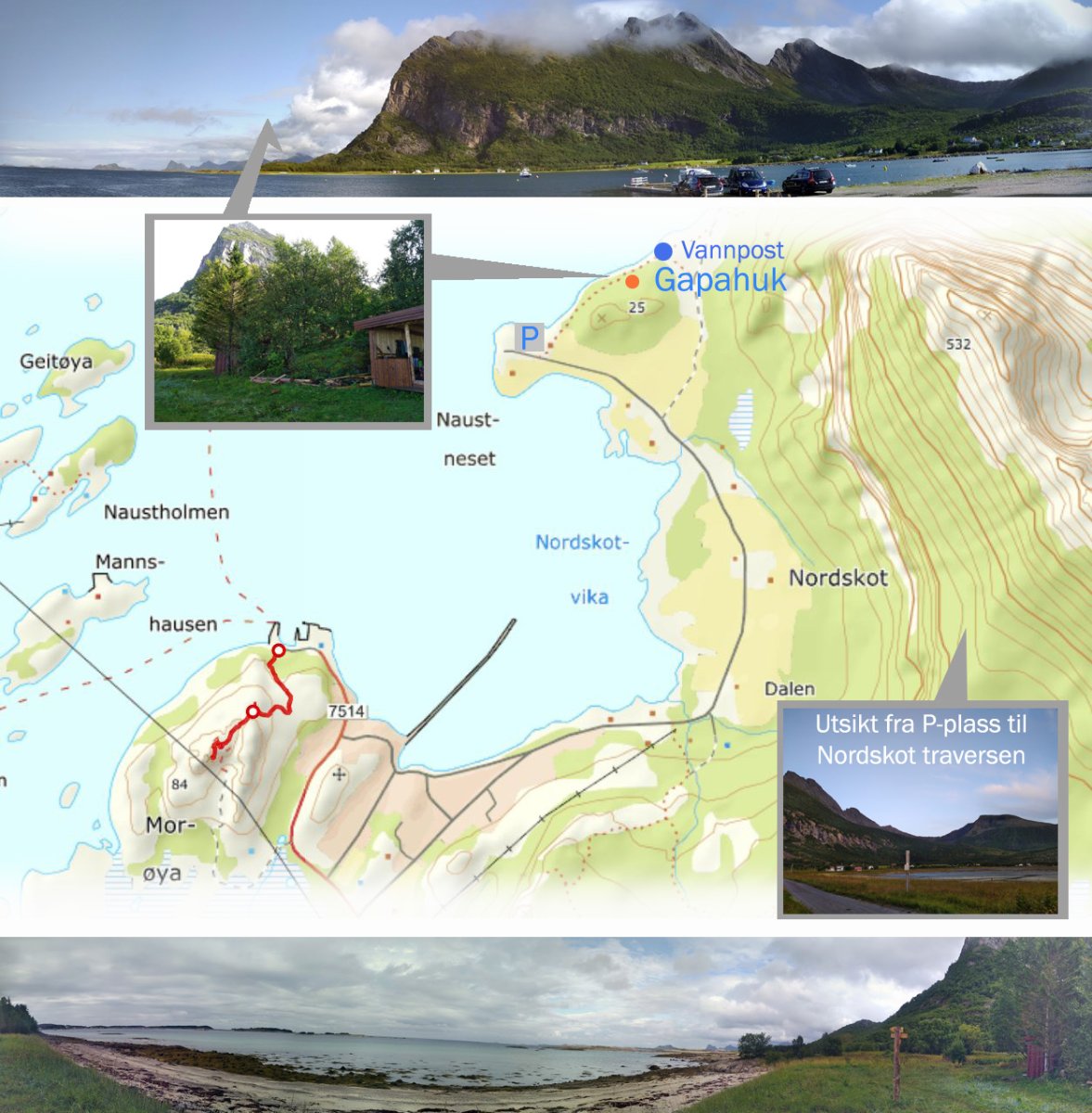 I Steigen, med utsikt til Lofotveggen, ligger en fin gapahuk med utedo og ildplass ved Nordskot. Vannpost noe bortenfor i graset nedenfor stidelet er det og. Satt opp av velforeningen der, hvor man kan slå opp telt mellom vandring i Skotstindan, eller slå seg ned på vei til hula i fjellet rett bak. P-plass ved naust på...Naustneset. Pass bare på å ikke parker på den åpne plassen utenfor. Landingsplass for helikopter. På andre siden av Nordskotvika ligger Nærbutikk, der hurtigbåten fra Bodø legger til, på vei over til Lofoten. Ouslands øy, Mannshausen, og Randi Skaugs Naustholmen ligger rett utenfor, med dertilhørende bekvemmeligheter og opplevelser. Flust av ørn å våkne til, og flott strand å sanke skall etter Sjømusa, når det er fjære. En perle, som jeg ved to omganger for et par år siden benyttet meg av i en liten uke tilsammen...(på bekostning av Rago-tur drøye to timer unna. Det sier jo litt!) Fikk denne rare følelsen av å ikke ville noe annet sted den siste gangen. Sikkert Sirener som sang.