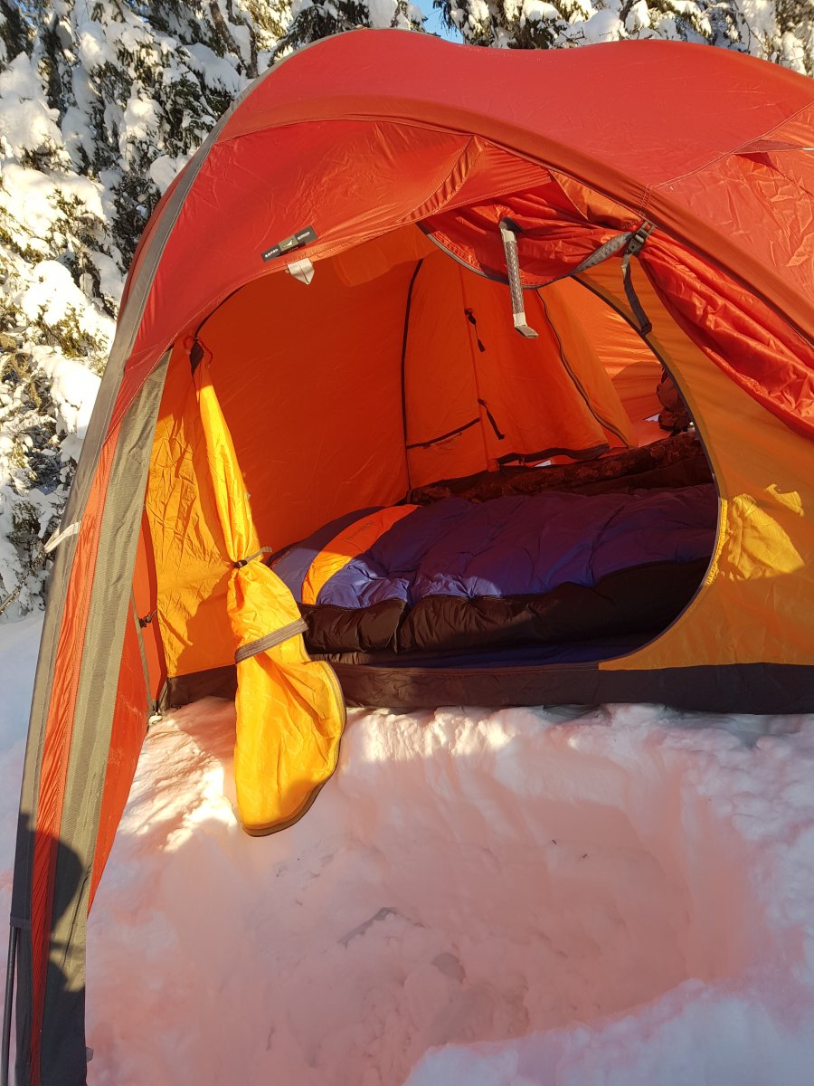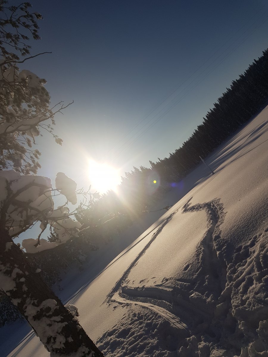 "Jeg kunne jo skrevet en liten turrapport på fjellforum da" - men den ble visst nokså lang Leses på eget ansvar! Lenge har jeg tenkt på en solotur på vinteren, men vært redd både for mørket, det å fryse og bruk av brenner i teltet. For noen uker siden ble jeg overraskende inspirert av noen flotte turdamer på Instagram, og bestemte meg for at nå fikk det bare briste eller bære. Turhelga ble valgt med bakgrunn i at mannen hadde arbeidshelg, og en stund så det ut til at det ikke skulle bli så altfor kaldt. Et par dager før avreise viste værmeldinga brått -16, og jeg ble derfor litt nervøs for om soveposen min med komfort på -12 ville gjøre susen. Jeg bestemte meg derfor for å sy en innerpose, i håp om at den skulle berge meg gjennom natta dersom det skulle bli for ille, i tillegg til at værmeldinga så litt mer lovende ut dagen før avreise. I dagene før avreise begynte det å hope seg opp med turutstyr i stua, og jeg var stadig ute i hagen for å øve med primusen. Da strømmen tilfeldigvis gikk en dag, fikk jeg til og med ordna meg med litt lunsj Turfeberen hadde for alvor satt inn, og jeg gleda meg som bare det! I tillegg til litt turinspirasjon, hadde jeg også sett noen kule oppskrifter på deilig "primus-pizza" og noen fristende bilder av sveler til frokost, så det ble med i matposen. Endelig kom dagen for avreise. Jeg hadde med meg alt jeg kunne komme til å trenge av utstyr, og litt ekstra for kosens skyld. For det var jo hele poenget - å kose seg på tur, alene for første gang Været var helt fantastisk, og vi starta morgenen med strålende sol. Pulken endte opp med å veie mer enn jeg hadde sett for meg, og de første kilometerne gikk vi i stigning. Det var nok tyngre for hunden enn for meg, og til slutt koblet jeg han av for at han skulle spare litt krefter. Jeg har tidligere vært plaga med gnagsår i fjellskiskoa mine, men i god tro tenkte jeg at dersom jeg satte på gnagsårplaster før jeg gikk ville det sikkert gå fint. Det gjorde det for det aller meste også, men da jeg nærmet meg dagens første stopp kjente jeg at det begynte å bli sårt i skoen. Det passet derfor ypperlig med en stopp på Heggelia, hvor vi ble tatt så godt i mot - selvsagt skulle hunden få være med inn Dermed fikk jeg justert på gnagsårene, spist litt og hunden varmet seg foran peisen. Jeg ble likevel litt engstelig da verten kunne fortelle at det hadde vært -18 da han hadde åpnet i solskinnet samme morgen. Han syntes derfor at det var veldig tøft å skulle ligge ute i telt, og inni meg tenkte jeg at det kanskje kom til å bli i tøffeste laget! Vi kom oss avgårde igjen, og en drøy kilometer senere fant vi oss en flott teltplass ved et lite vann. Betjeningen på Heggelia hadde opplyst om at det blåste surt fra nord, så jeg forsøkte å finne en fin plass i ly. Da oppdaget jeg også at kartet og kompasset lå igjen hjemme..... Teltplassen kom på plass likevel Senere på kvelden angret jeg på at jeg hadde spadd ut forteltet, da teltet plutselig hadde flyttet seg 15 cm den veien, og soveposen min hang i fritt fall Heldigvis var den nokså enkelt å dra teltet en liten halvmeter andre veien, i og med at det er selvstående. Etter at teltet hadde kommet på plass, var det på tide å fyre bål med all veden som jeg hadde drasset med meg ei mil inn i skauen (!!) Jeg tenkte at det var greit å grave bålplassen ned, slik at bålet ikke skulle forsvinne i snøen. Lite ante jeg at snøen var like dyp som jeg er høy, og derfor gravde jeg nokså lenge for å få en fin plass Hunden var lagt til rette, og endelig kom det deilig varme fra bålet. Sola begynte å gå ned, og det samme gjorde temperaturen! Det jeg hadde glemt var hvor redd hunden min er for bål, og det ble derfor altfor "intimt" nede i ei slik grop - den fikk brått panikk, pila inn i teltet og nektet å komme ut igjen. Så da satt jeg der da, mutters alene i kulda og fyra bål. "Kose-faktoren" sank i takt med sola, og etter å ha forsøkt å få ned litt bålniste, kom jeg meg inn i teltet jeg også. Da jeg landet i soveposen begynte det å synke inn hvor langt jeg hadde gått, hvor lite mat og drikke jeg hadde fått i meg, og at telefonen min så ut til å dø av kulde raskere enn jeg hadde sett for meg. Før jeg skulle fyre i teltet hadde jeg planlagt å lage middag, så jeg begynte med det. Pizzadeig ble laget, og diverse garnityr funnet frem. Men så, tenkte jeg at det hadde jo vært lurt å fylle primusflaska med brennstoff før jeg skulle i teltet for kvelden. Men hvordan var det nå jeg fikk ut trykket igjen? Herregud som jeg kløna! Bensin overalt, kalde fingre og en rekke banneord... Banneorda skulle nok mest kompensere for at jeg begynte å bli litt stressa - tenk om jeg ikke fikk liv i primusen igjen? Til og med bikkja hadde begynt å hutre på dette tidspunktet. Liv ble det heldigvis i primusen, og noen likfingere senere ble det også pizza! I tillegg skapte jeg også et minne for livet - da jeg underveis i matlagingen brant meg på litt kakao jeg akkurat hadde laget, og bare skulle ta litt snø i munnen for å kjøle ned den brente tunga. Lite tenkte jeg på at jeg tok fra samme snøen som jeg akkurat hadde dynket med bensin Det smakte rett og slett alt annet enn nydelig!! Pizzaen var god, men samtidig smakte det ikke med mat. Et sikkert tegn til meg selv om at jeg hadde ventet for lenge med å spise! Etter mye om og men fikk jeg også primusen inn i teltet, og bikkja sluttet å hutre. Det var deilig med varme i teltet, men samtidig var jeg utrolig utilpass. I boka jeg hadde med meg, leste jeg den samme siden ganske mange ganger mens jeg fulgte med på brenneren. Til slutt klarte jeg heller ikke å holde meg lenger, og måtte bite i det "kalde" eple for å ut på do. Der kom likevel bålgropa til sin rett, for den var perfekt å gjemme seg i for å tisse når man er over snittet mørkeredd Vel tilbake i teltet spiste jeg litt frossent smågodt, og til slutt tok både hunden og jeg kvelden. I l